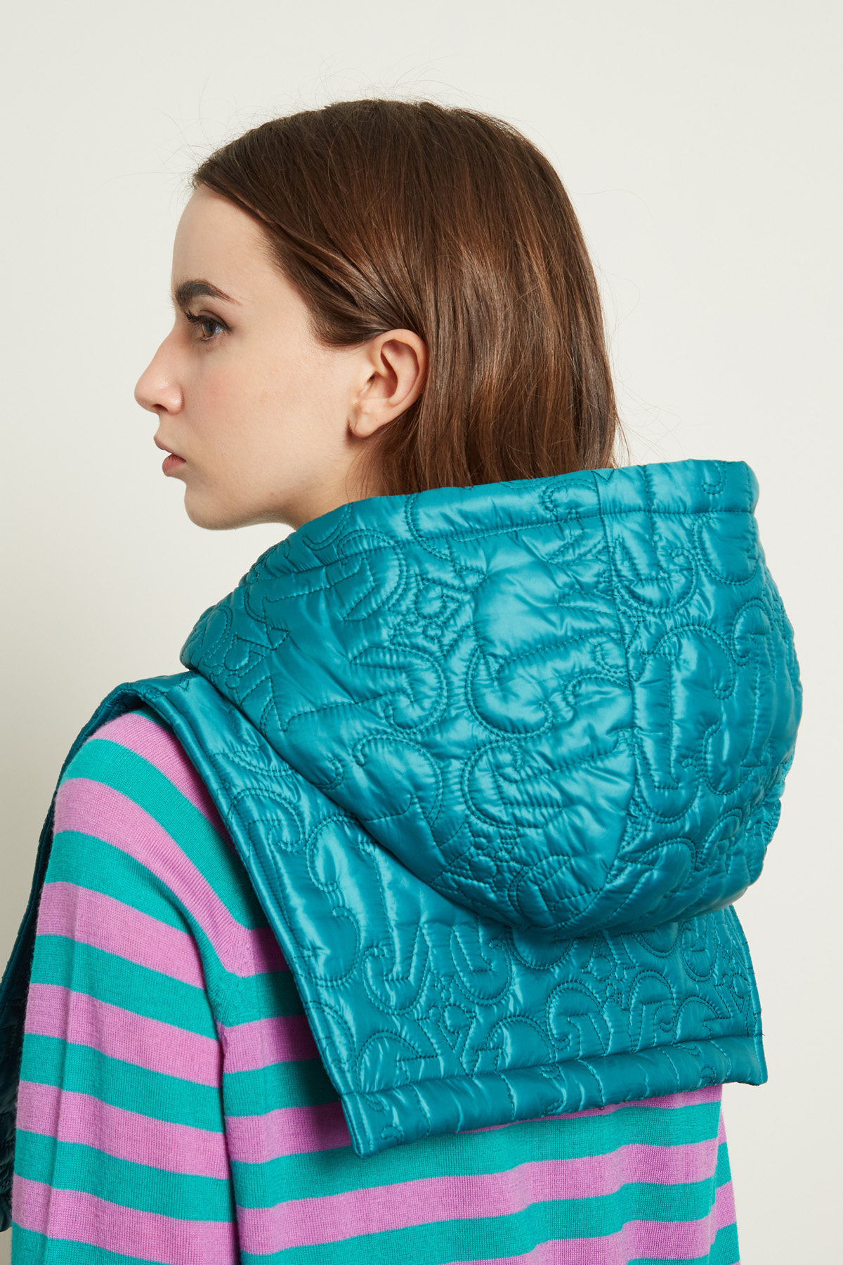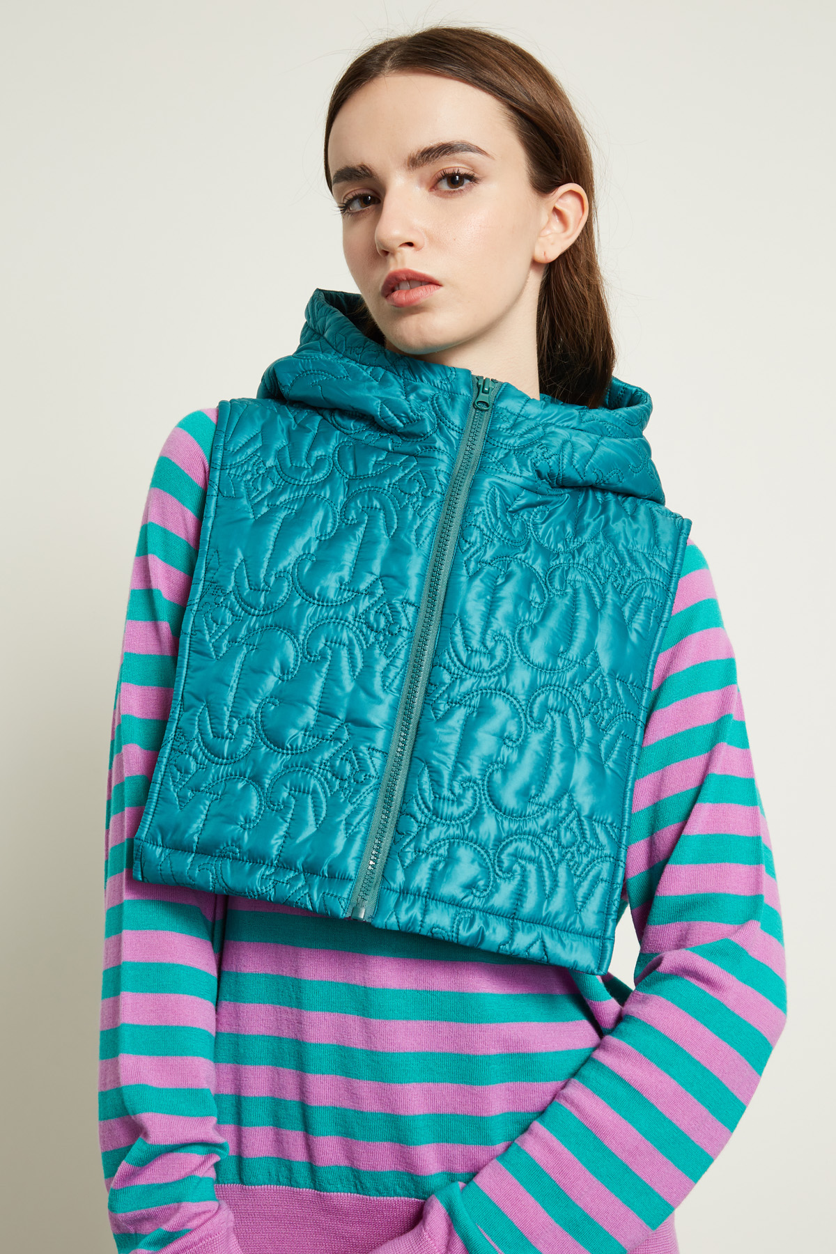 Collo imbottito realizzato in tessuto tecnico trapuntato, con cappuccio e allacciatura tramite zip.