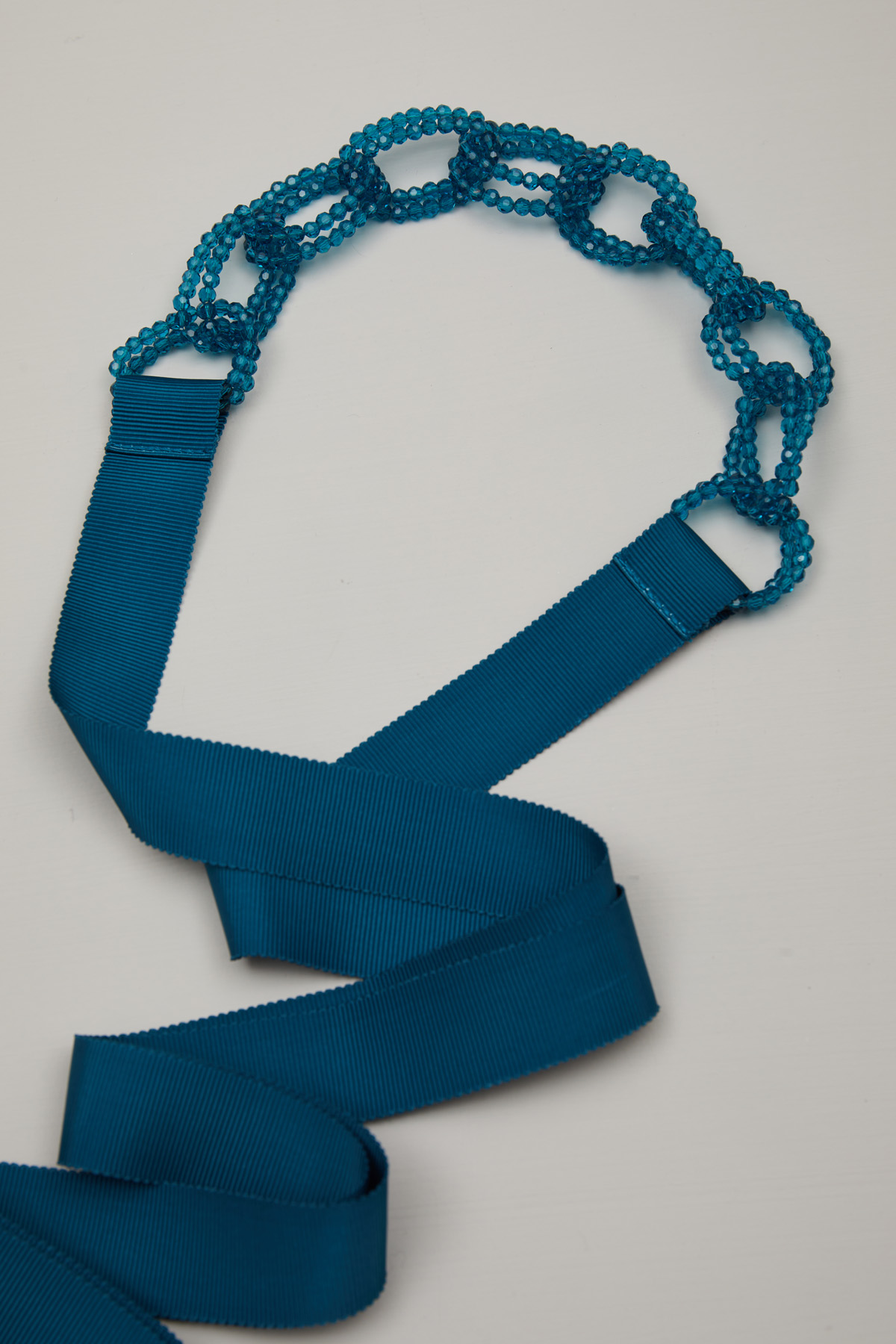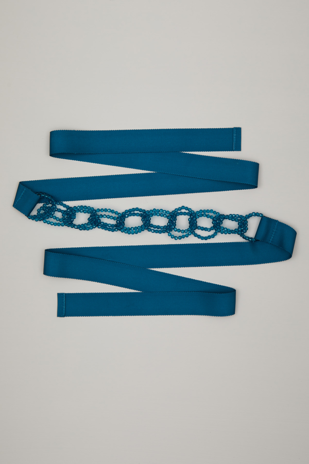 Cintura a nastro realizzata in gros grain con dettaglio di catena realizzata a perline. Chiusura tramite nodo.