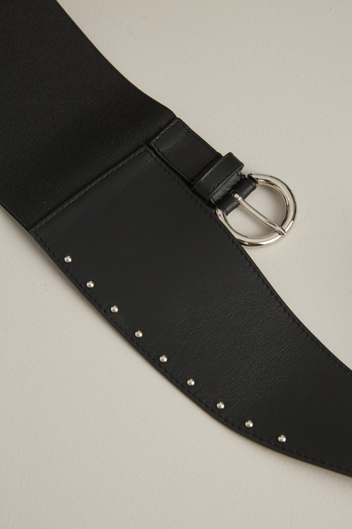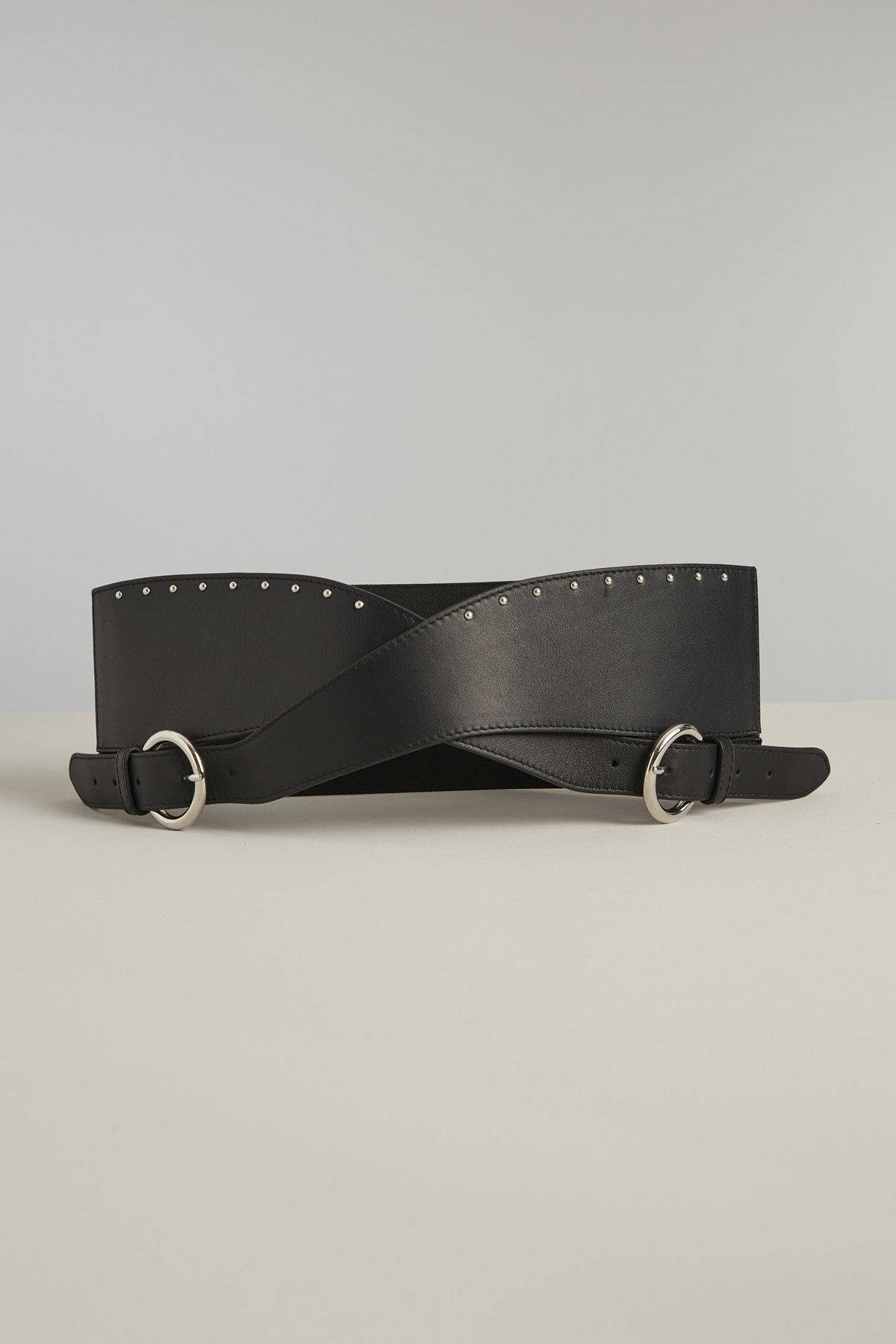 Cintura realizzata in vera pelle con inserto elastico nel retro, motivo di borchie applicate e chiusura incrociata tramite doppia fibbia ad anello in metallo.