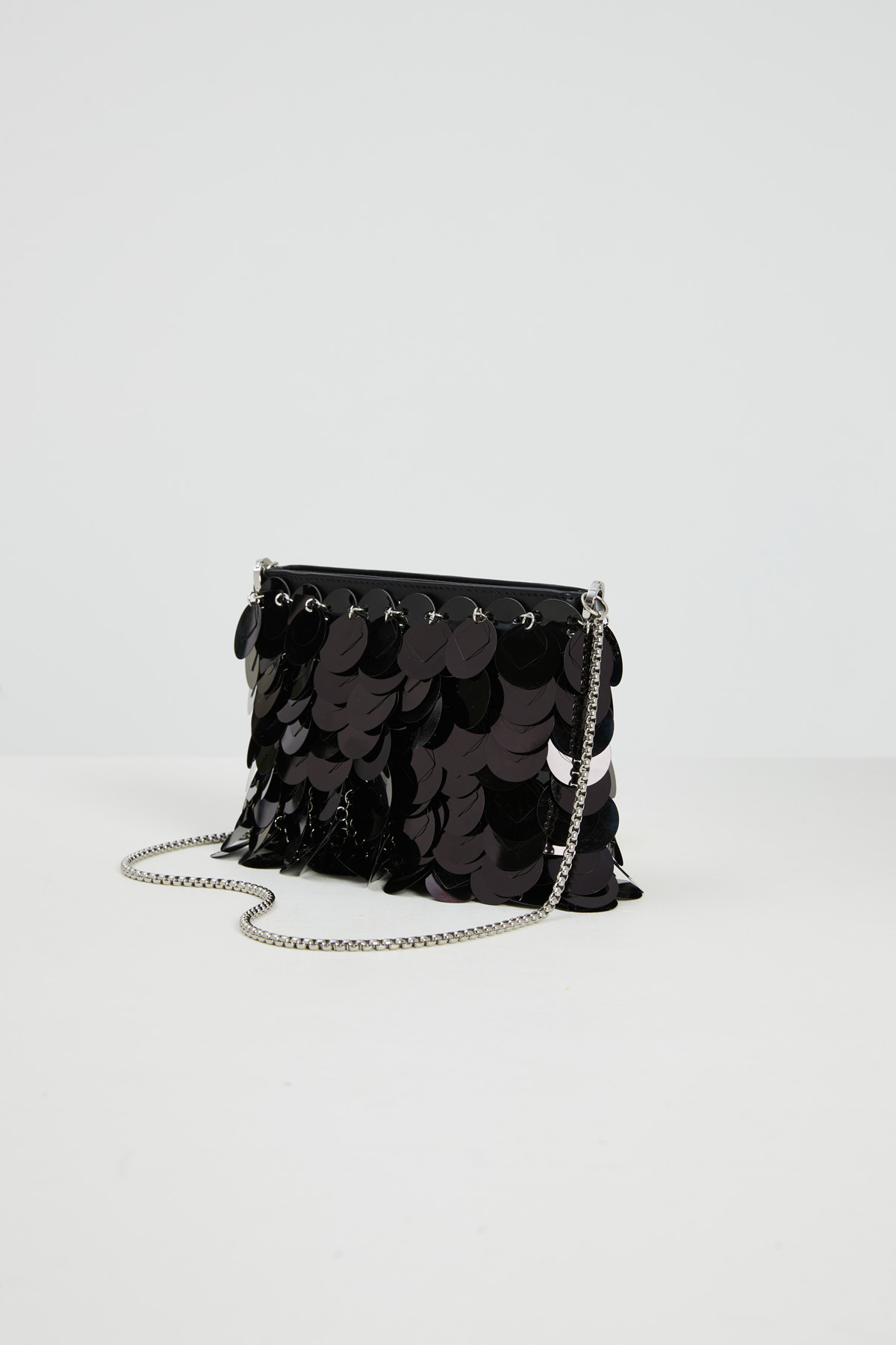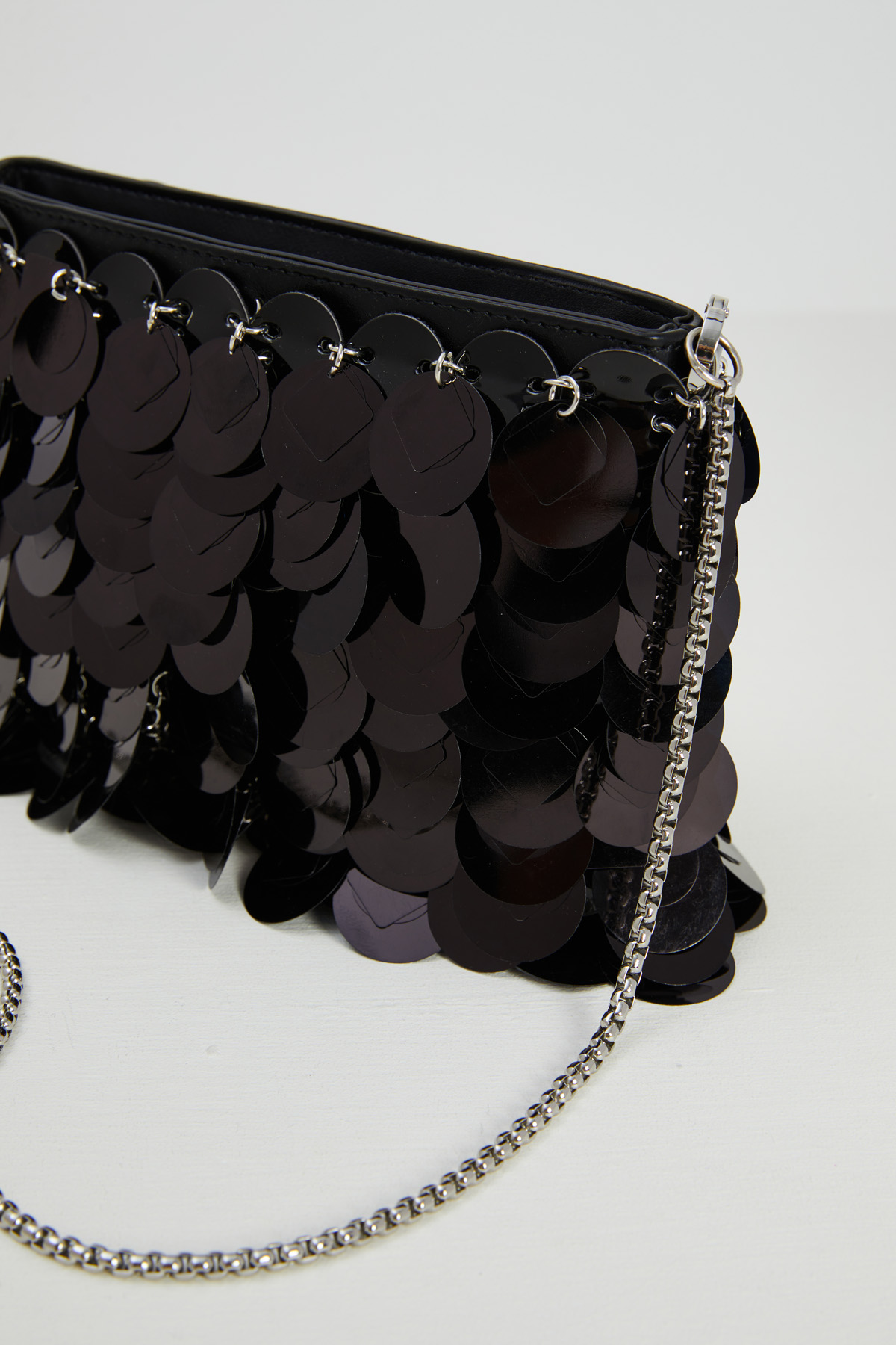 Borsa realizzata in similpelle ricoperta con maxi paillettes ricamate, tracolla a catena rimovibile e interno foderato con taschino. Chiusura tramite zip metallica.