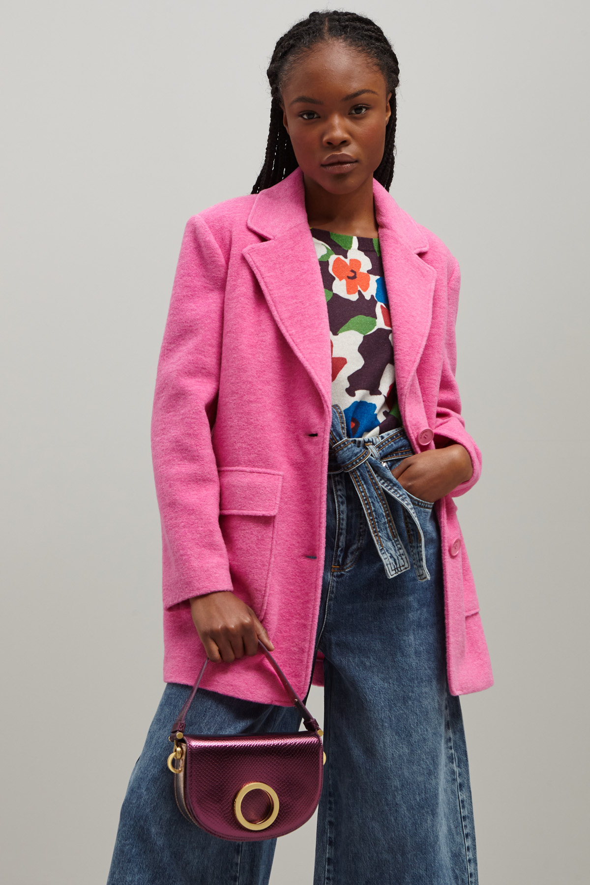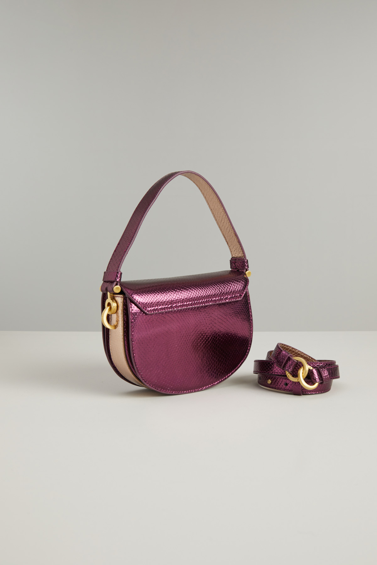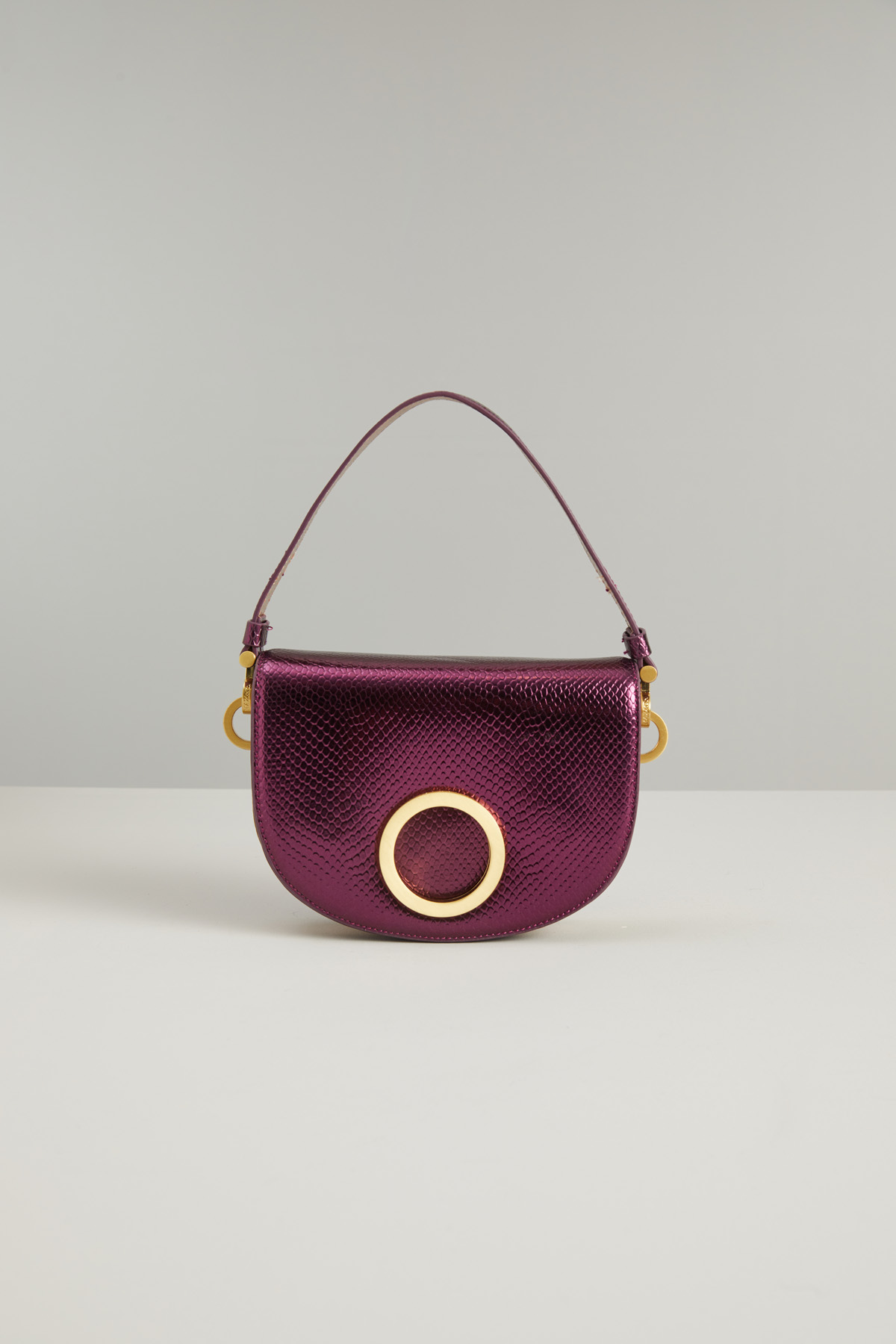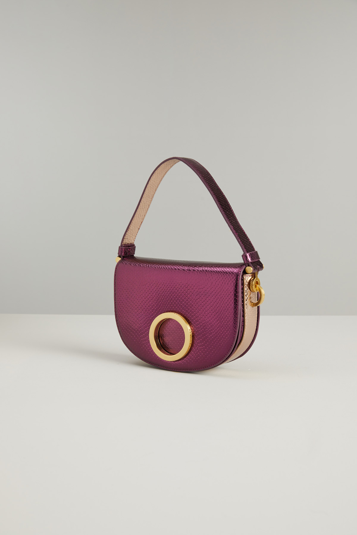 Borsa a mezza luna realizzata in vera pelle con stampa pitone e dettaglio circolare in metallo sulla patta, manico a mano e tracolla rimovibile. Interno a tre scomparti foderato in suede con taschino. Chiusura tramite bottoni automatici.