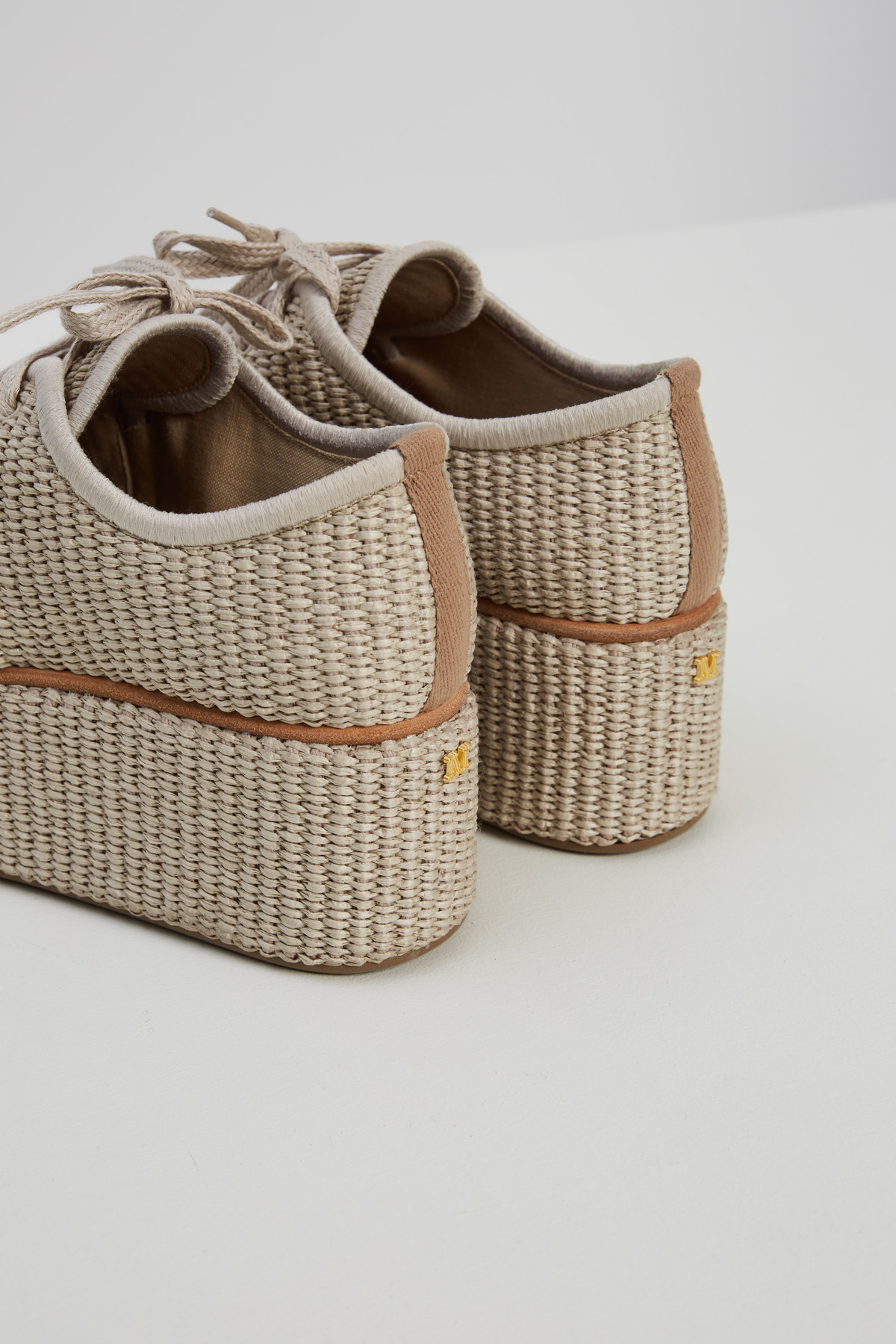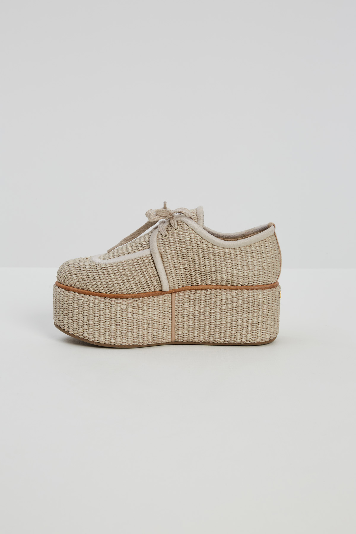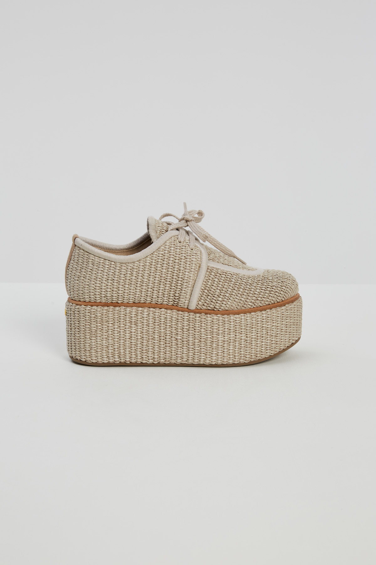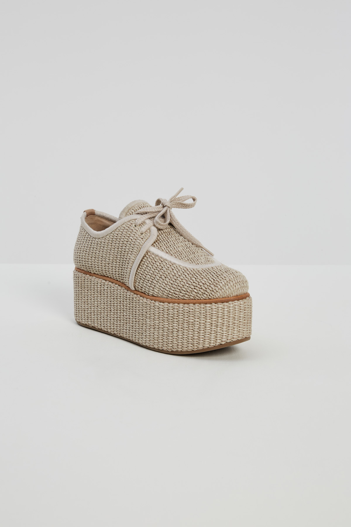 Scarpe stringate realizzate in tessuto di misto cotone effetto rafia intrecciata, con punta arrotondata e suola platform. Chiusura tramite lacci. Fodera in lino e suola in gomma.
