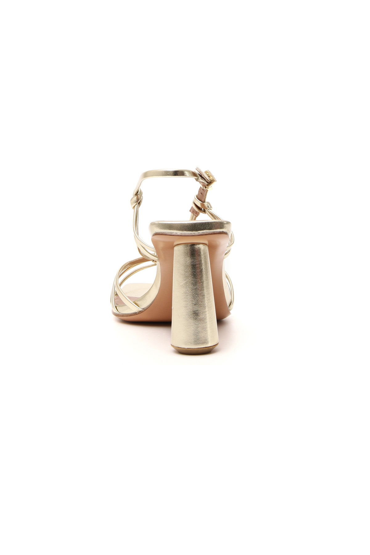 Sandali realizzati in similpelle laminata, con listini, dettaglio di nodo sulla fascia e tacco geometrico. Chiusura tramite cinturino alla caviglia. Fodera in pelle, suola in cuoio.