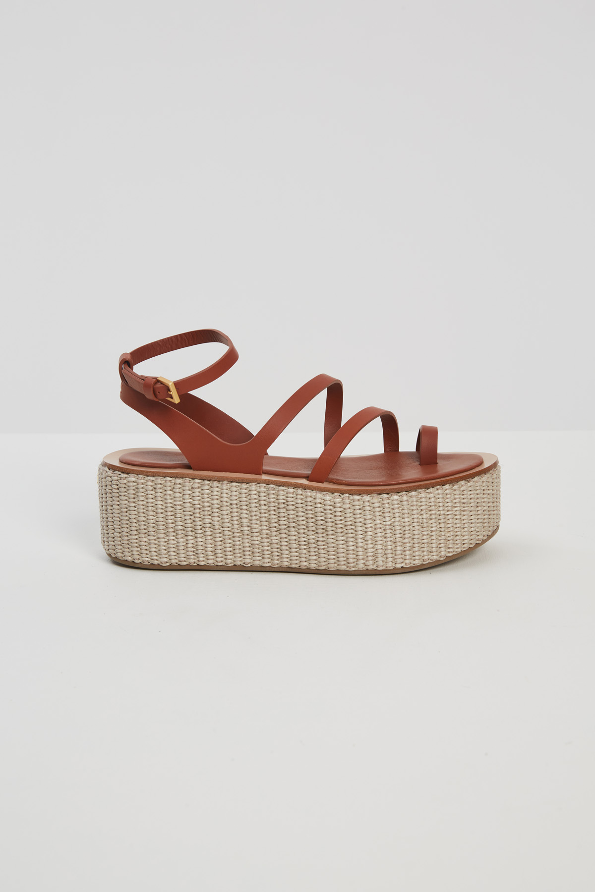 Sandali con zeppa realizzati in vera pelle, con inserti in rafia intrecciata, listini e cinturino alla caviglia. Suola in gomma.