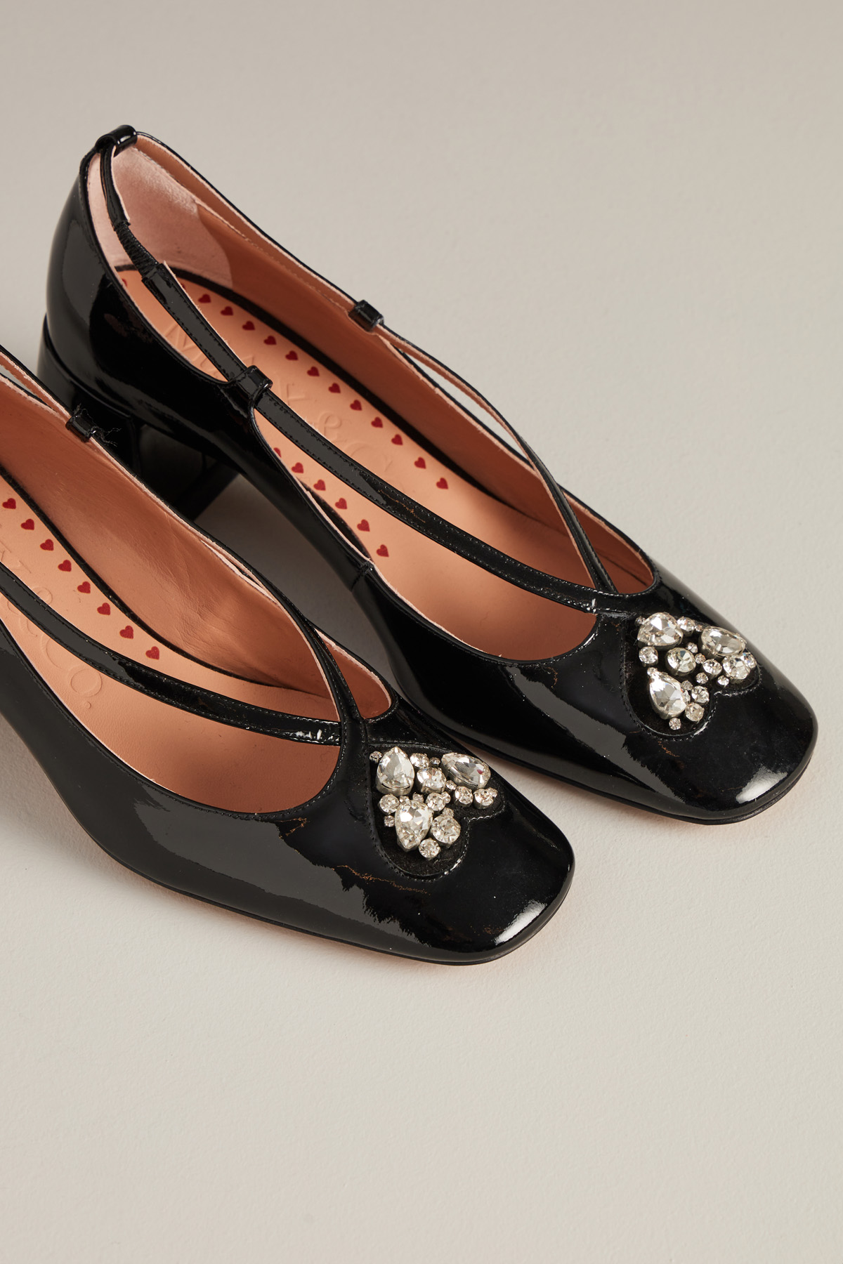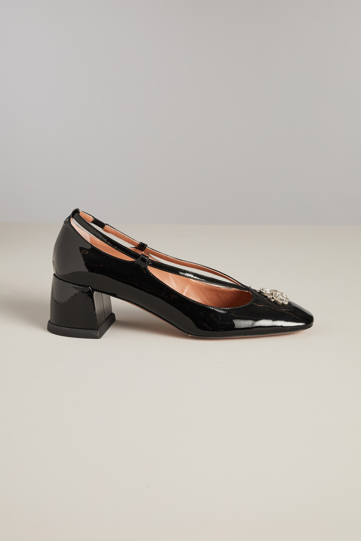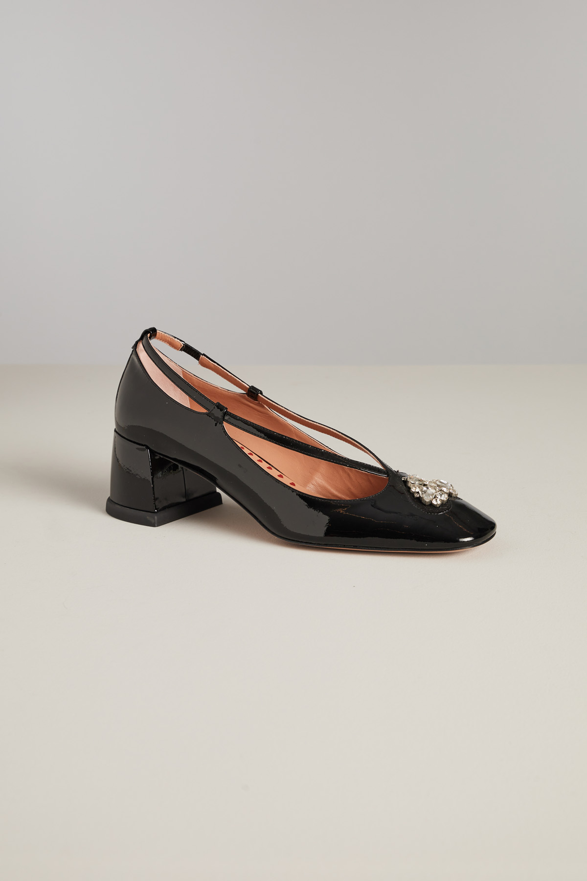 Dècolletè realizzate in vera pelle effetto vernice con punta squadrata, dettaglio maxi strass, tacco largo e suola in cuoio.