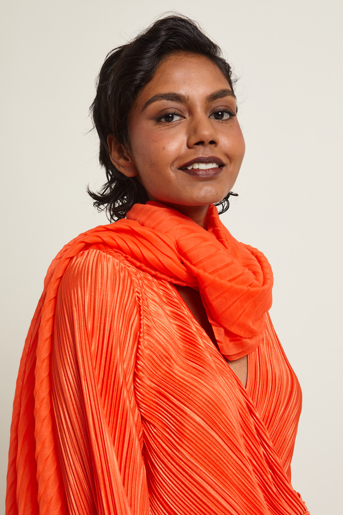 Stola realizzata in garza fluida con lavorazione a plissé diagonali.