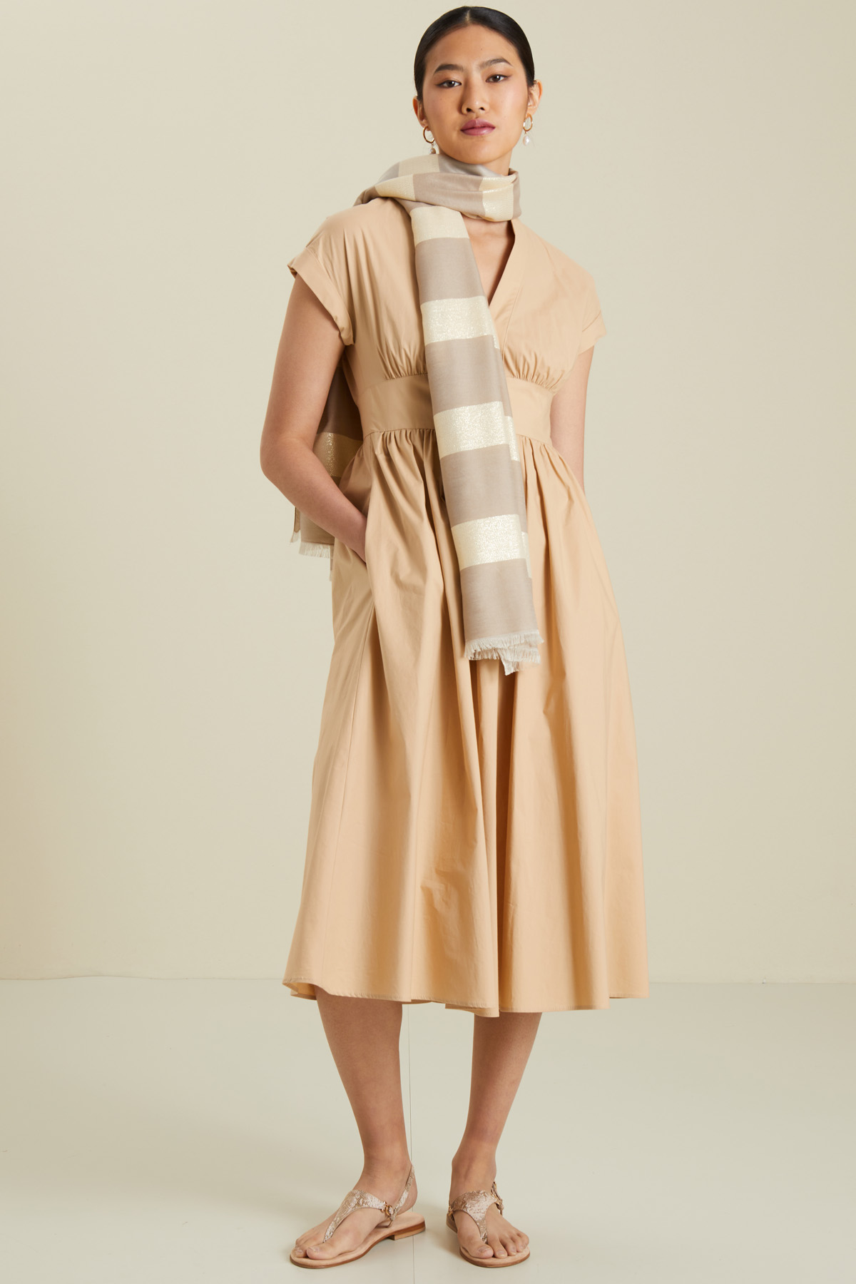 Sciarpa realizzata in tela tinto filo, con inserto in fibra lamè e bordi sfrangiati.