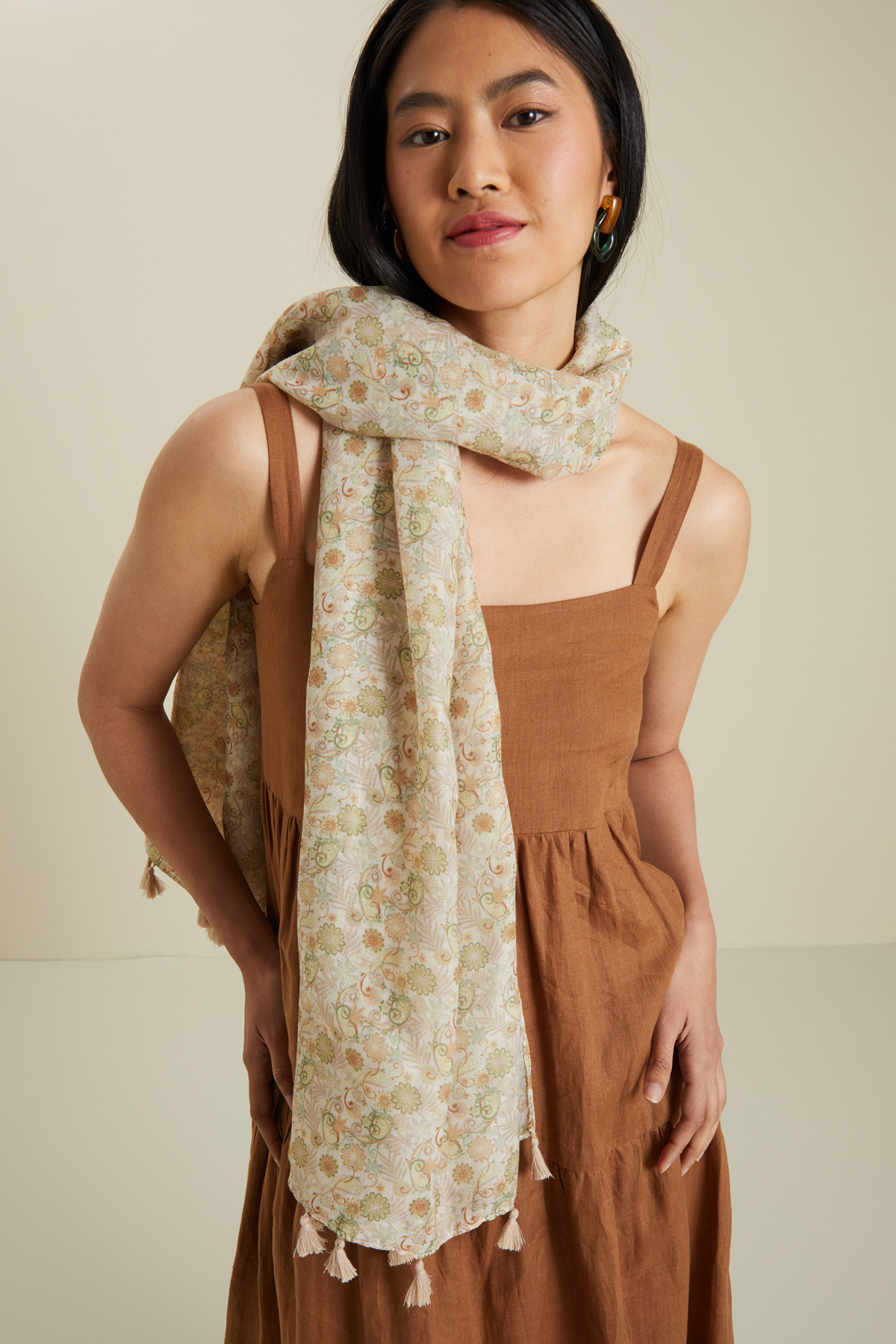 Sciarpa realizzata in tela stampata con motivo di nappine ai bordi.