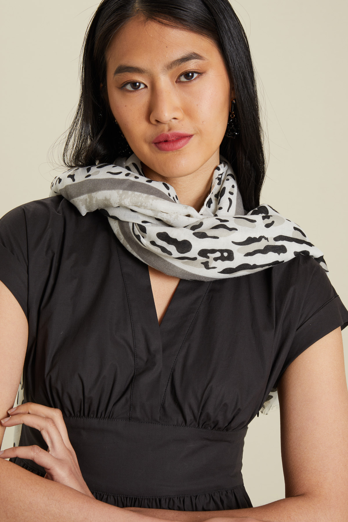 Sciarpa realizzata in tela stampata con bordi sfrangiati.