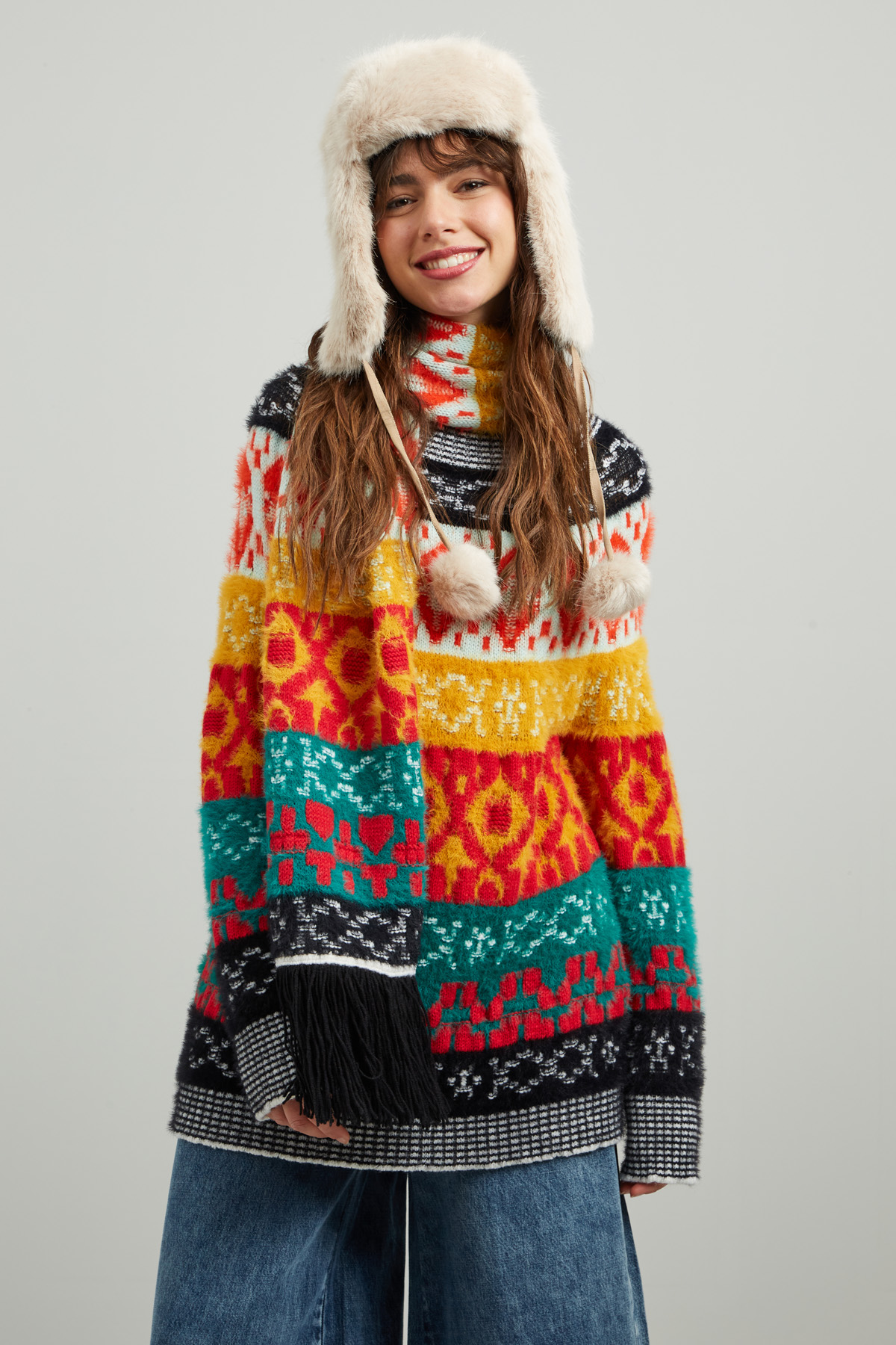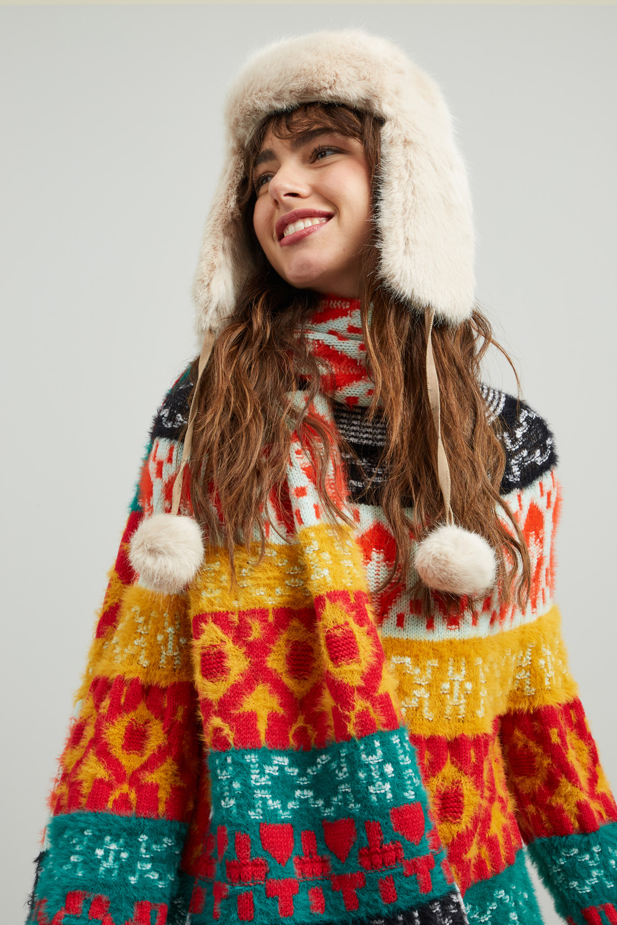 Cappello paraorecchie realizzato in tessuto effetto pelliccia con nastri e pon pon alle estremità.