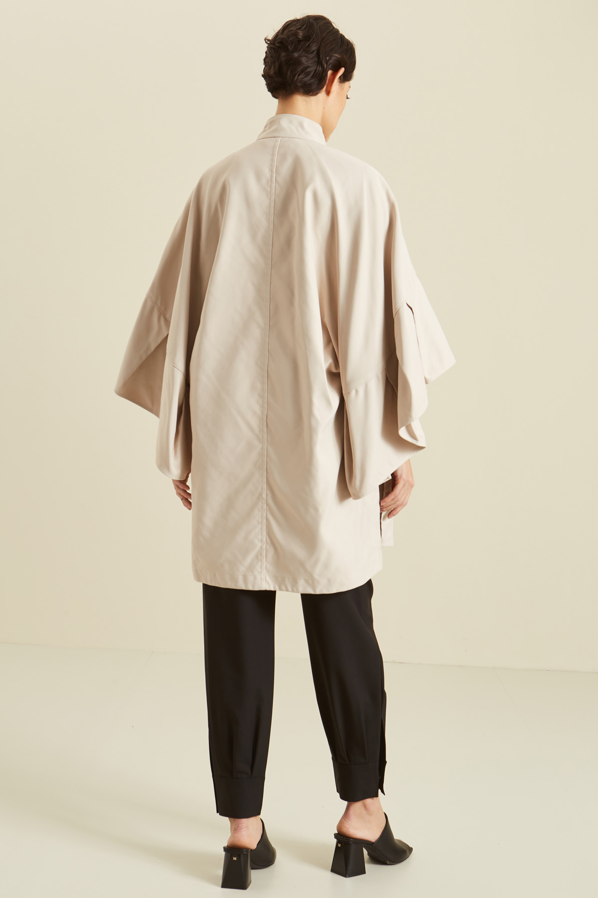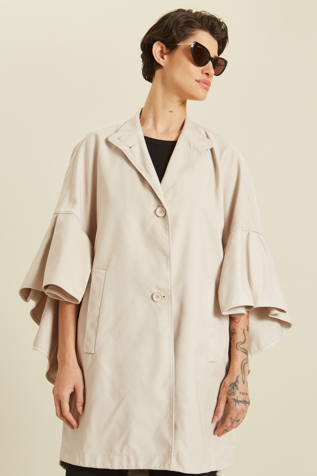 Mantella dalla linea ampia realizzata in doppia duchesse, con collo montante, rouches applicate sull'apertura delle maniche, bottoni laterali, tasche a filetto e chiusura a bottoni.
