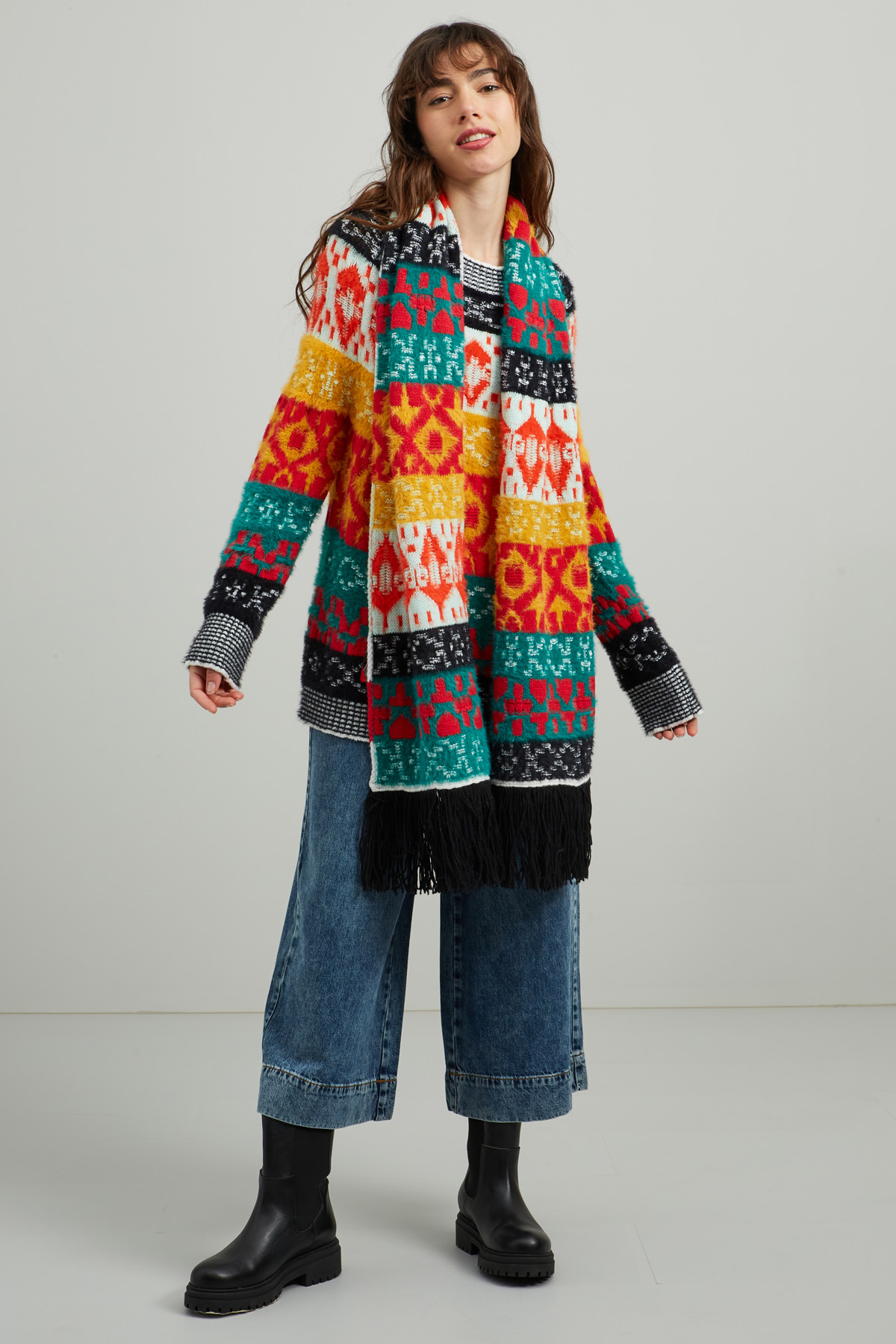 Sciarpa realizzata in maglia di misto lana con lavorazione jacquard e frange ai bordi.