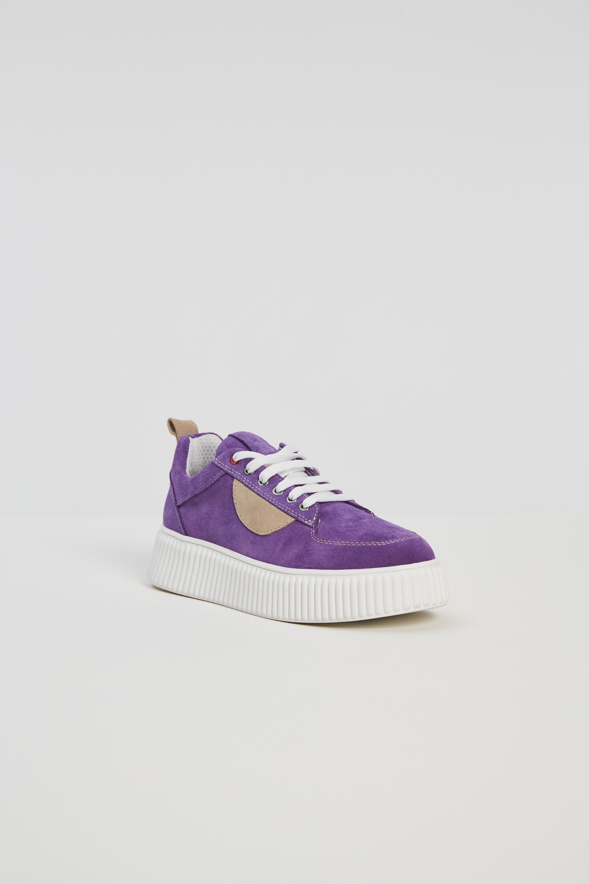 Sneakers realizzate in vera pelle scamosciata con punta arrotondata e chiusura tramite lacci. Suola alta in gomma.