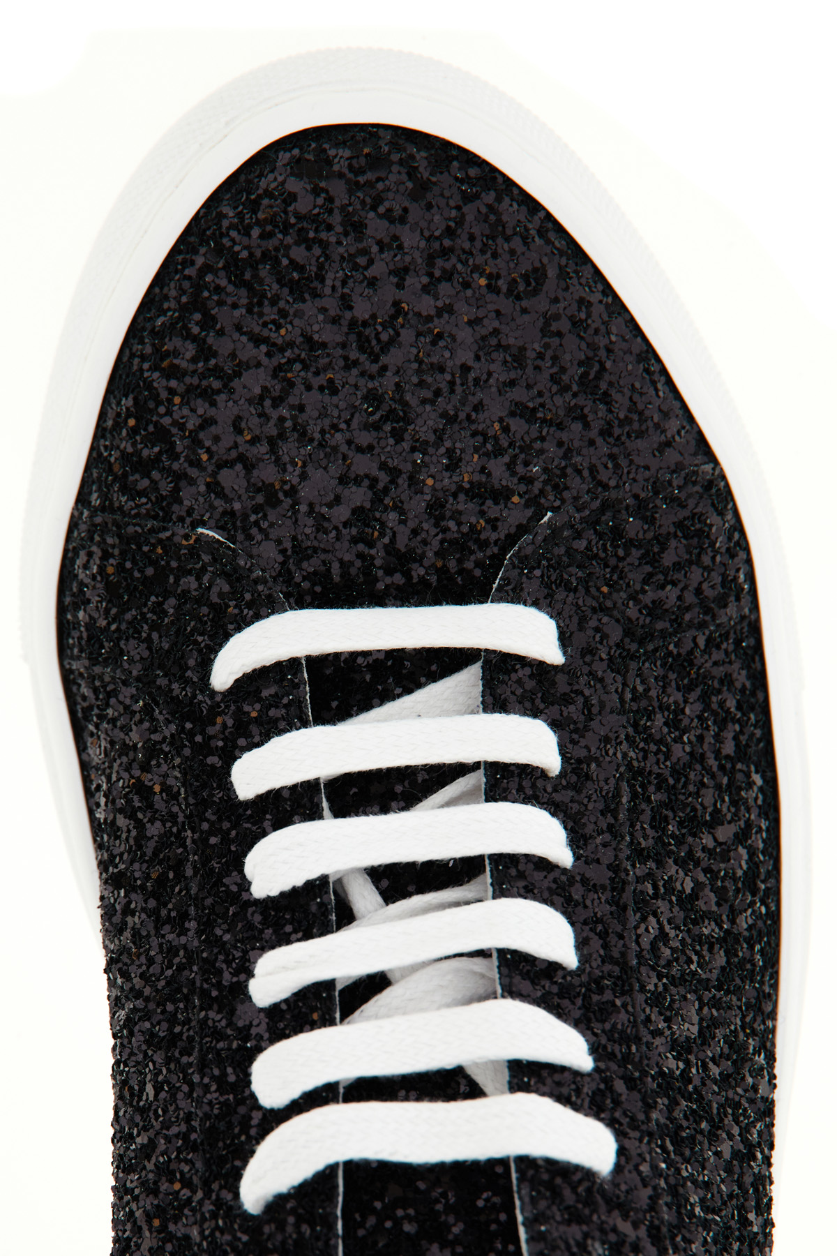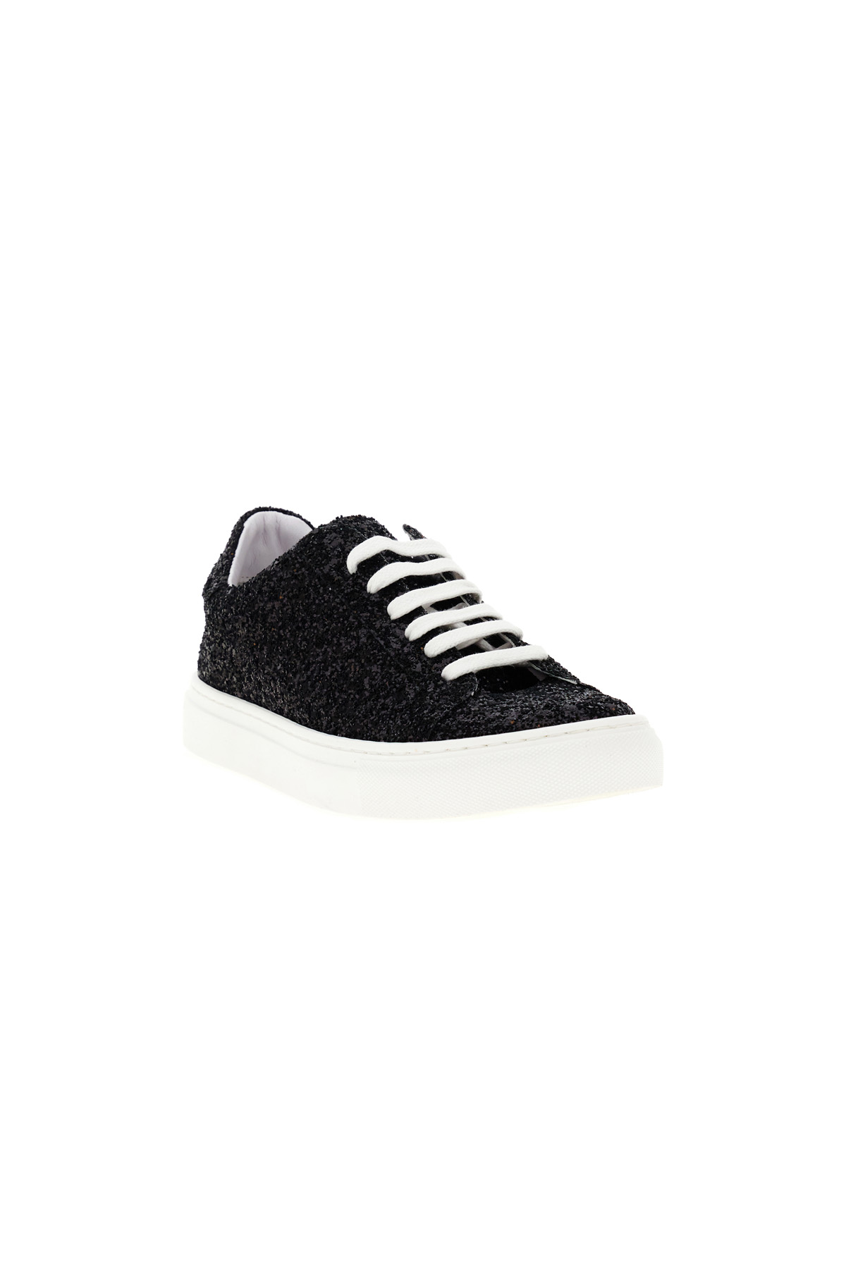 Sneakers realzzate in tessuto ricorperto di glitter, con lacci e suola a contrasto. Fodera in pelle e suola in gomma.