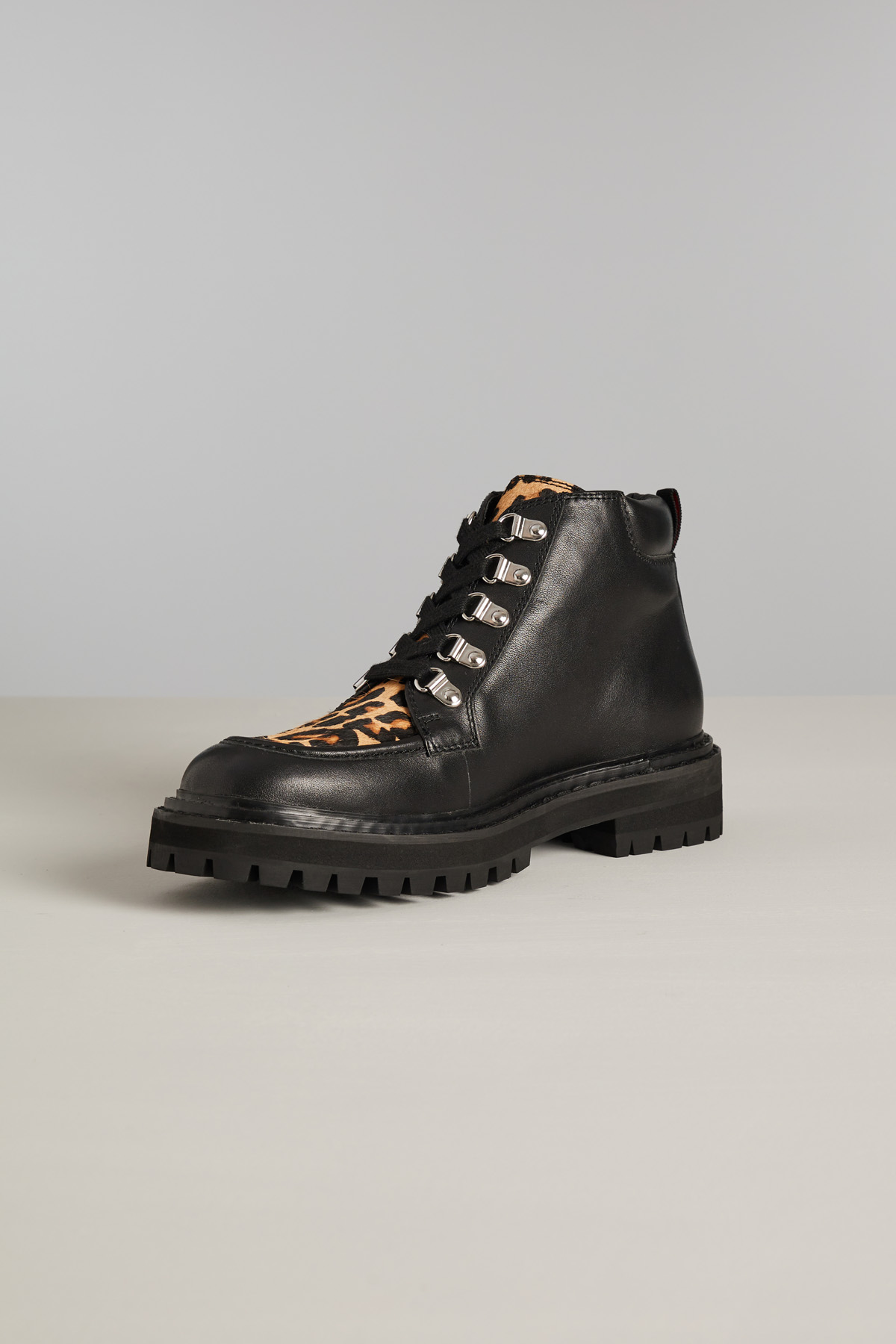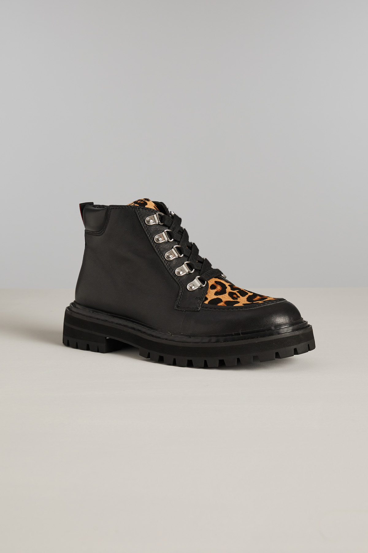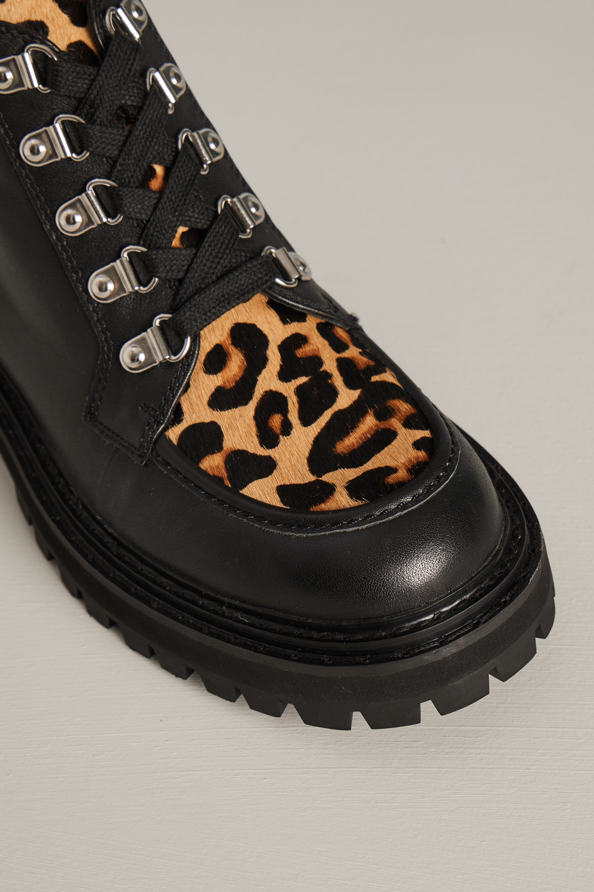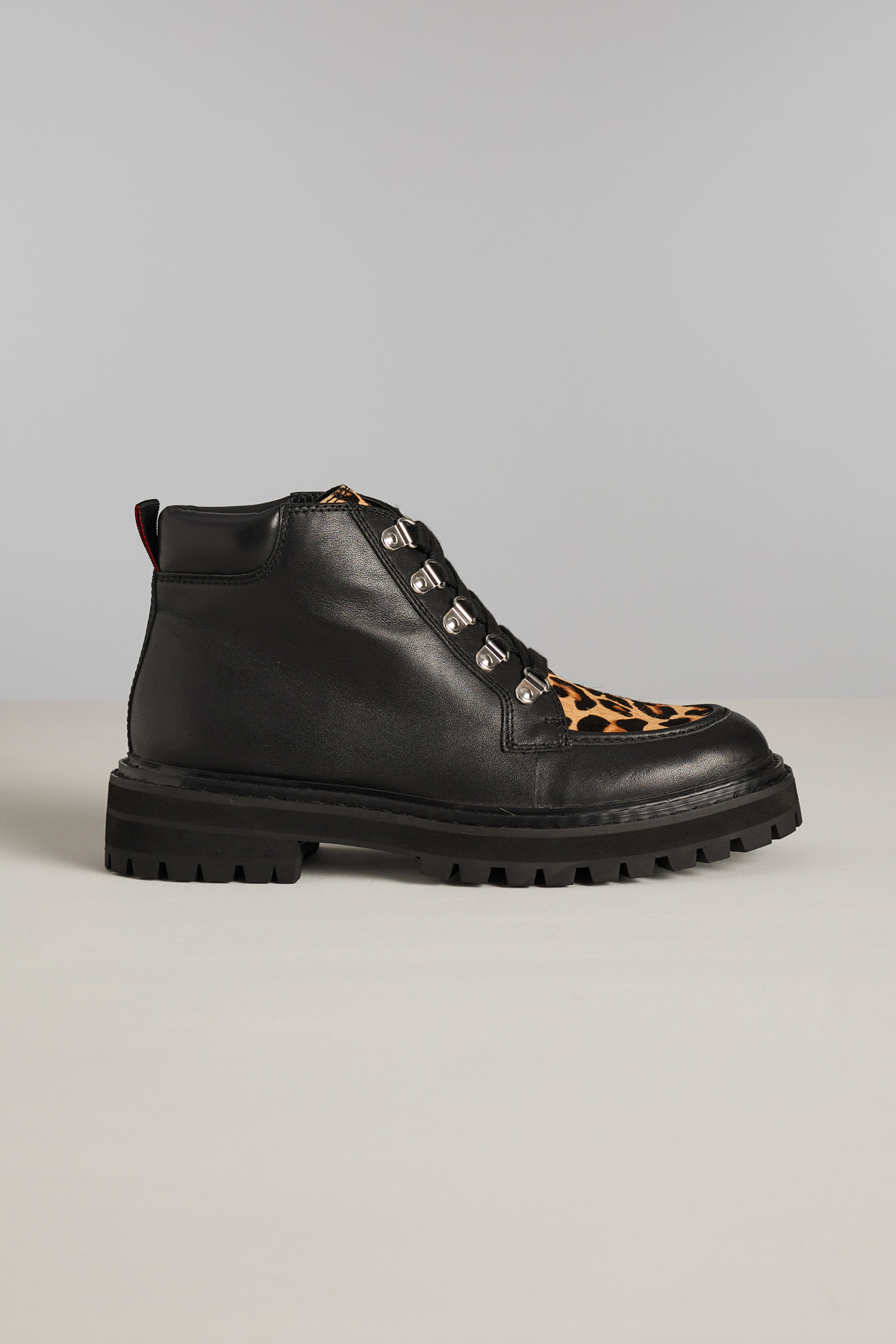 Anfibi realizzati in vera pelle con dettaglio in pelliccia e chiusura tramite lacci.