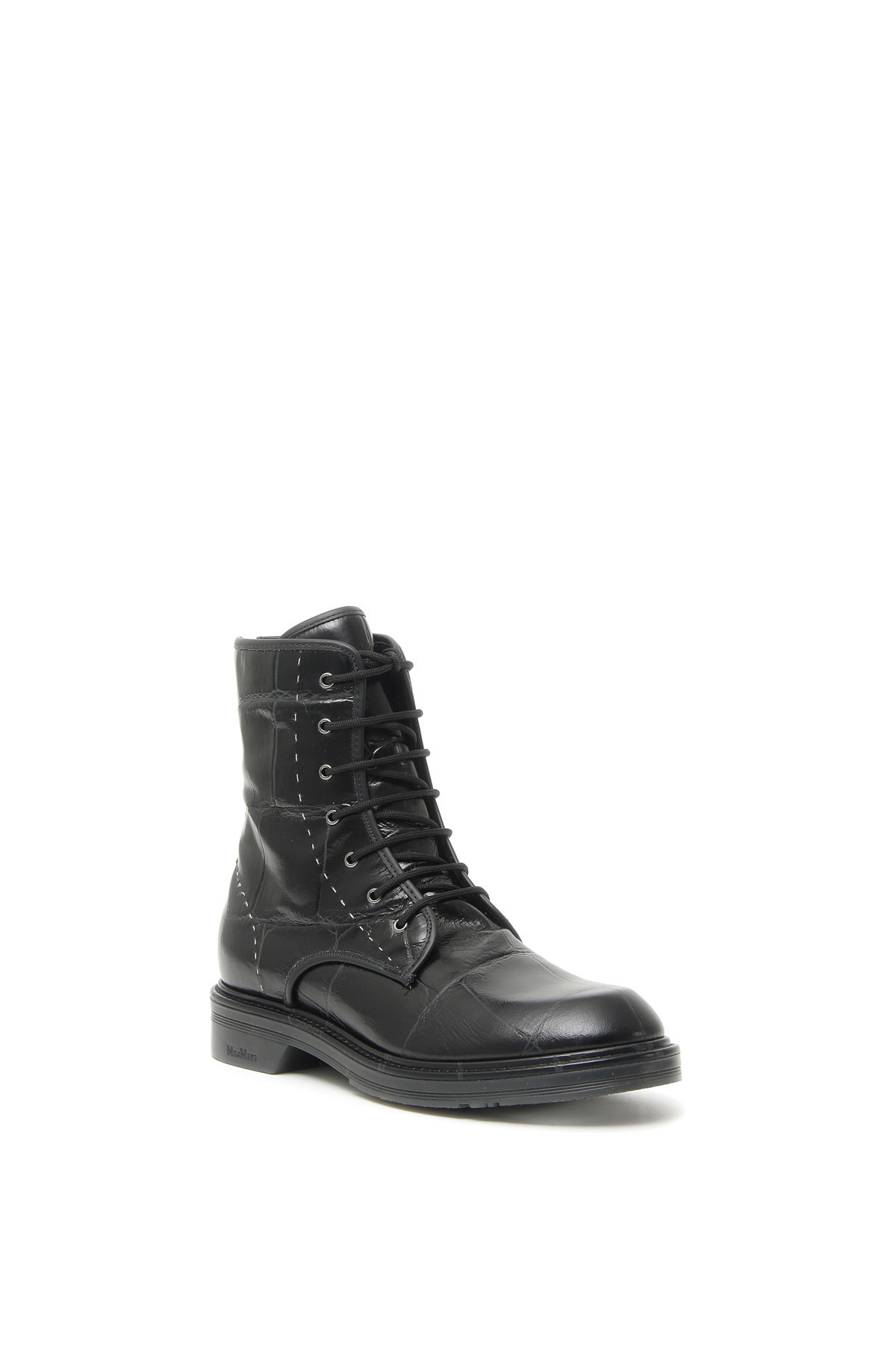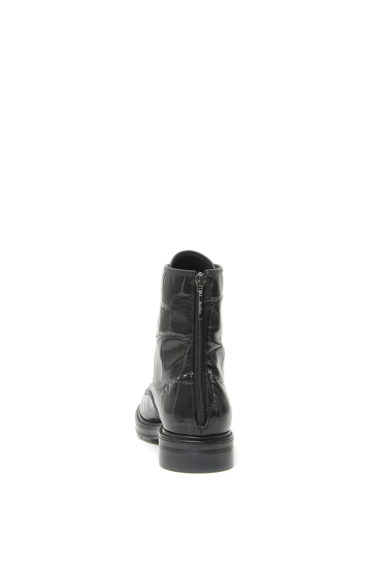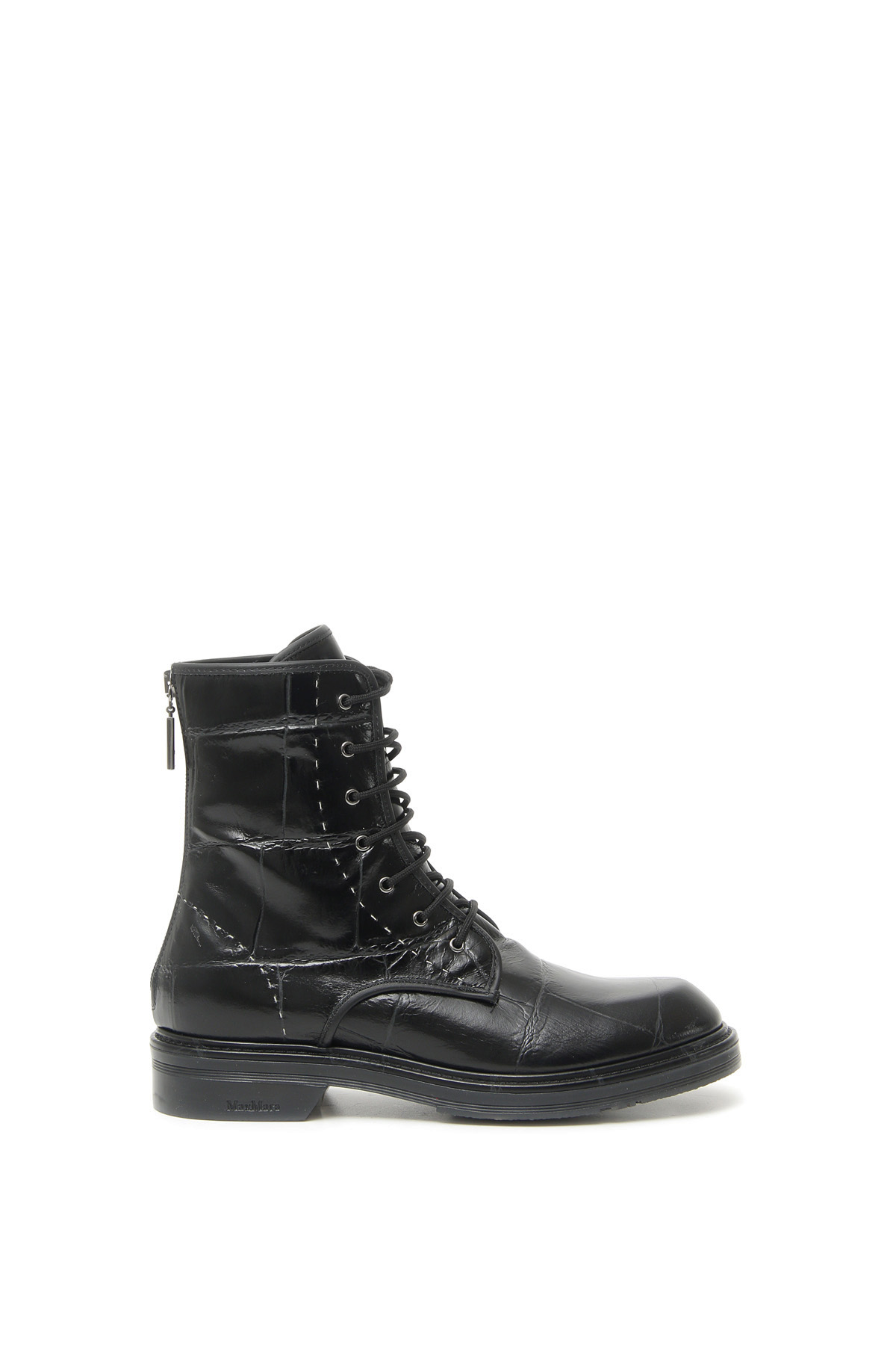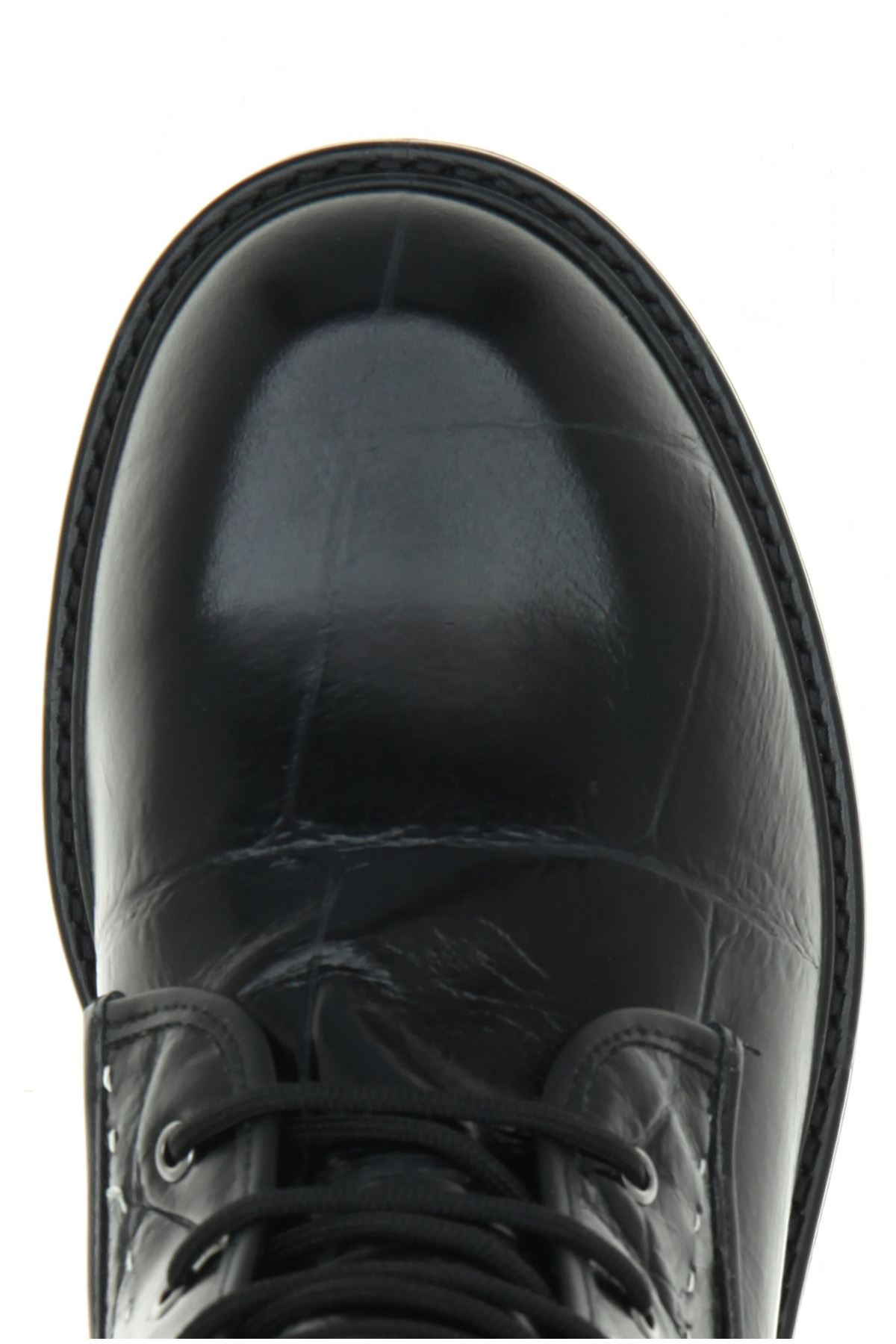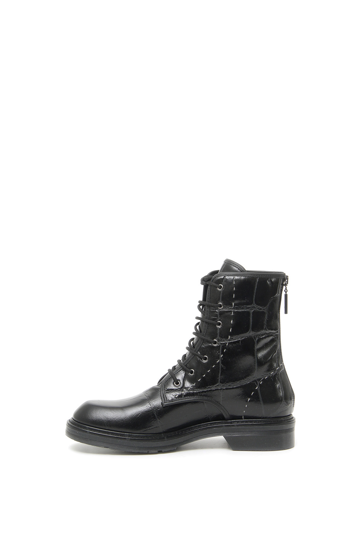 Anfibi realizzati in vera pelle stampa cocco, con rifinitura a puntino, chiusura con zip metallica nel retro e stringhe tubolari. Fodera in pelle, suola in gomma.