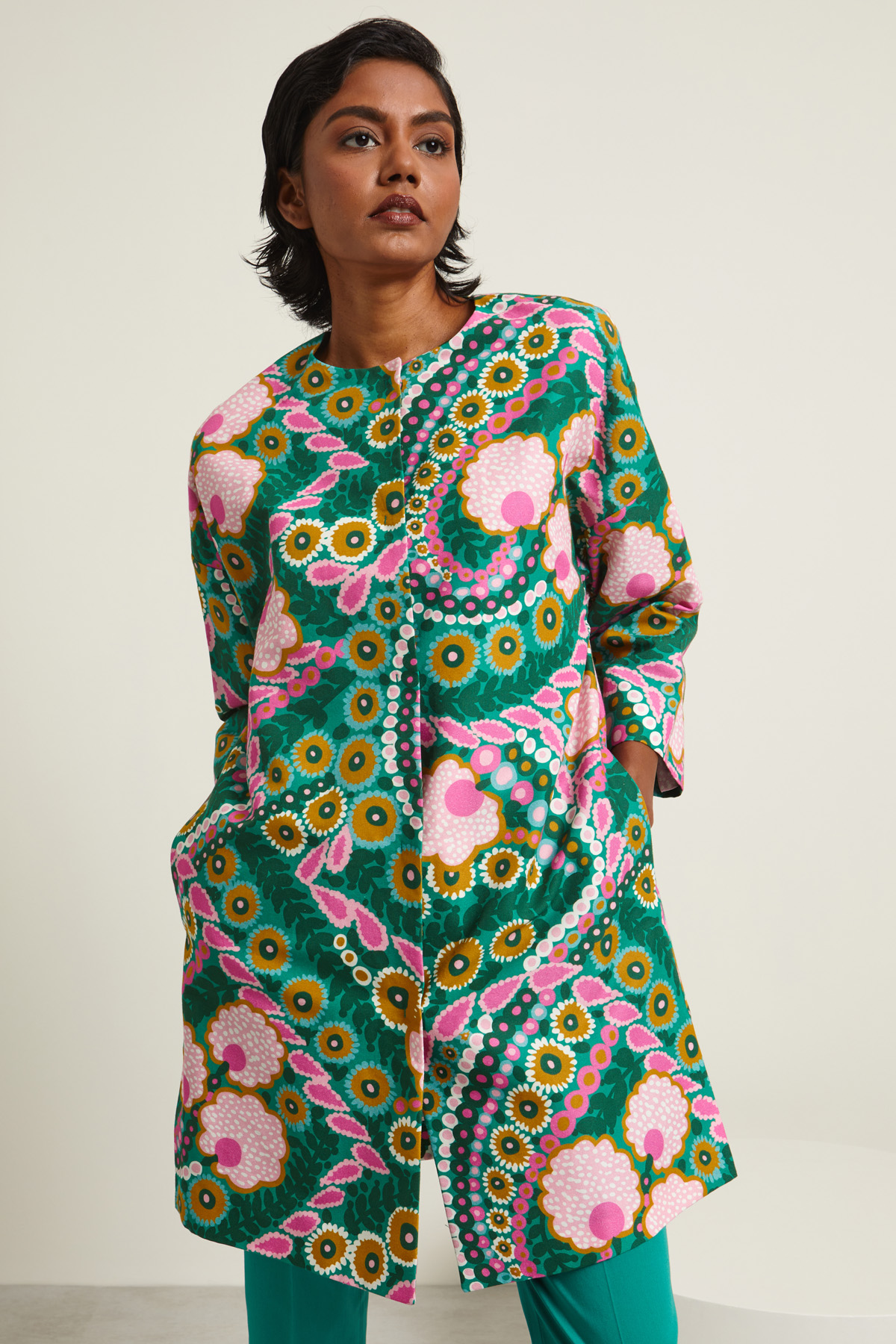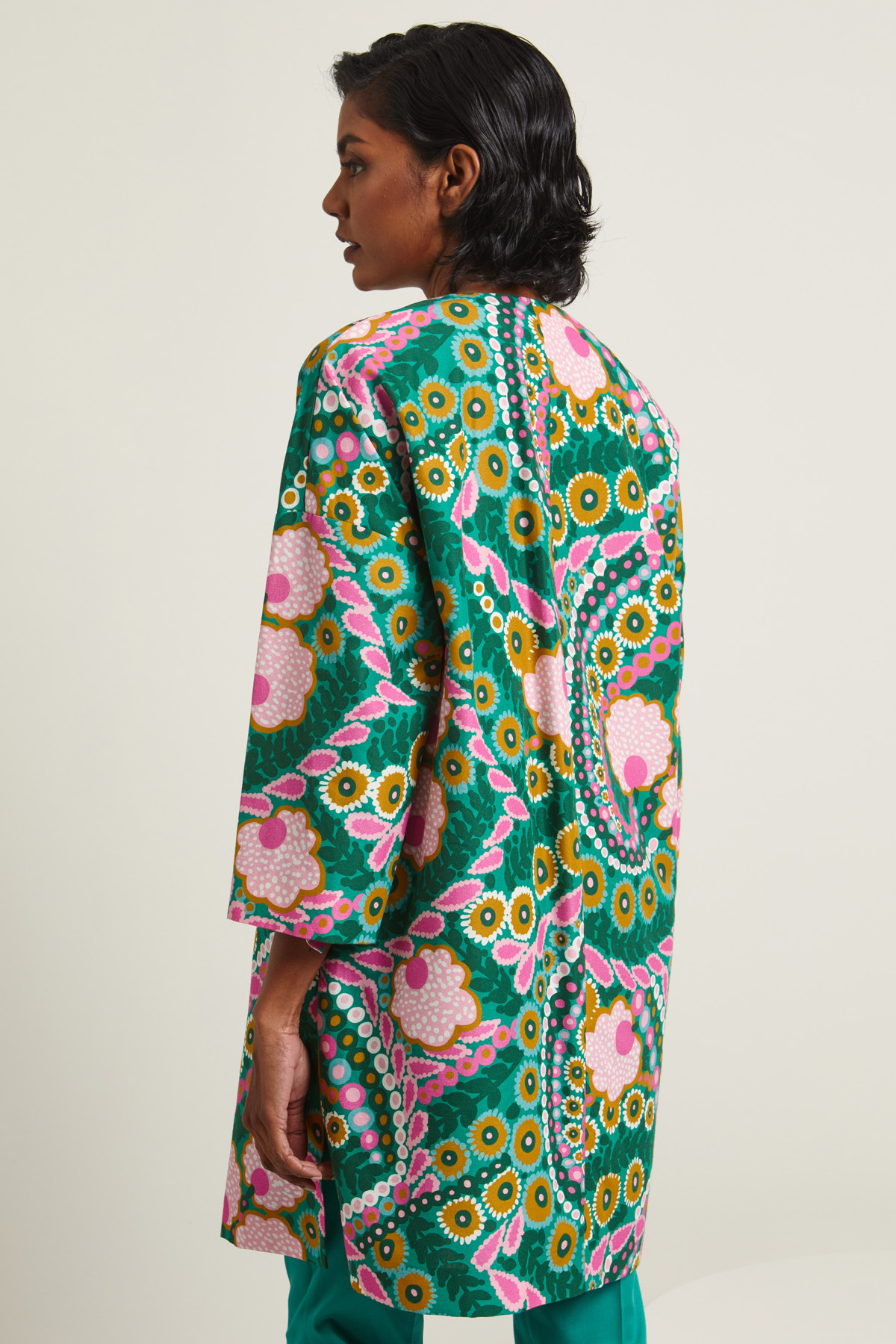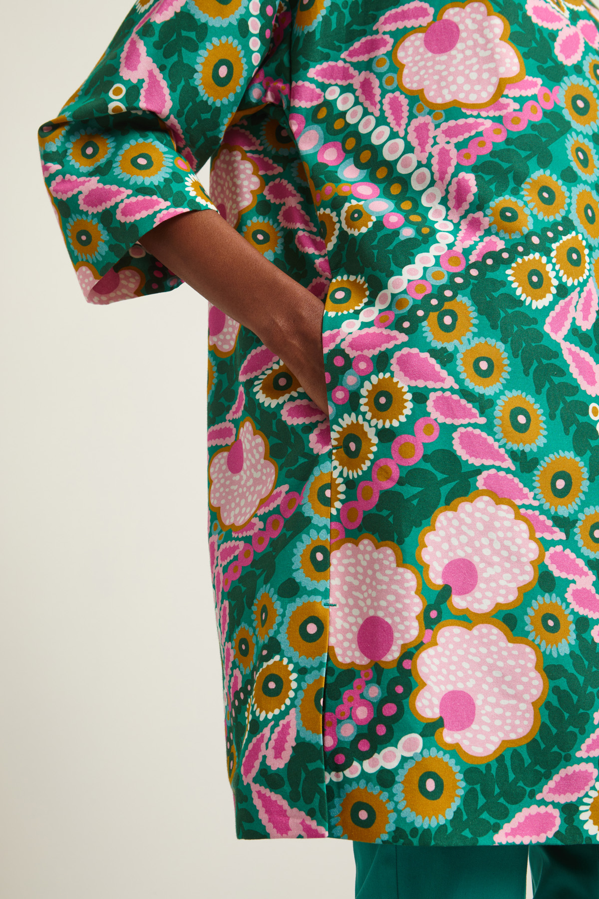 Spolverino dalla linea dritta realizzato in faille di puro cotone stampato con collo tondo e maniche lunghe dal giro sceso, tasche inserite in cucitura e spacchi laterali. Chiusura nascosta tramite bottoni automatici rivestiti. Capo sfoderato.