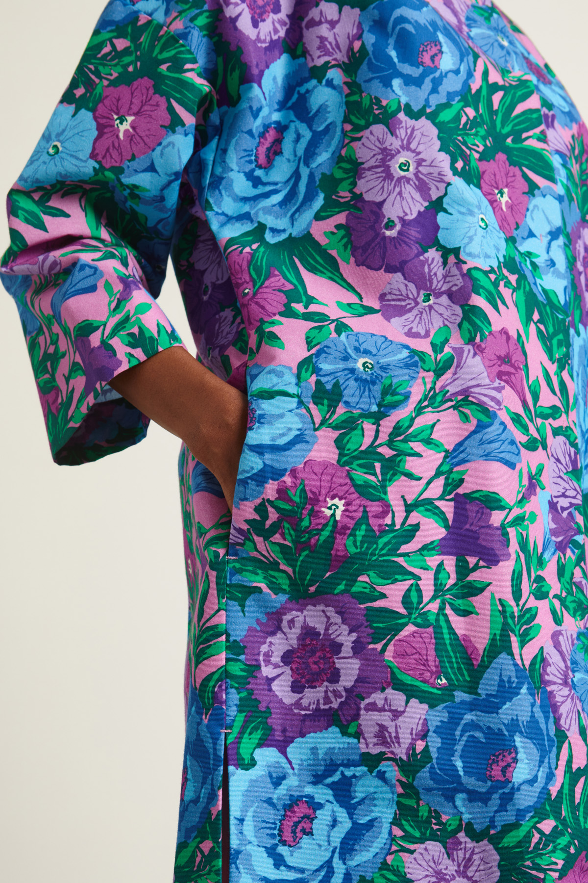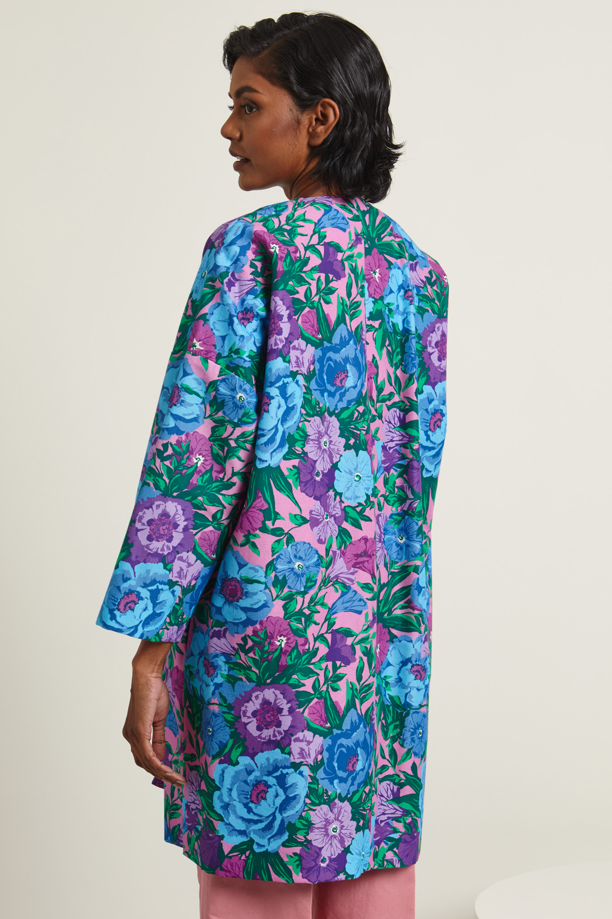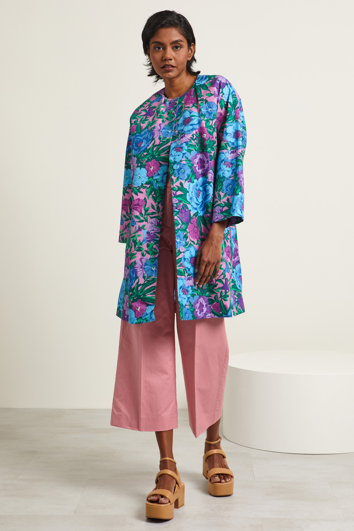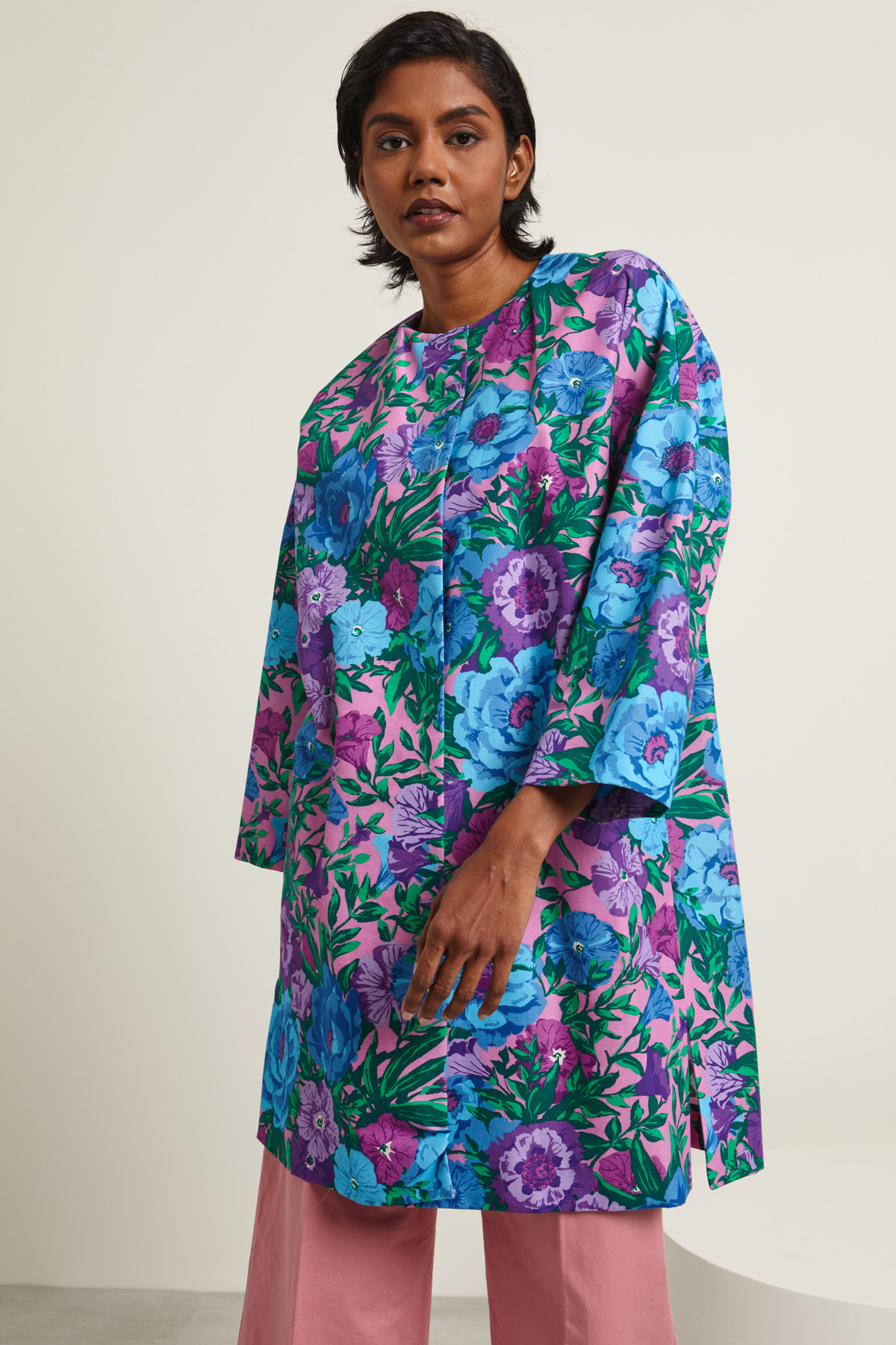 Spolverino dalla linea dritta realizzato in faille di puro cotone stampato con collo tondo e maniche lunghe dal giro sceso, tasche inserite in cucitura e spacchi laterali. Chiusura nascosta tramite bottoni automatici rivestiti. Capo sfoderato.