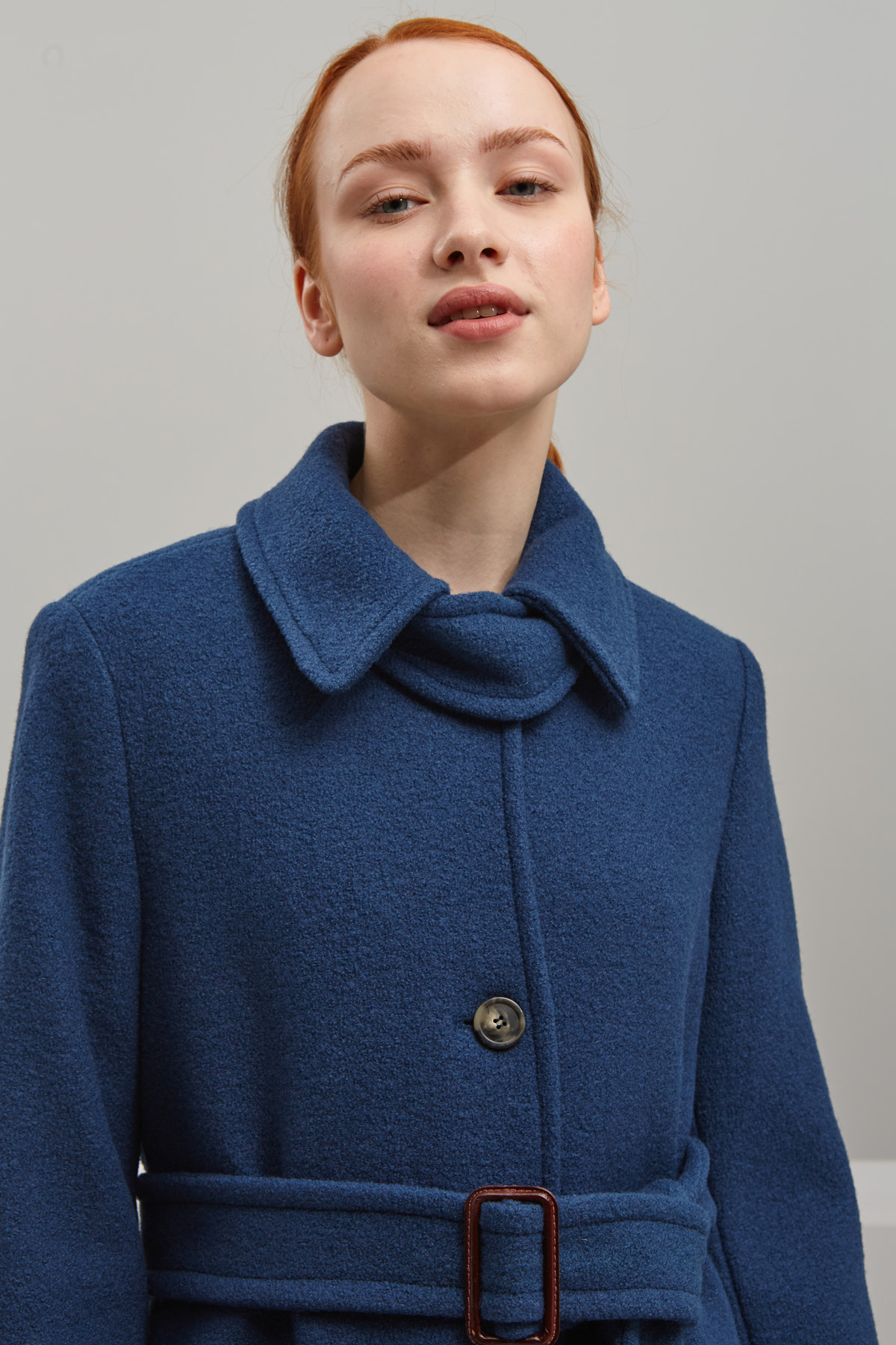 Cappotto lungo stile trench realizzato in tessuto bouclè di pura lana, con colletto a camicia, maniche lunghe con cinturino al fondo, tasche a filettone, spacco nel retro, allacciatura monopetto tramite bottoni e cintura coordinata. Foderato.