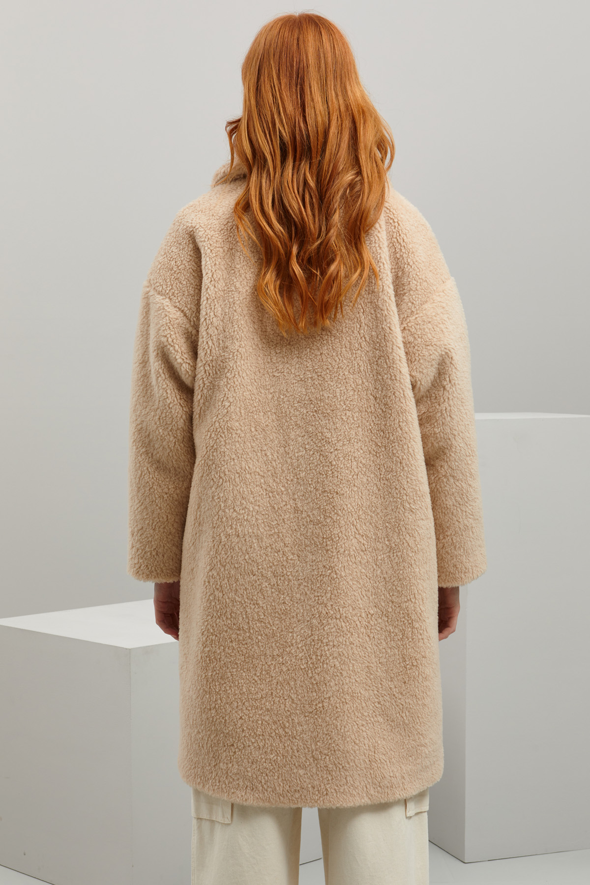 Cappotto lungo dalla linea dritta realizzato in tessuto di misto lana effetto peluche, con collo a rever, maniche lunghe, tasche a filettone e allacciatura monopetto tramite bottoni. Foderato.
