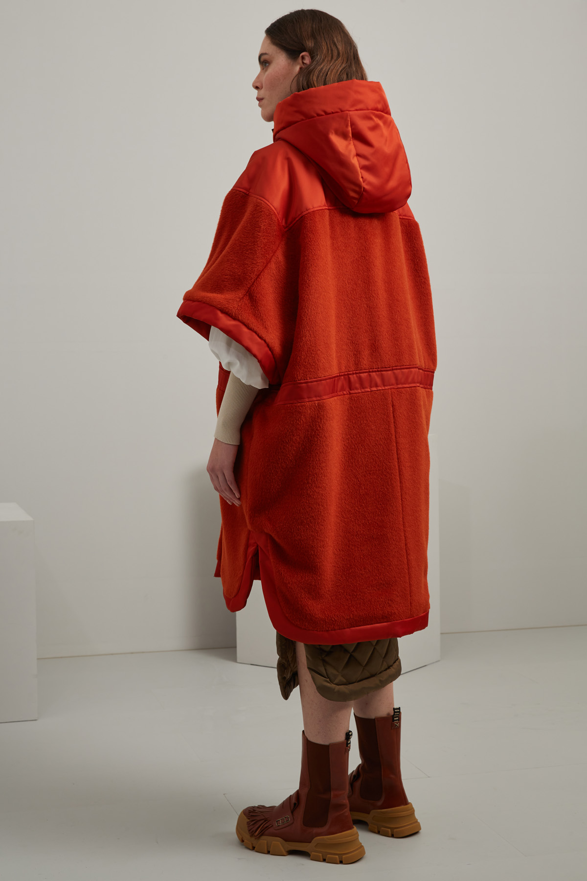 Imbottito reversibile dalla linea dritta realizzato in beaver di misto lana, alpaca e mohair, con inserti in tessuto tecnico, collo alto ampio e cappuccio, maniche corte a kimono, maxi tasca a marsupio sul davanti e spacchetti laterali al fondo. Allacciatura monopetto tramite bottoni automatici.