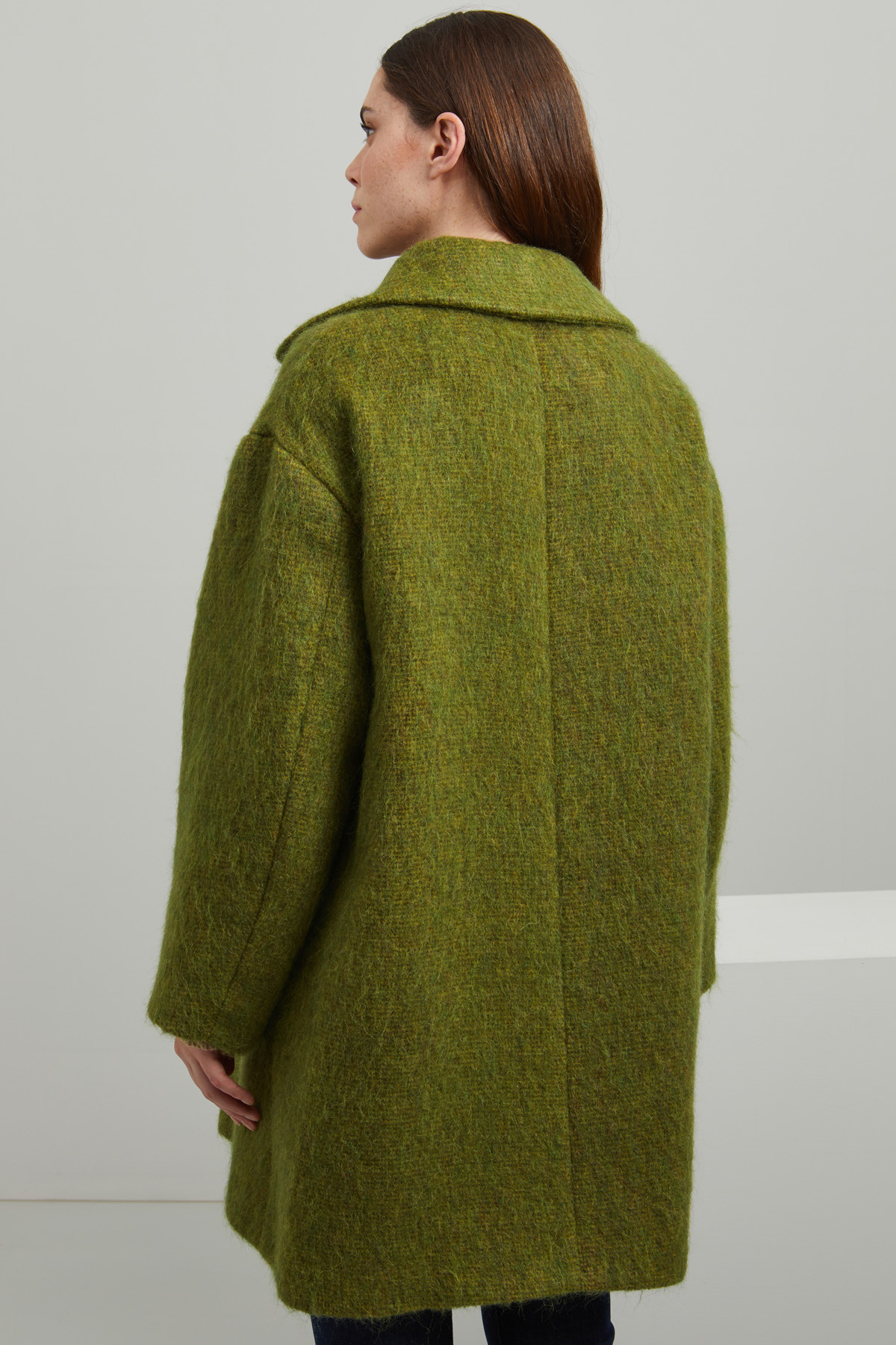 Cappotto dalla linea dritta realizzato in filato garzato di misto lana, alpaca e mohair. Il capo presenta collo a rever, maniche lunghe dal giro sceso, tasche laterali a filettone e allacciatura doppiopetto nascosta tramite bottoni automatici. Foderato.