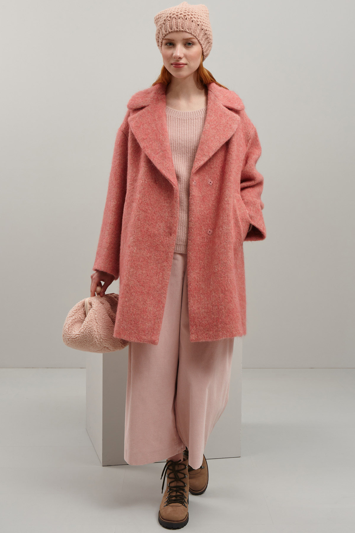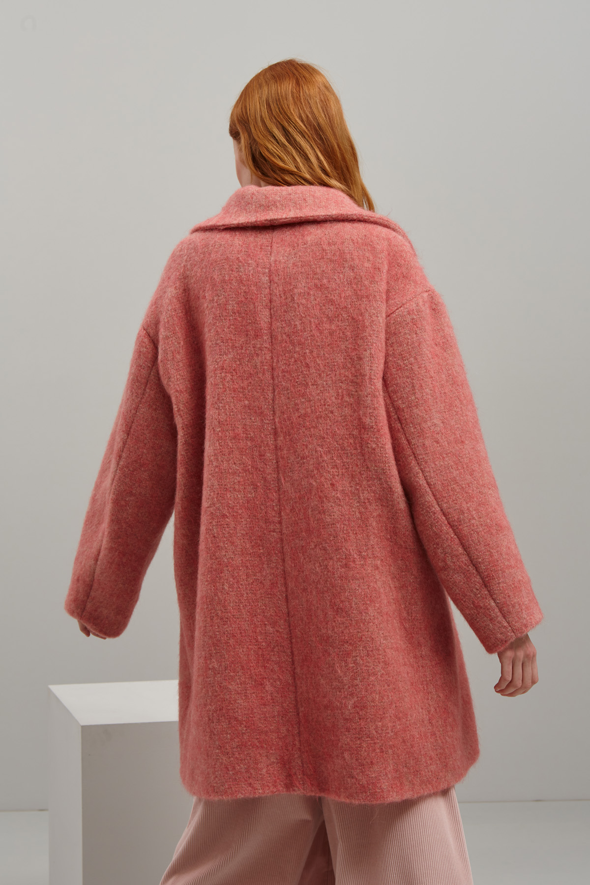 Cappotto dalla linea dritta realizzato in filato garzato di misto lana, alpaca e mohair. Il capo presenta collo a rever, maniche lunghe dal giro sceso, tasche laterali a filettone e allacciatura doppiopetto nascosta tramite bottoni automatici. Foderato.