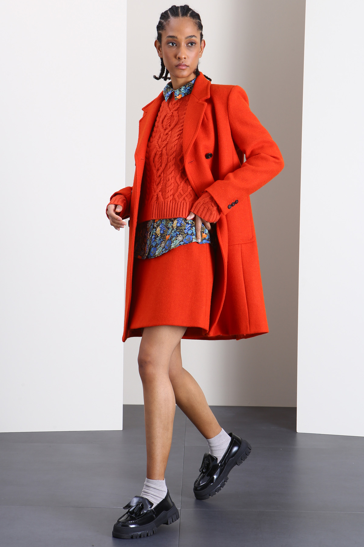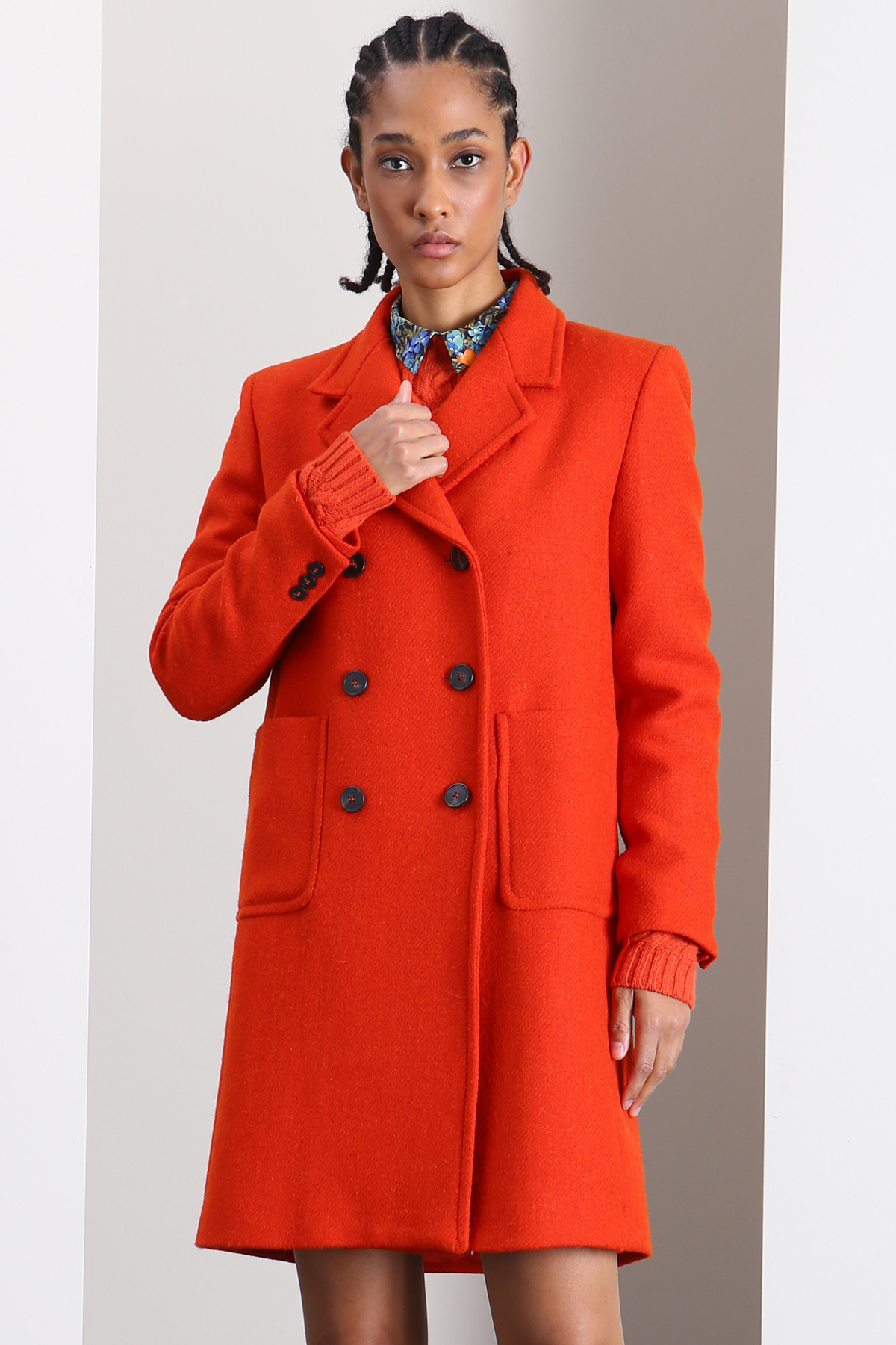 Cappotto dalla linea dritta realizzato in tessuto di pura lana, con collo a rever, maniche lunghe, tasche applicate sui fianchi e spacco centrale nel retro. Allacciatura doppiopetto tramite bottoni. Capo foderato.