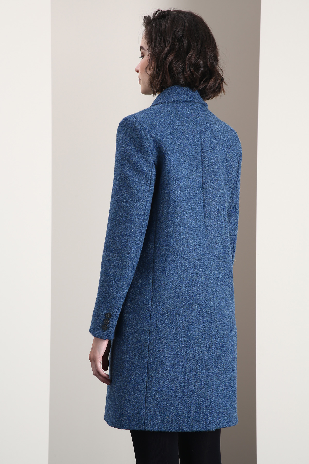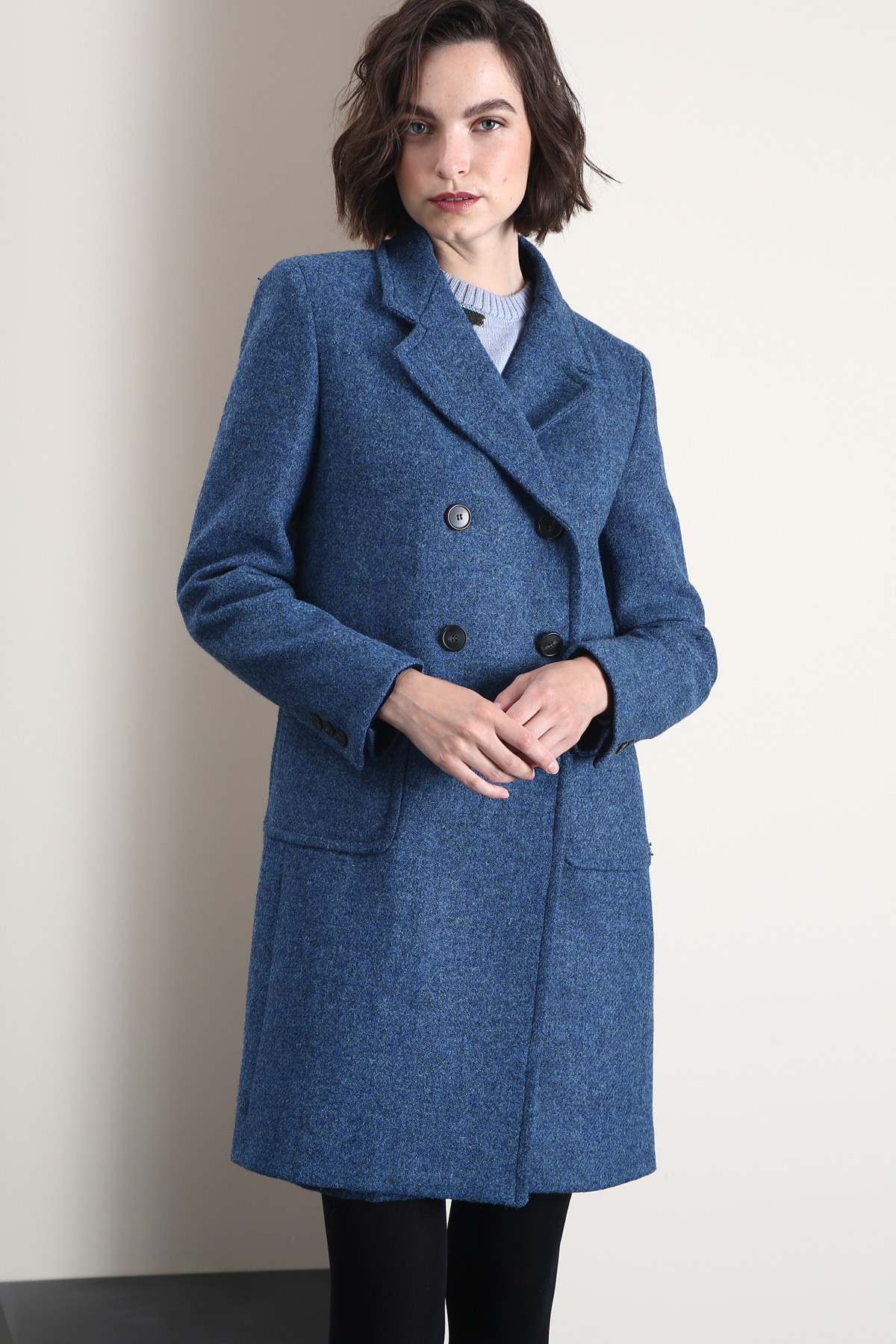 Cappotto dalla linea dritta realizzato in tessuto di pura lana, con collo a rever, maniche lunghe, tasche applicate sui fianchi e spacco centrale nel retro. Allacciatura doppiopetto tramite bottoni. Capo foderato.