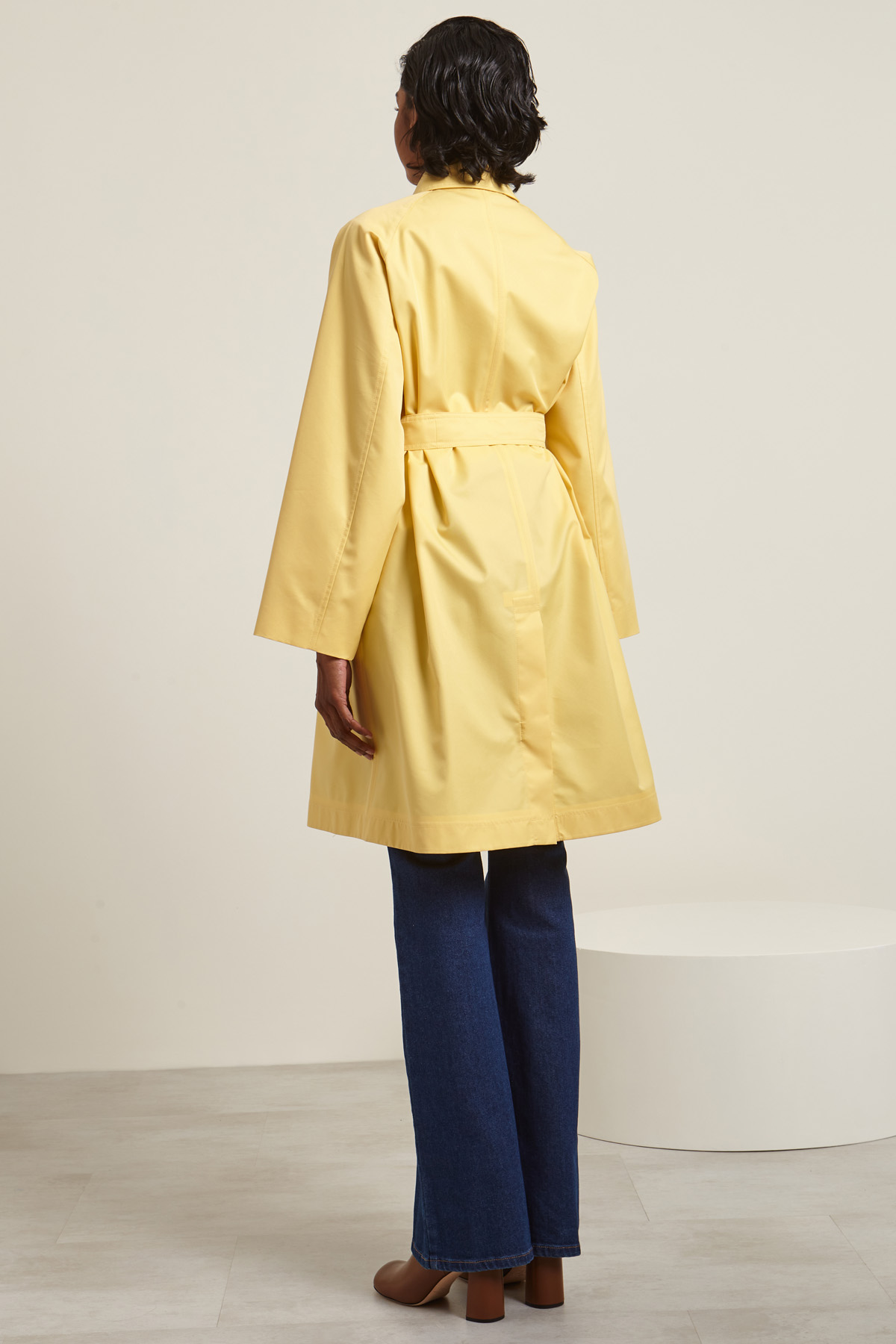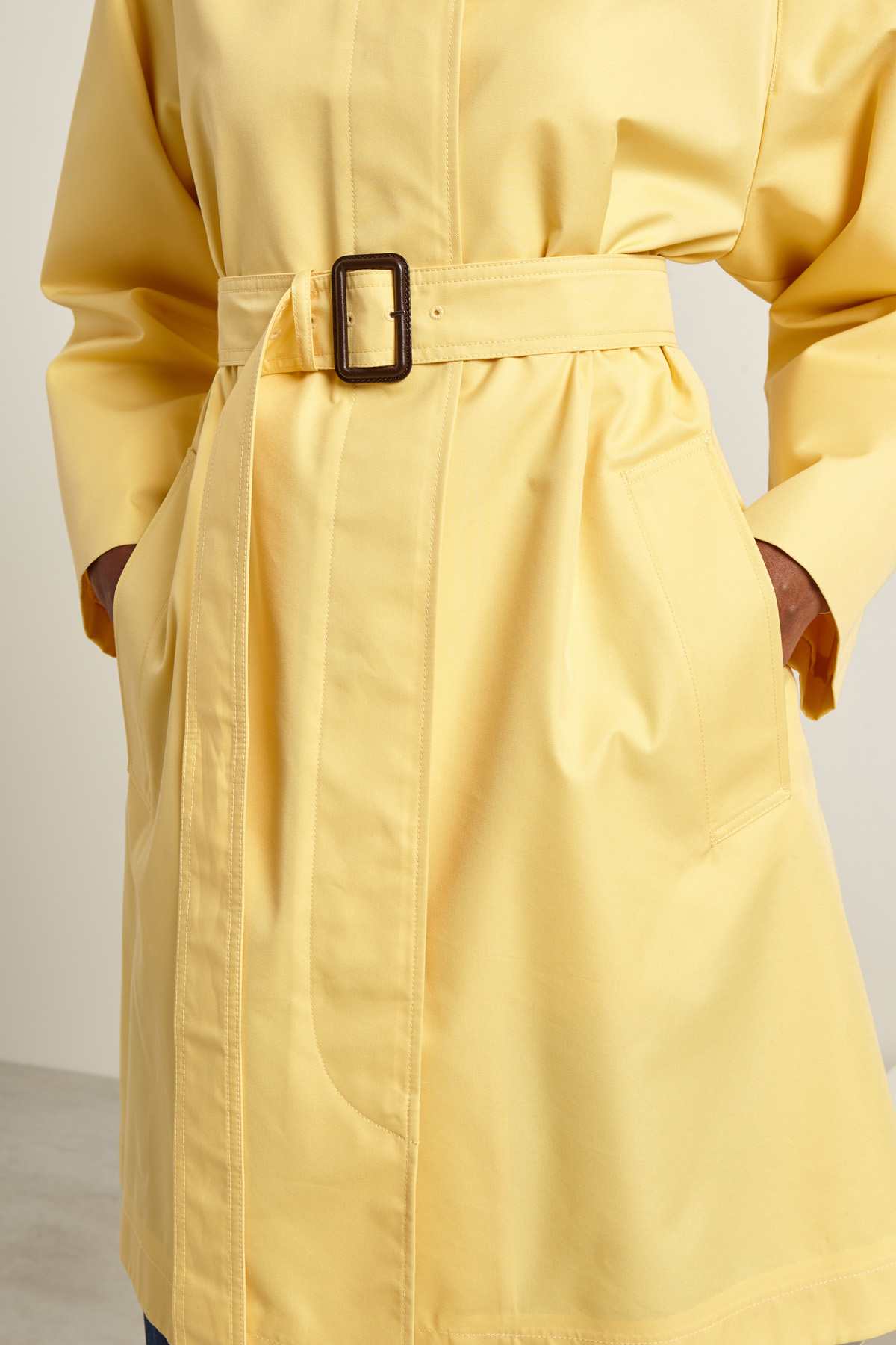 Trench dalla linea dritta realizzato in gabardina di misto cotone con colletto a camicia, maniche lunghe raglan, tasche a filettone e spacco nel retro. Allacciatura nascosta tramite bottoni e cintura coordinata. Capo semifoderato.