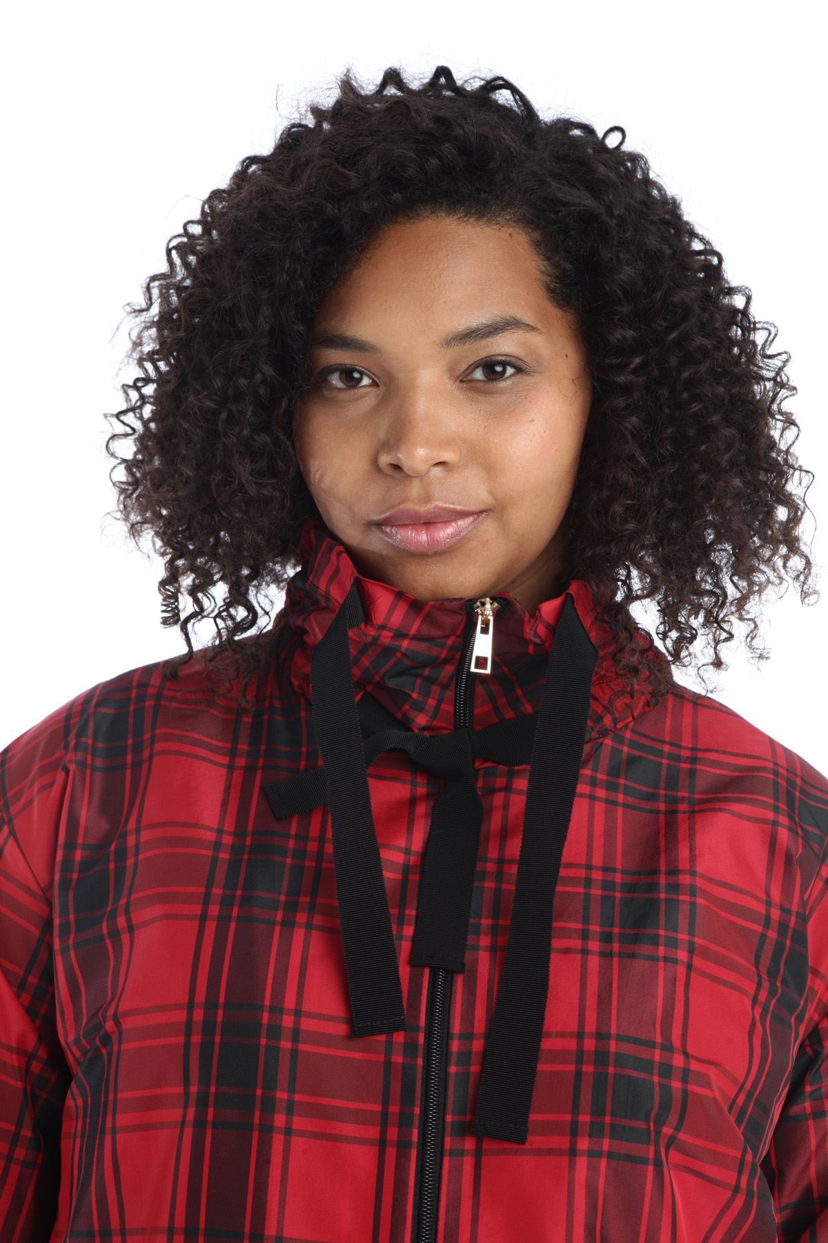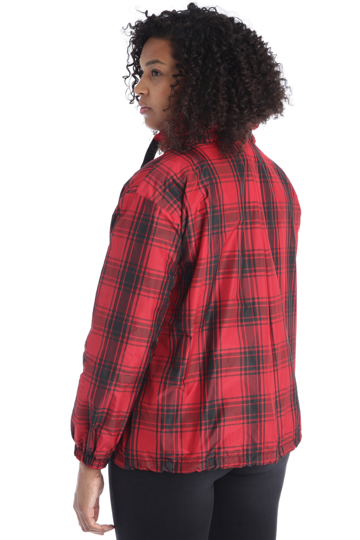 Impermeabile corto realizzato in taffetà tecnica tinto filo, con collo alto, maniche lunghe, tasche laterali a filetto, contropiego nel retro e coulisse a fondo capo. Allacciatura tramite zip sul davanti.