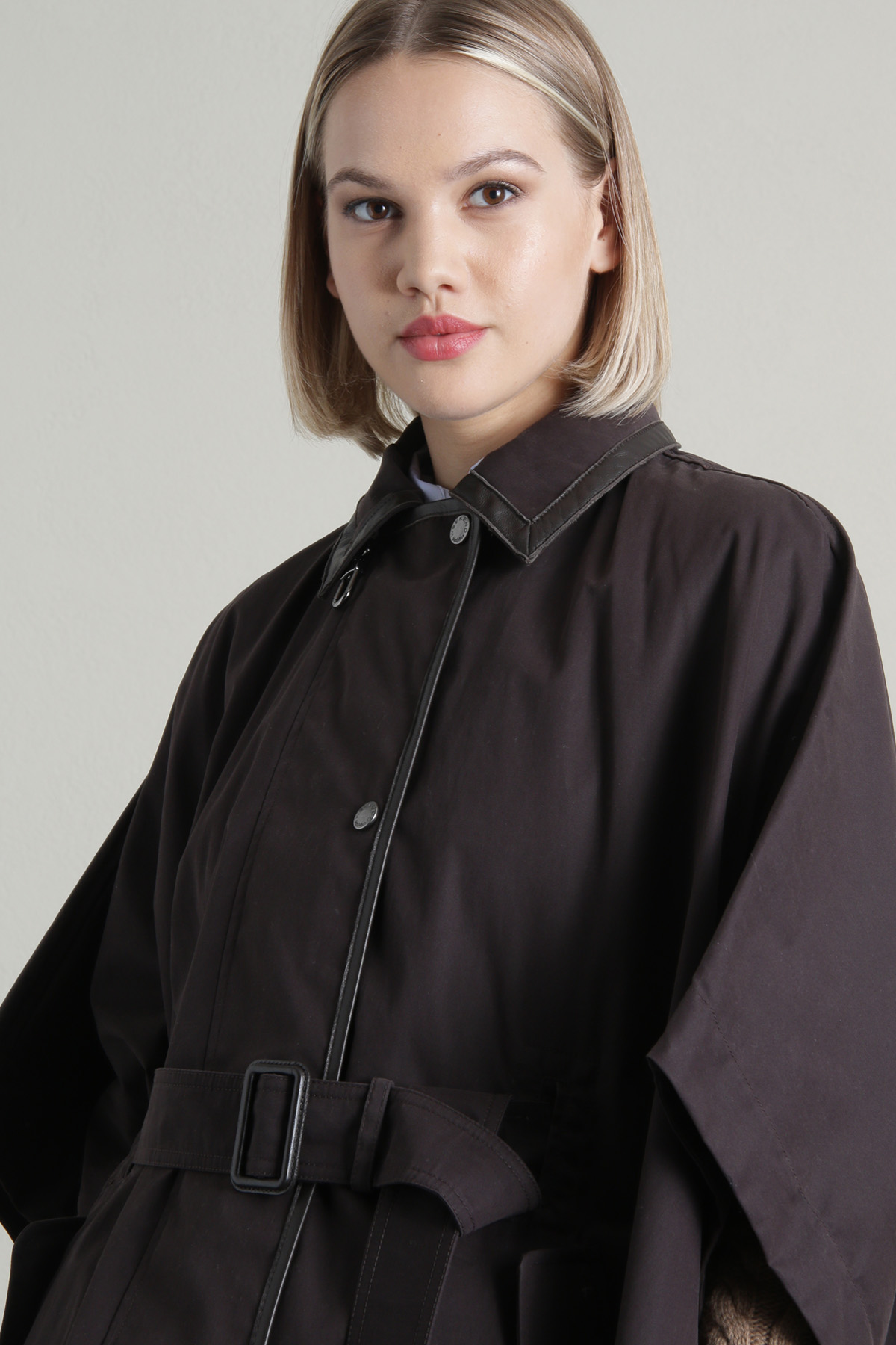 Cappa dalla linea ampia realizzata in gabardine di puro cotone antigoccia, con colletto a camicia, cappuccio removibile con coulisse, maniche tre quarti a kimono con bottone, tasche diagonali a filetto con patta e bottone. Allacciatura tramite zip, bottoni e cintura coordinata con fibbia. Sfoderato.
