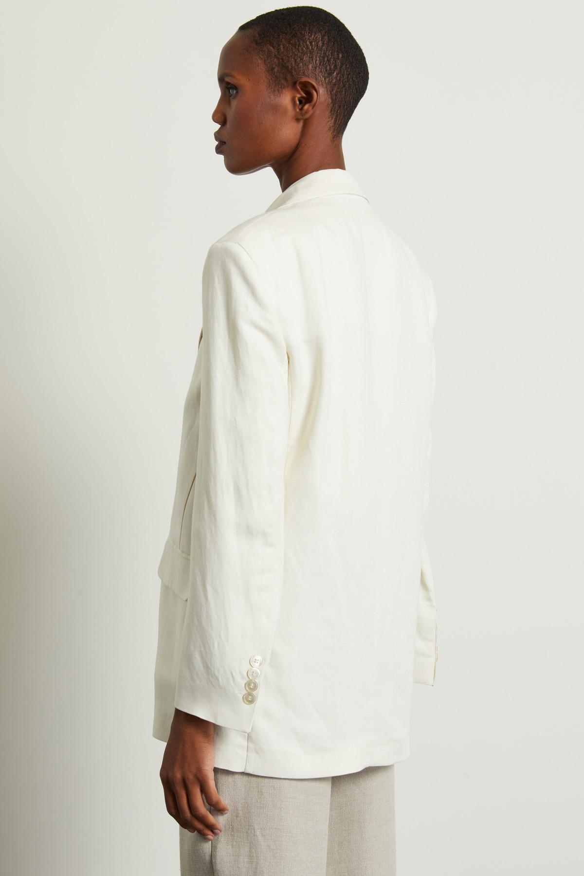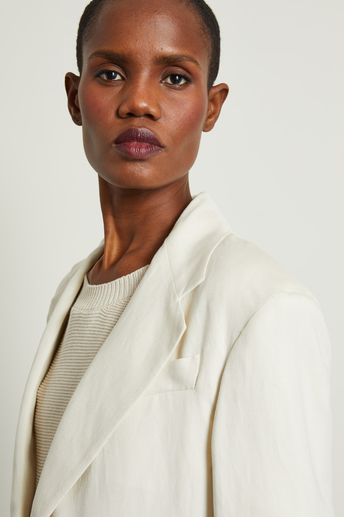 Blazer dalla linea dritta realizzato in tela di viscosa e lino, con collo a rever, maniche lunghe con bottoni al fondo, spalline imbottite, taschino a filettone e tasche a doppio filetto con patta. Allacciatura monopetto tramite bottone. Semifoderato.