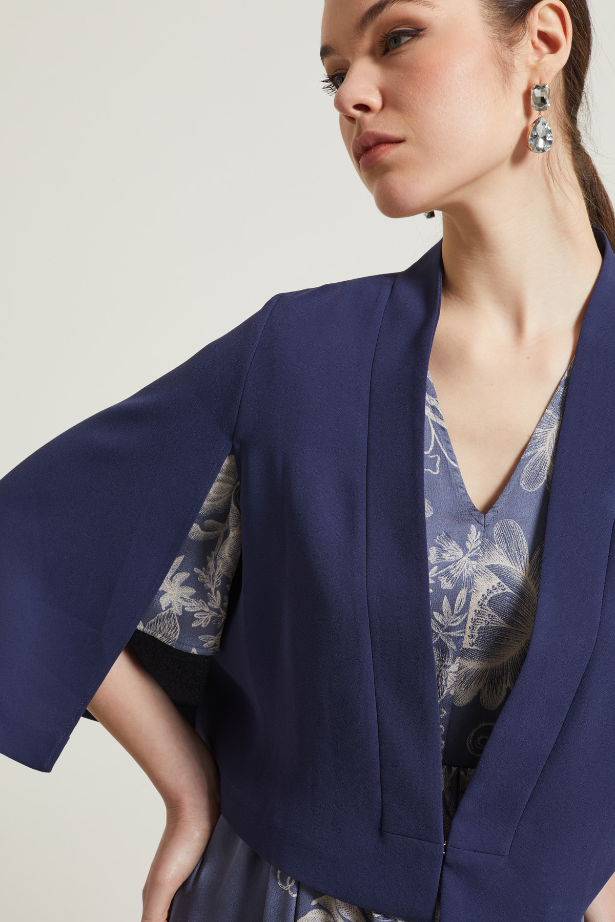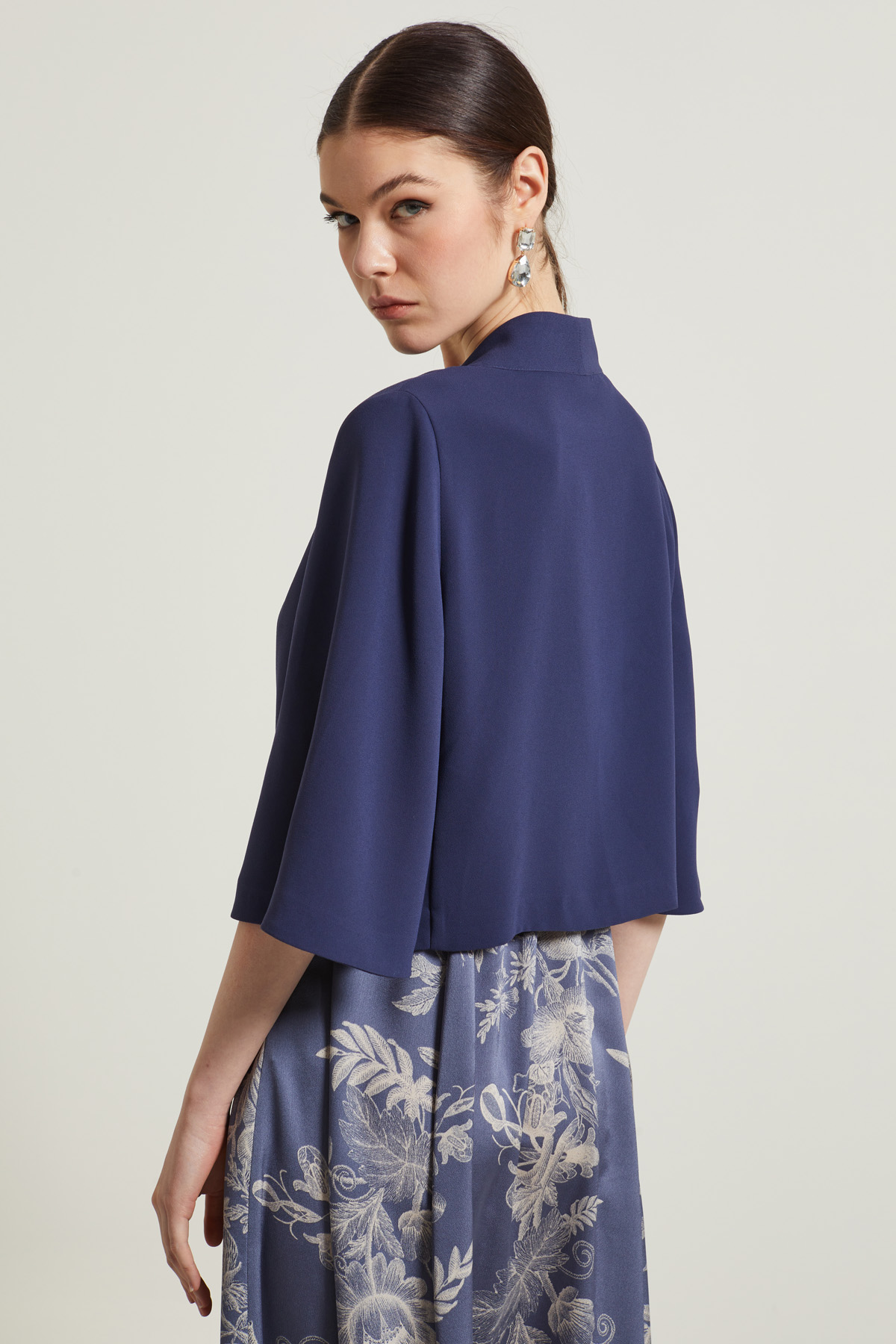 Coprispalle dalla linea dritta realizzato in enver satin con scollo a V, maniche tre quarti a campana con dettaglio cut out e allacciatura tramite gancio. Sfoderato.
