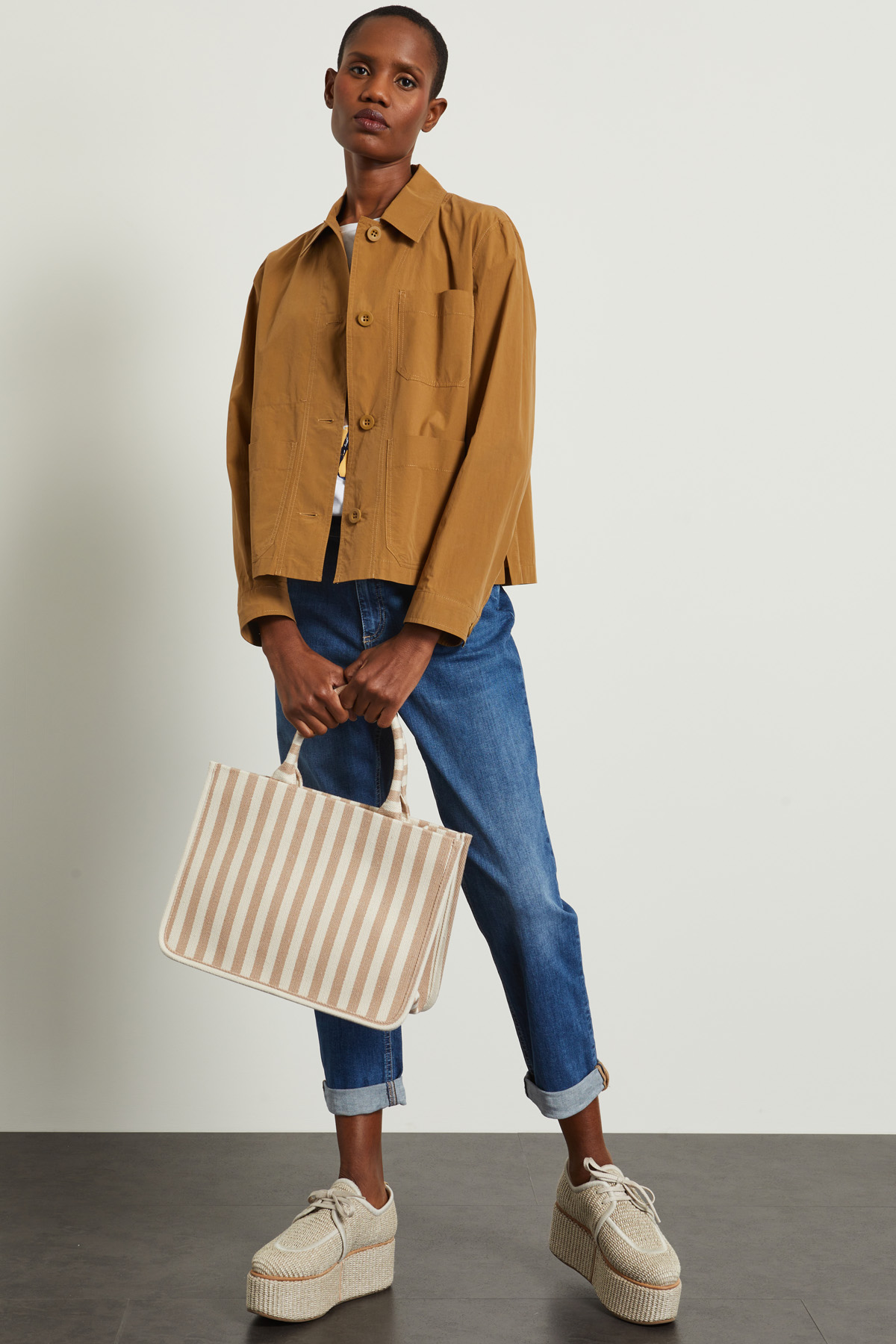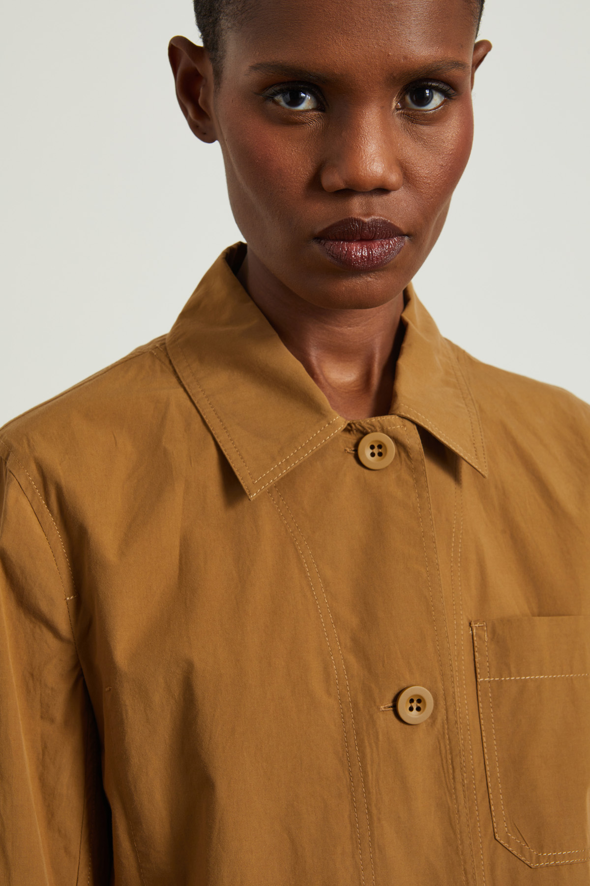 Giacca leggera dalla linea dritta realizzata in popeline di puro cotone, con collo a camicia, maniche lunghe con polsino e bottone, tasche applicate sul davanti e spacchi laterali. Allacciatura monopetto tramite bottoni a vista. Sfoderato.