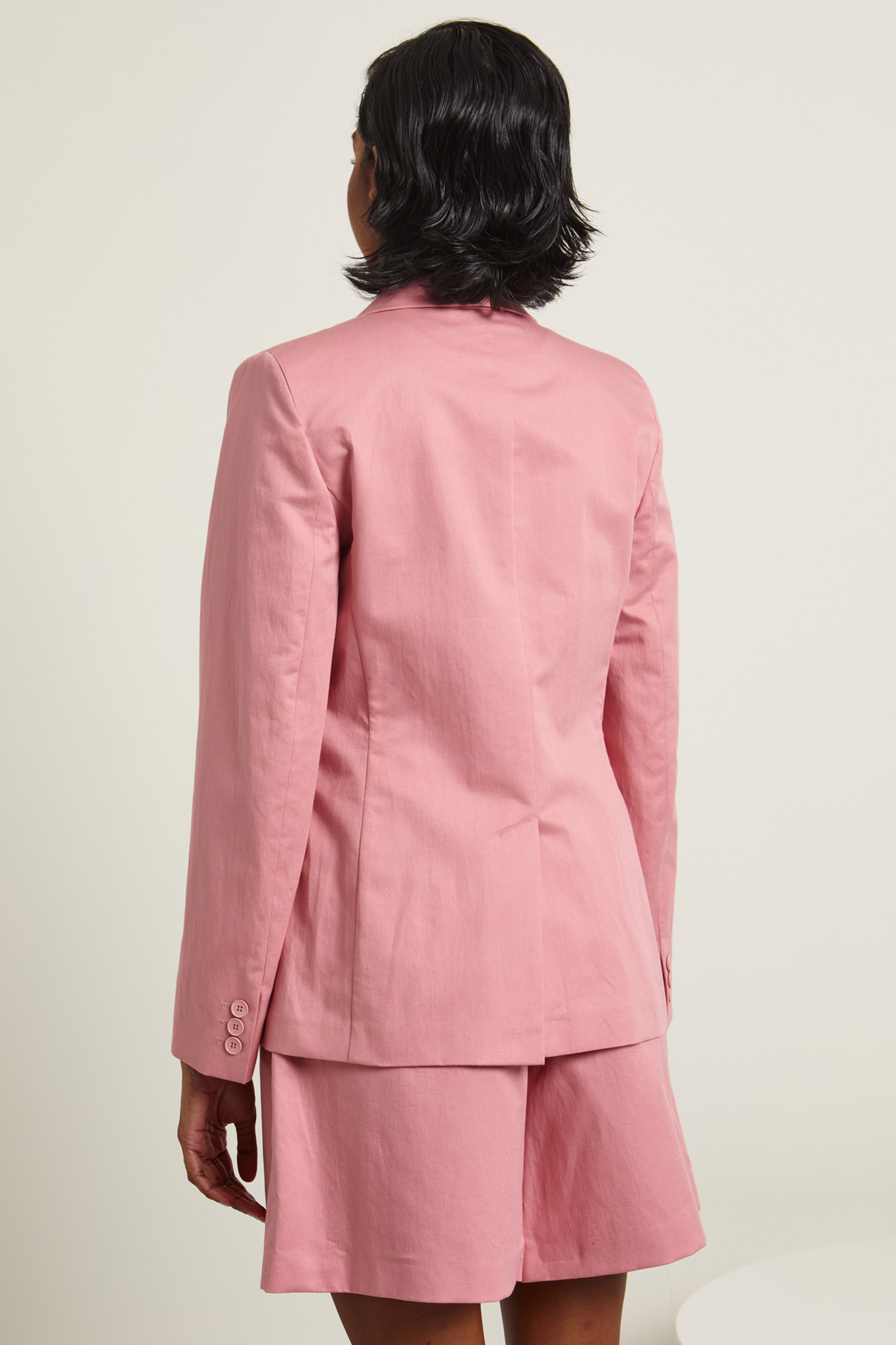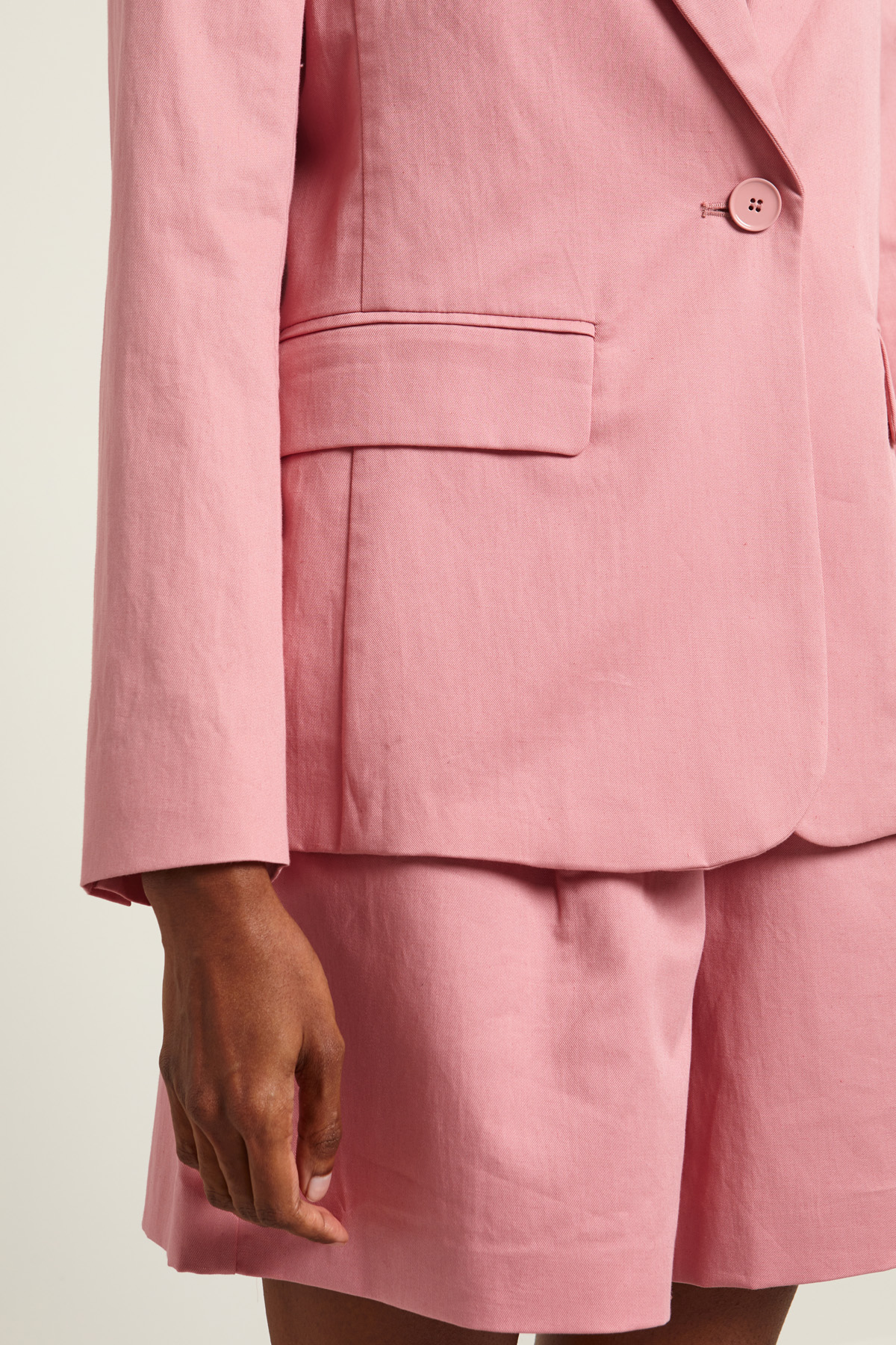Blazer dalla linea sfiancata realizzato in gabardine di misto cotone e lino, con collo a rever, maniche lunghe, taschino a filetto in alto, tasche a filetto con patta laterali, spacco centrale al fondo dietro e allacciatura monopetto tramite bottoni. Capo semifoderato.
