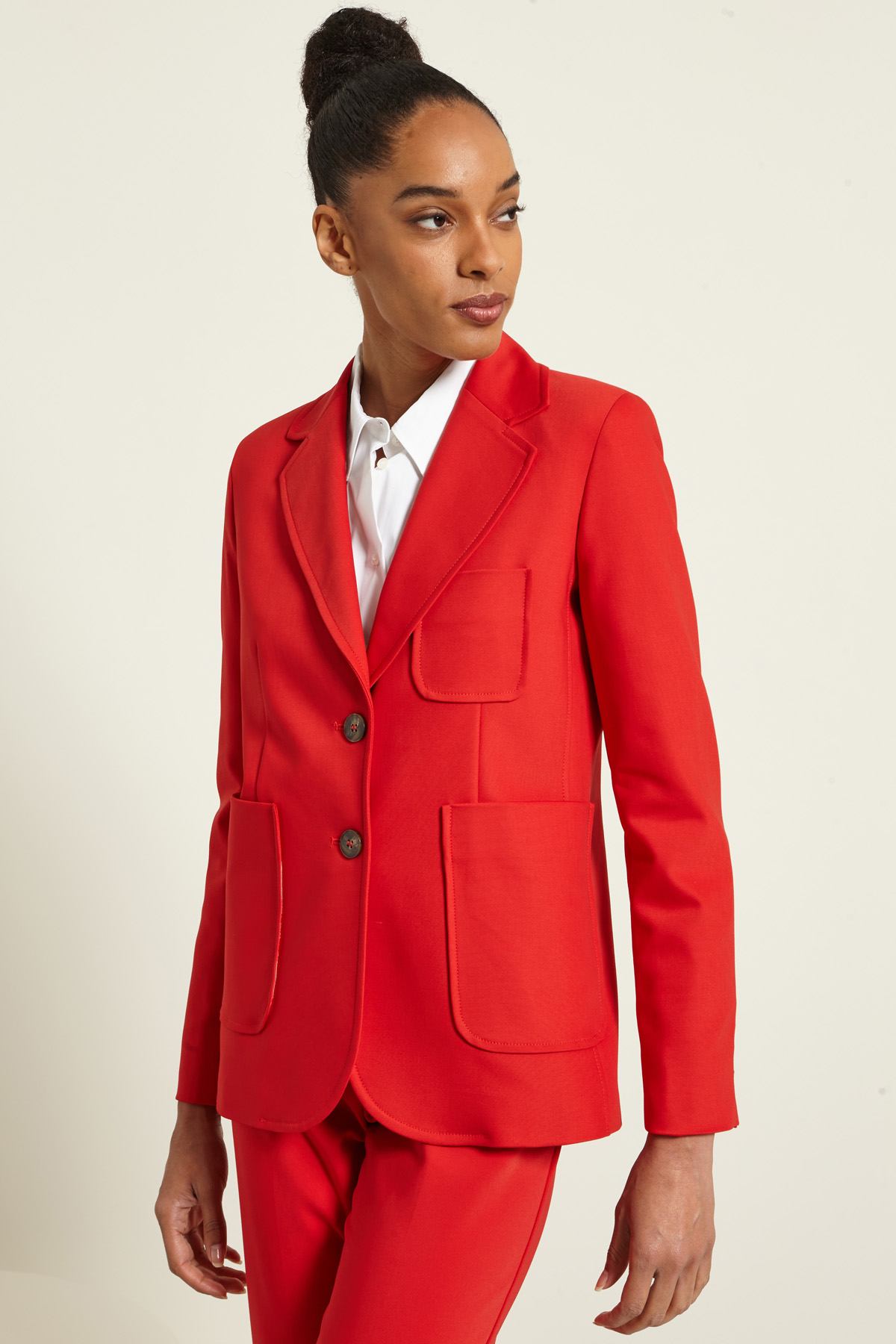 Blazer dalla linea dritta realizzato in tela fluida di misto cotone stretch, con collo a rever, maniche lunghe con bottoni al fondo, tasche e taschino applicati, spacco nel retro. Allacciatura monopetto tramite bottoni. Foderato.