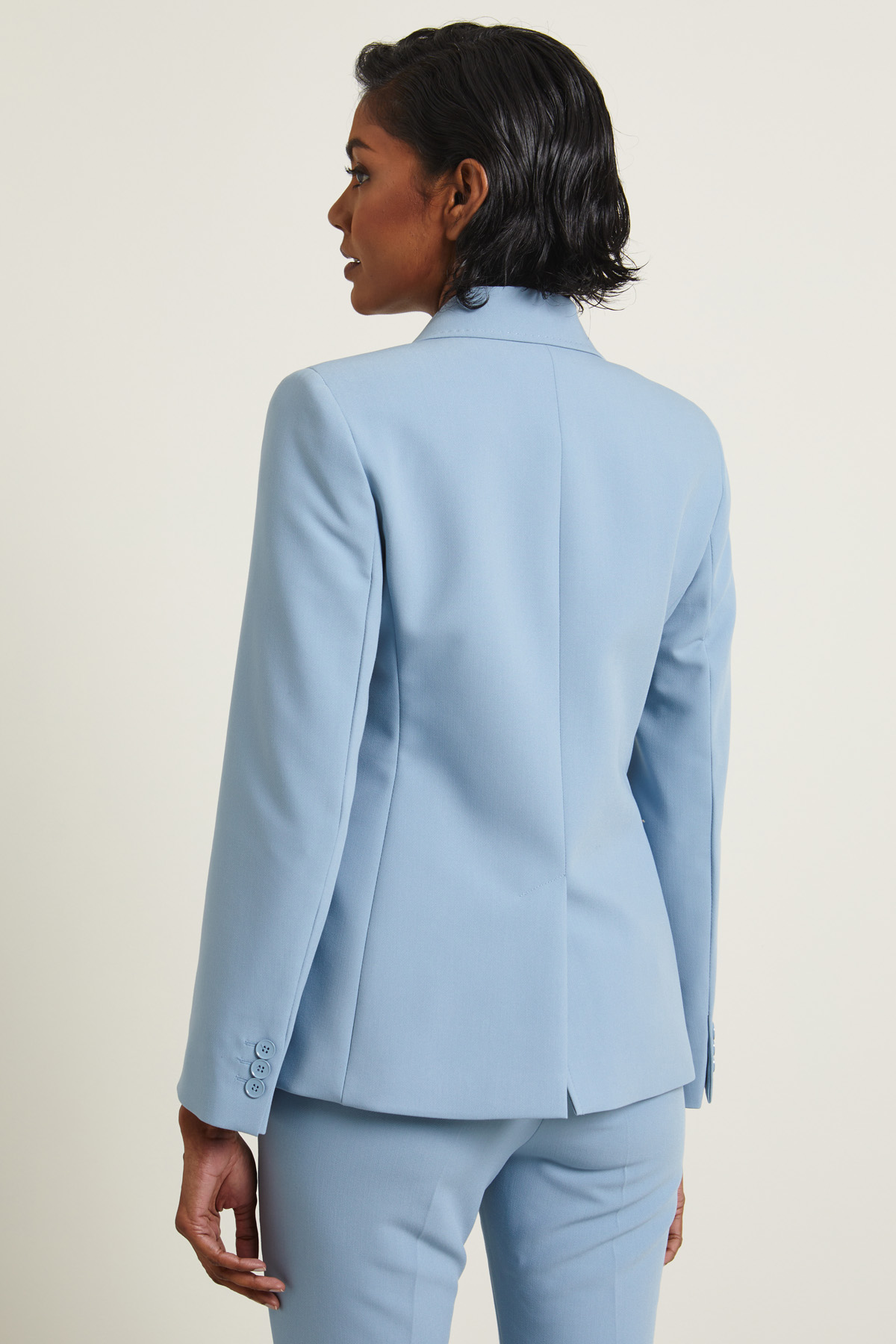 Blazer dalla linea dritta realizzato in tela di misto viscosa stretch con collo rever, maniche lunghe con spacchetto e bottoni, taschino a filetto e doppio filetto con patta sul davanti, spacco nel retro e profili rifiniti a puntino. Allacciatura monopetto tramite bottoni. Foderato.