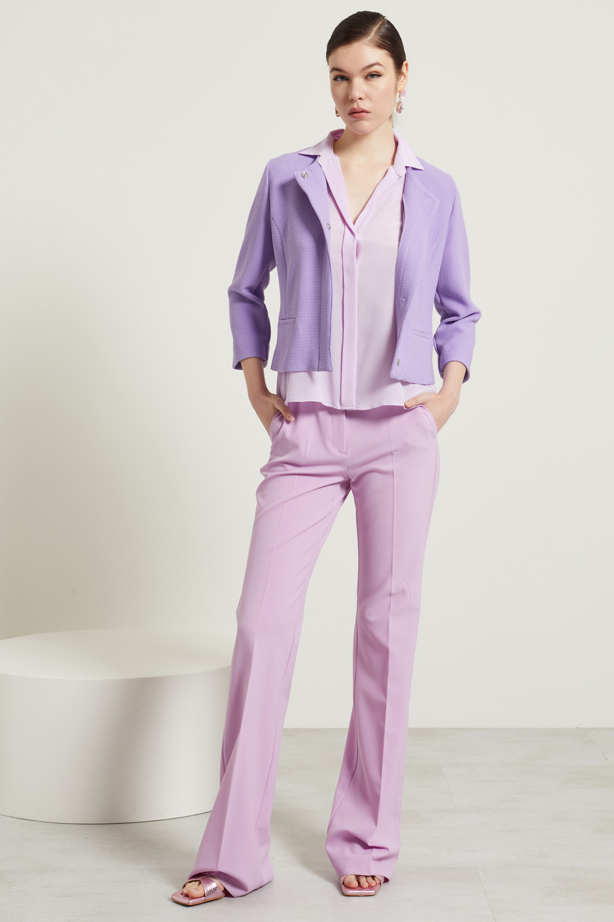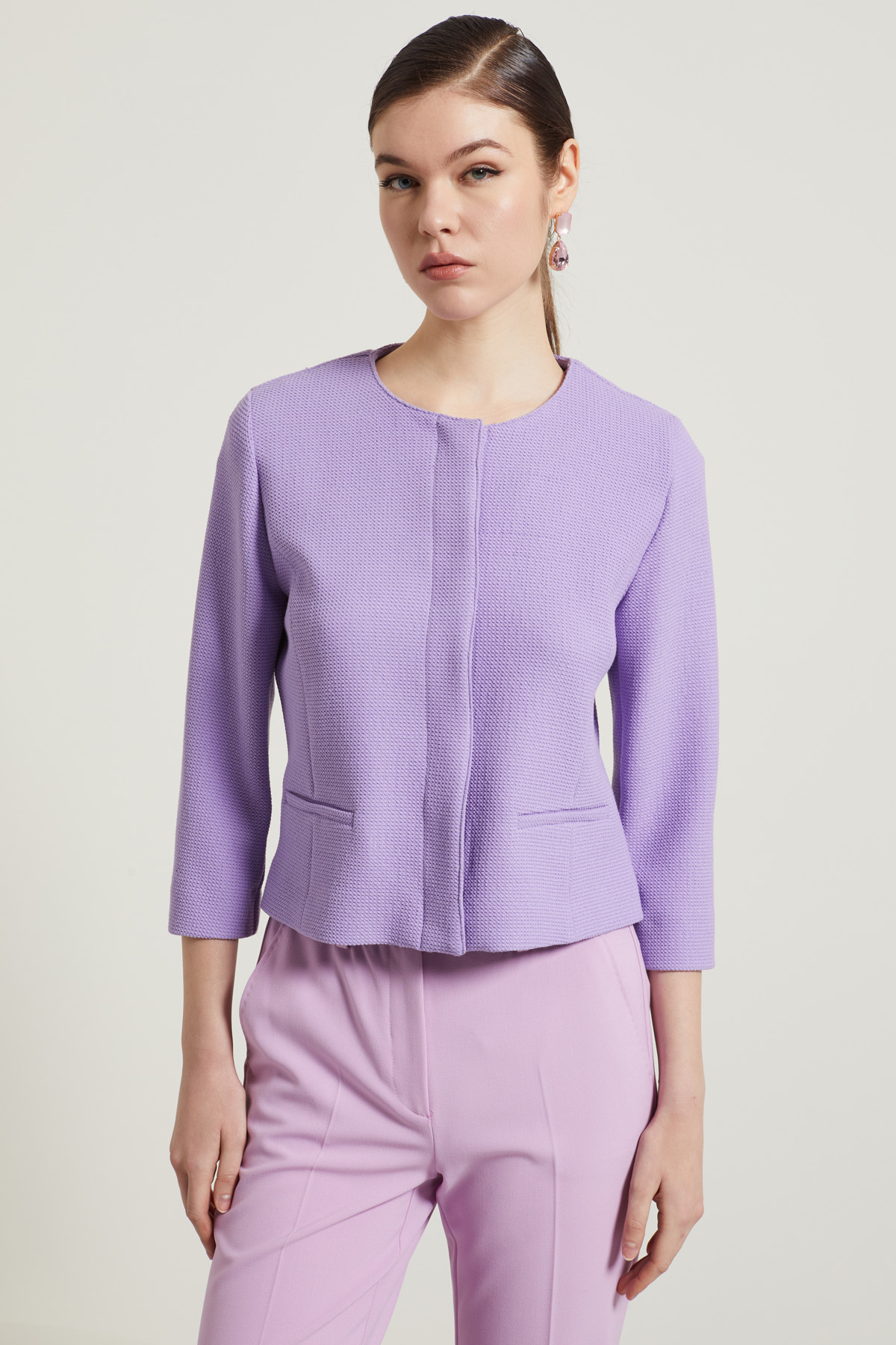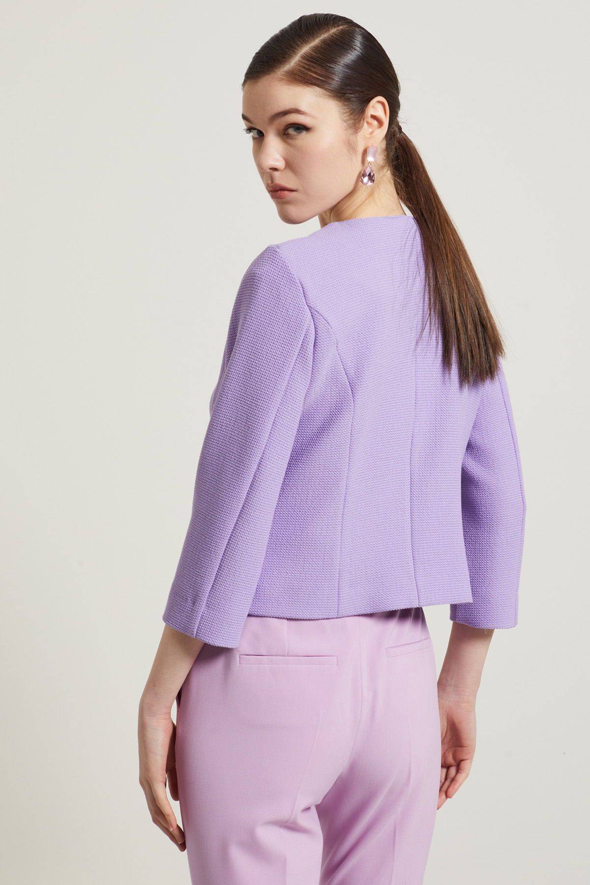 Giacca corta dalla linea dritta realizzata in tessuto armaturato di misto viscosa stretch tinto filo, con scollo a giro, maniche tre quarti e finte tasche sul davanti. Allacciatura monopetto nascosta tramite bottoni automatici. Sfoderata.
