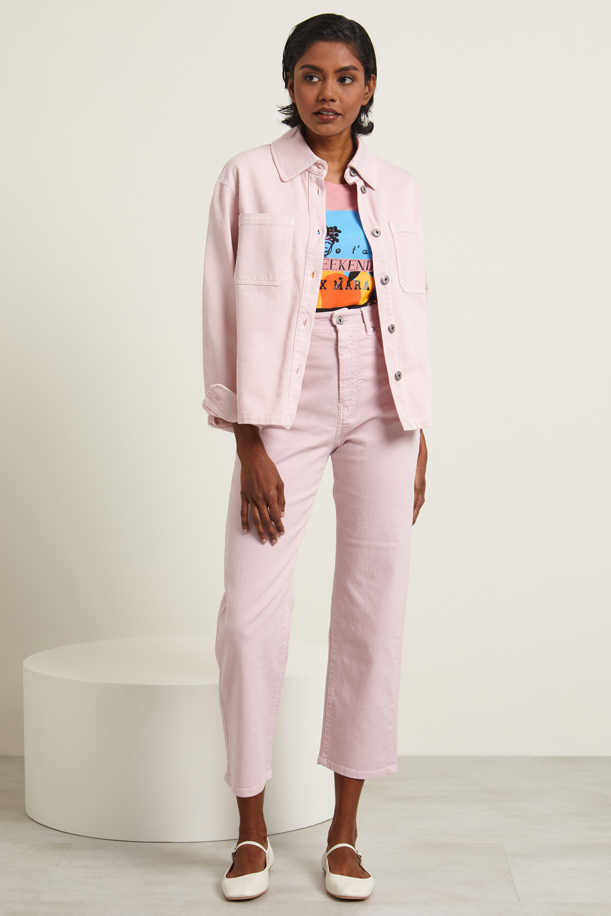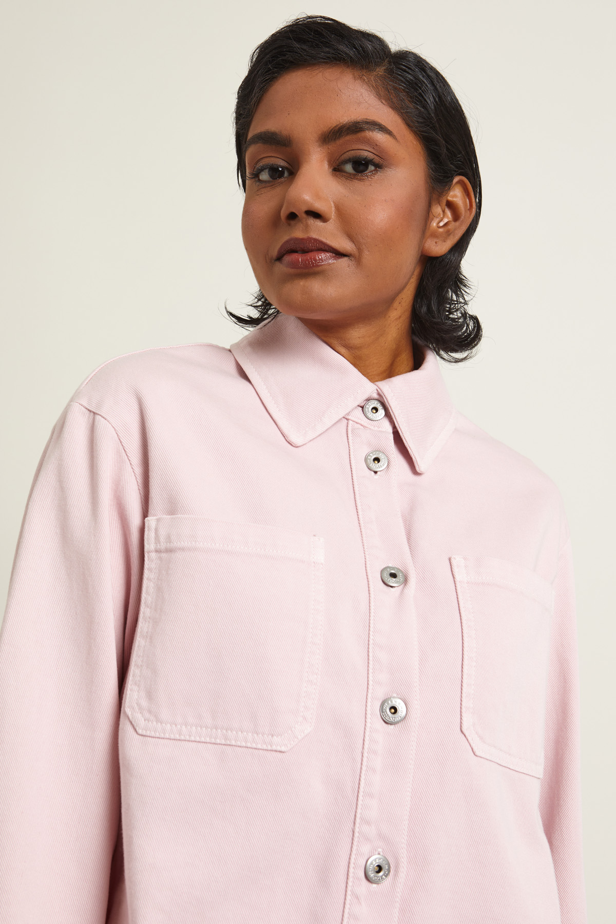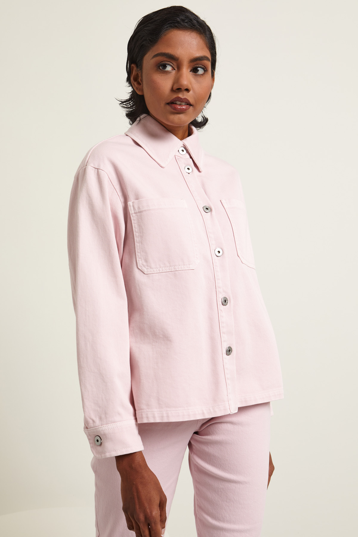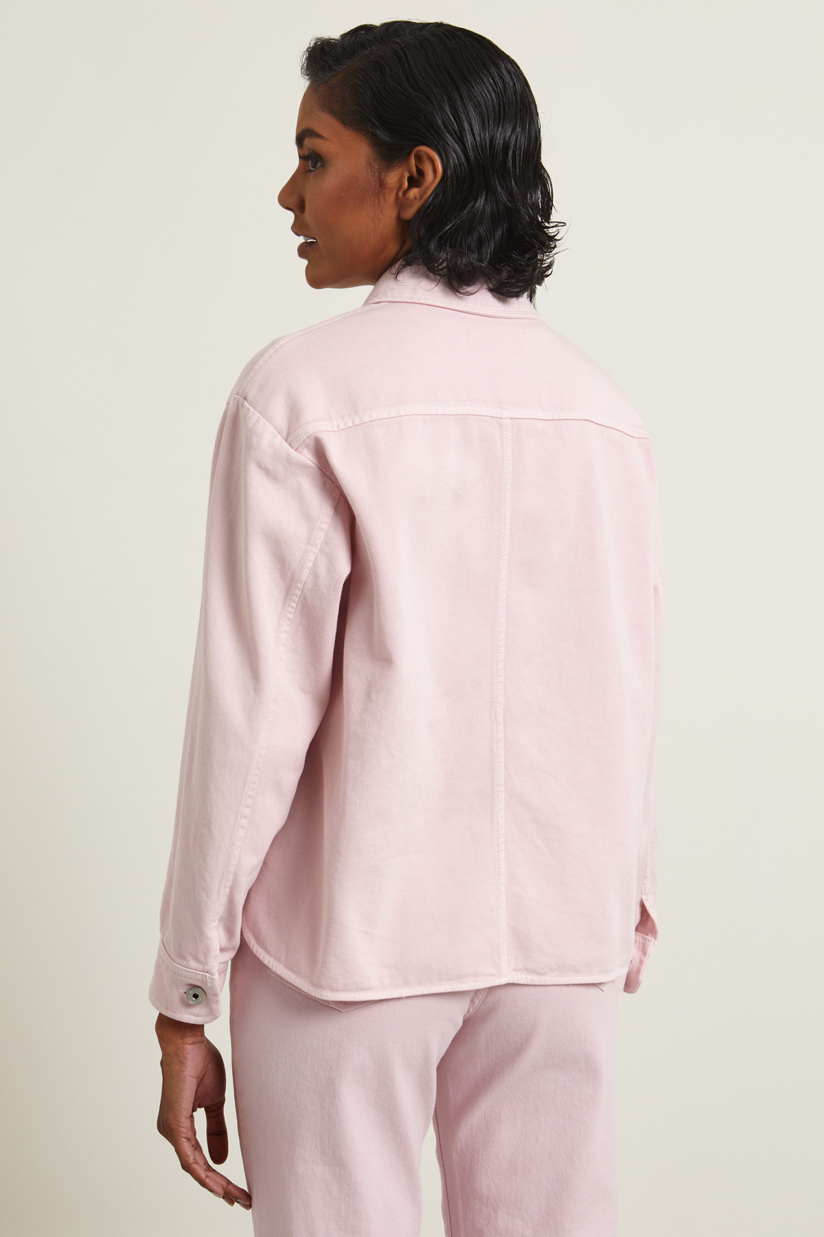 Giacca dalla linea dritta realizzata in drill di puro cotone con collo a camicia, maniche lunghe dal giro sceso e polsini con bottone, tasche applicate sul davanti e spacchi laterali. Allacciatura tramite bottoni in metallo. Sfoderato.