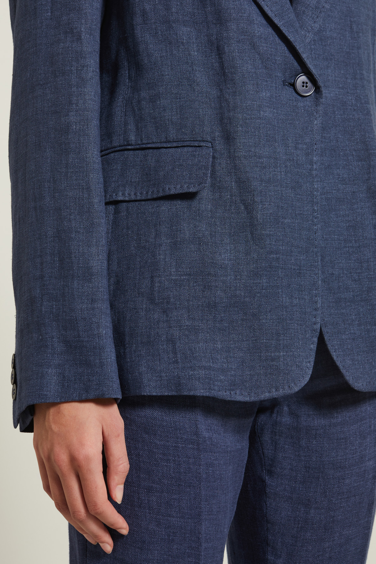 Blazer dalla linea dritta realizzato in tela di puro lino, con collo rever, maniche lunghe con spacchetti e bottoni, taschino a filettone sul petto e doppio filetto con patta sul davanti, spacco nel retro e profili rifiniti a puntino. Allacciatura monopetto tramite bottone.