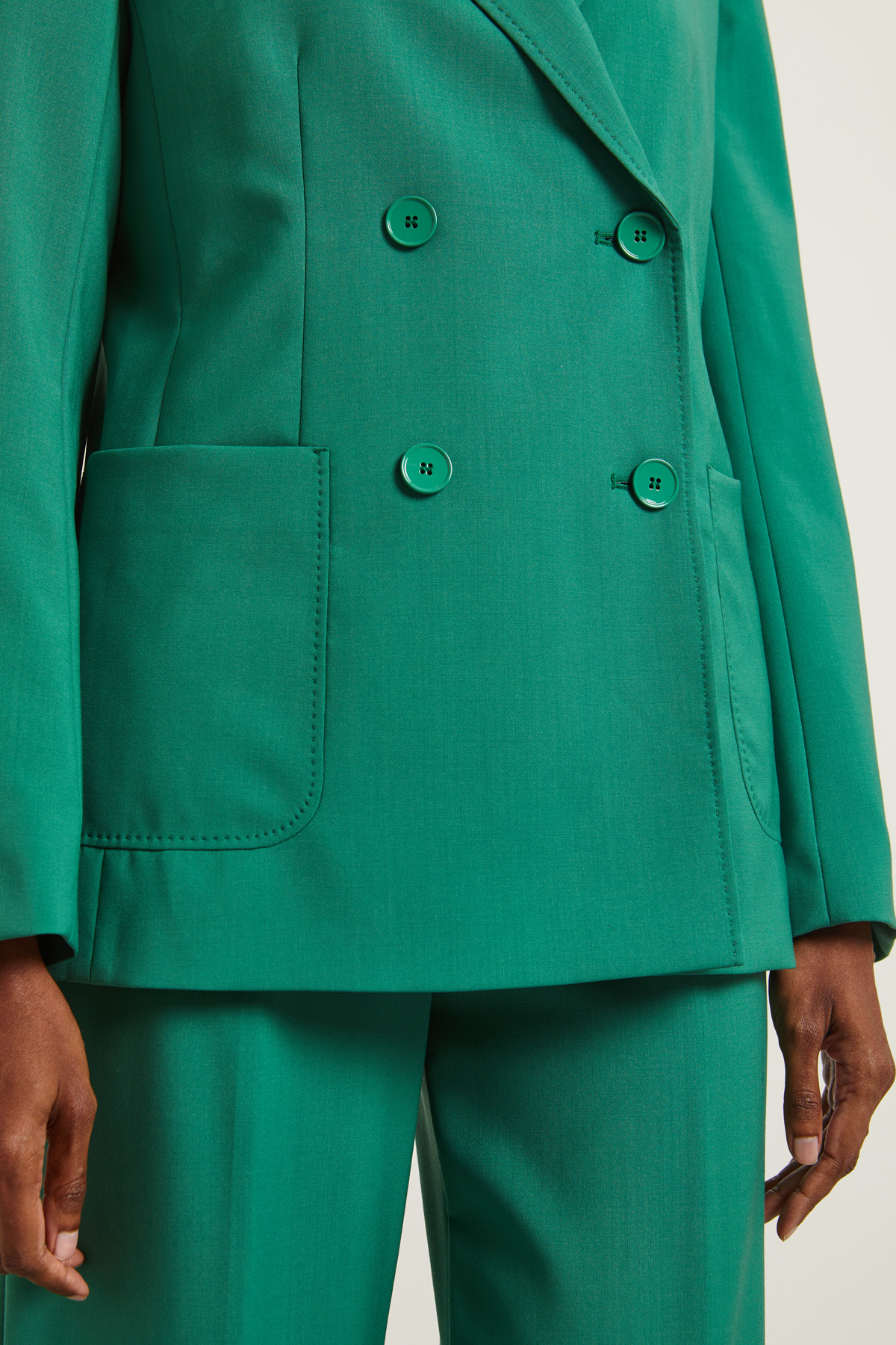 Blazer dalla linea dritta realizzato in tela di lana stretch con collo rever, maniche lunghe con spacchetto e bottoni, tasche applicate e spacco nel retro. Allacciatura doppiopetto tramite bottoni a vista. Foderato.