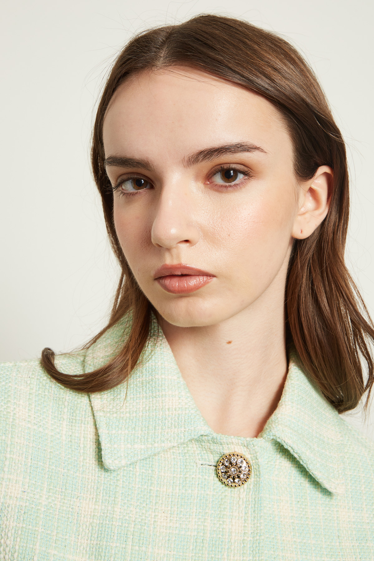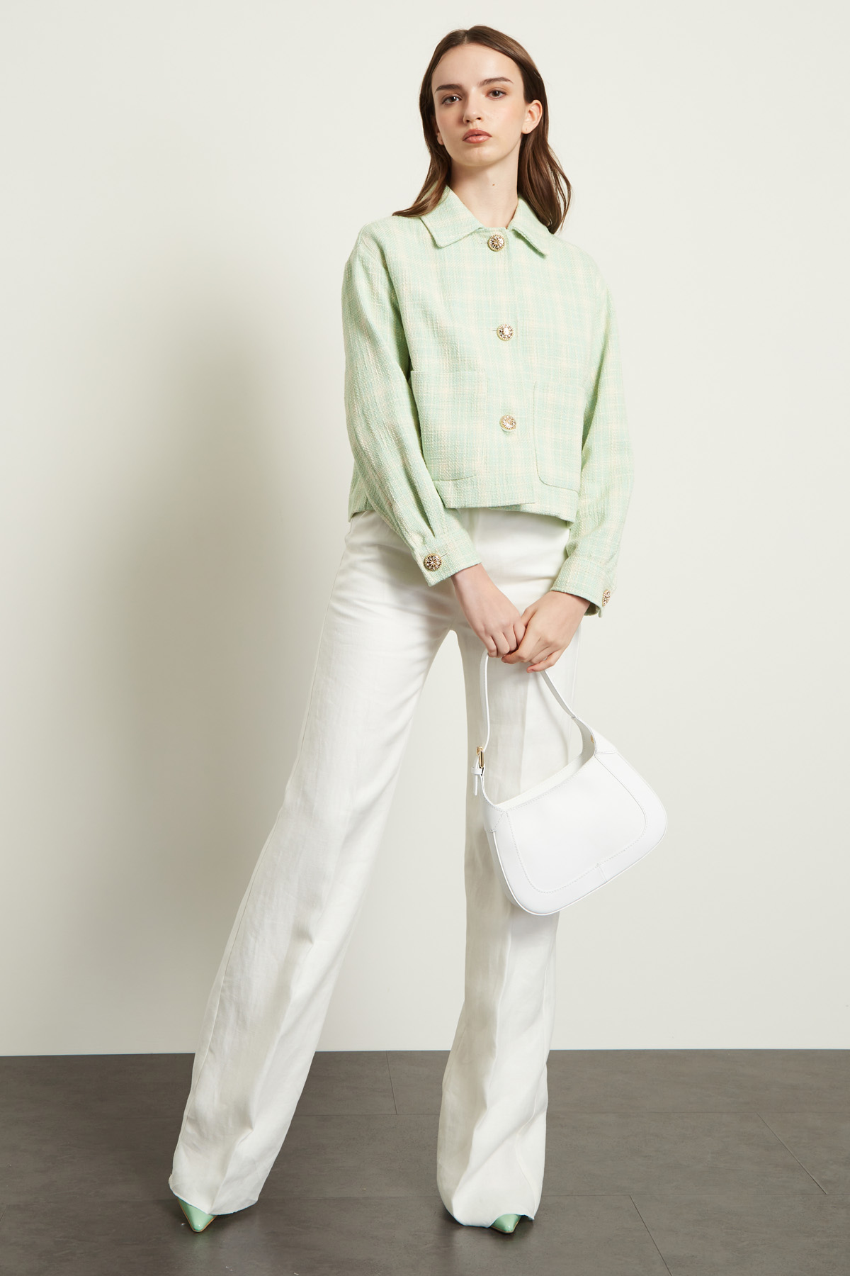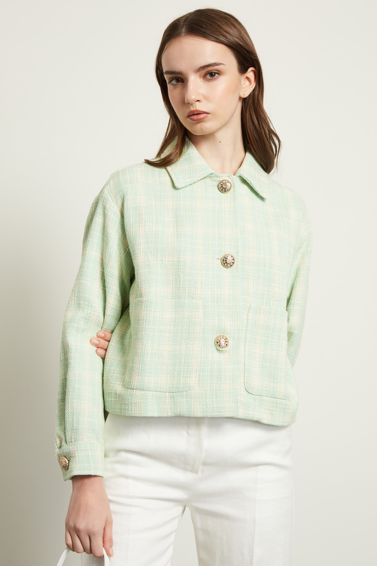 Giacca dalla linea dritta realizzata in stuoia di misto cotone e viscosa, con collo a camicia, maniche lunghe dal giro leggermente sceso e polsino sul fondo con bottone, tasche applicate. Allacciatura tramite bottoni gioiello. Sfoderato.