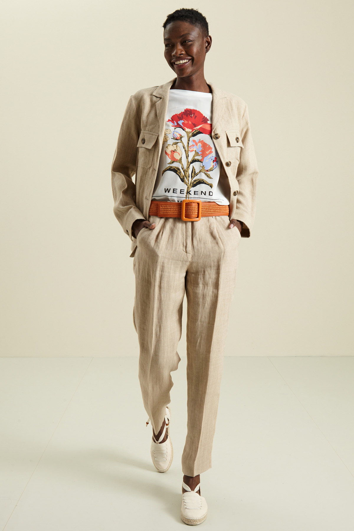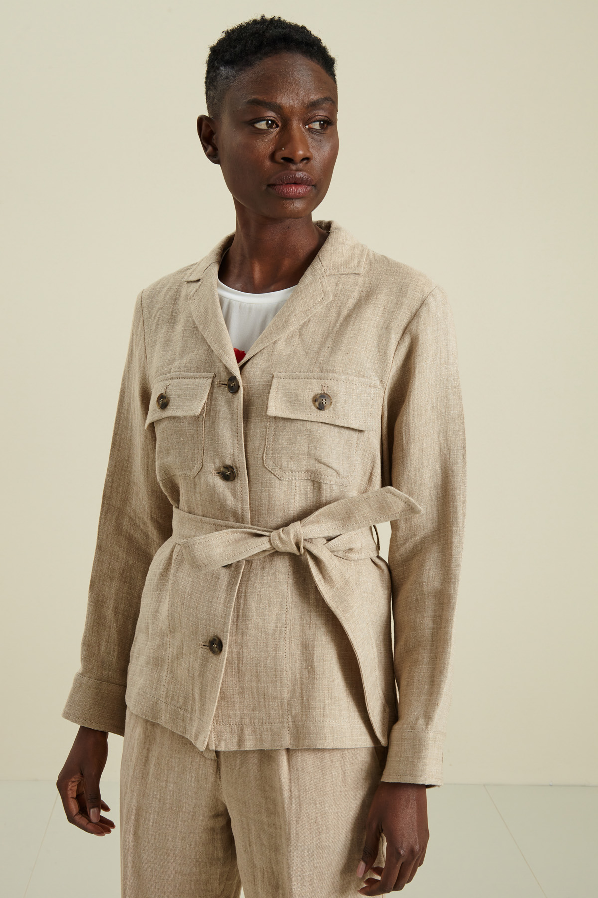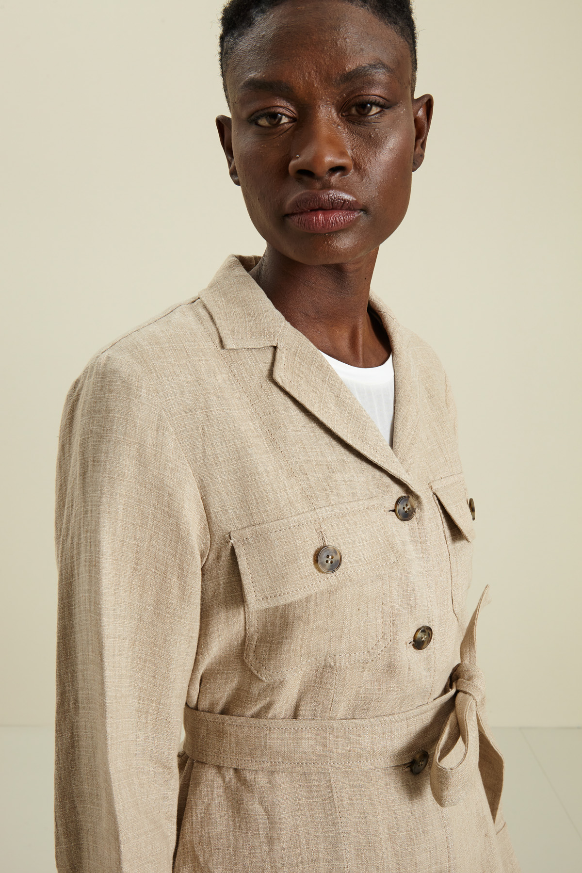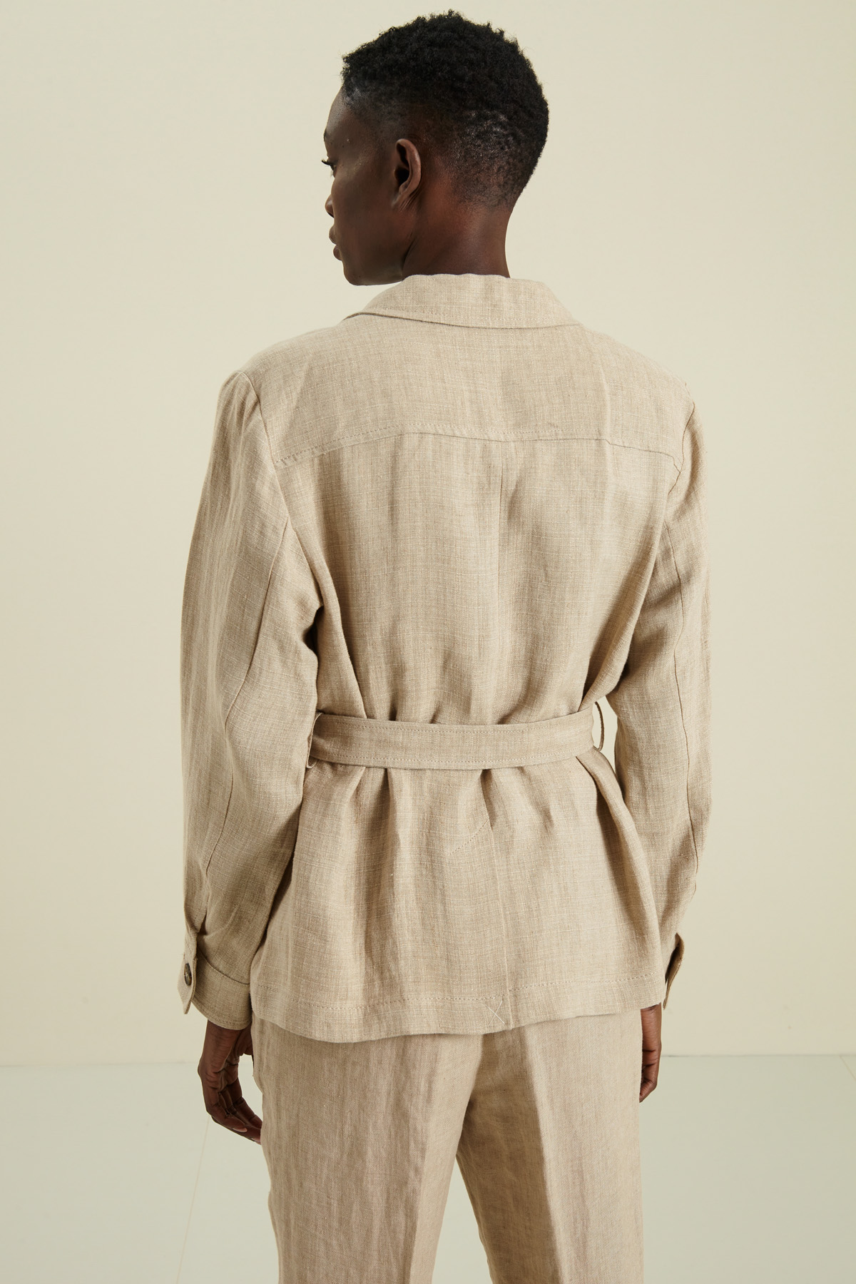 Giacca stile sahariana realizzata in stuoia di puro lino, con rever, maniche dal giro leggermente sceso, tasche applicate con patta davanti, passanti in vita, spacco centrale al fondo dietro e chiusura a bottoni. Capo sfoderato, dotato di cintura coordinata.
