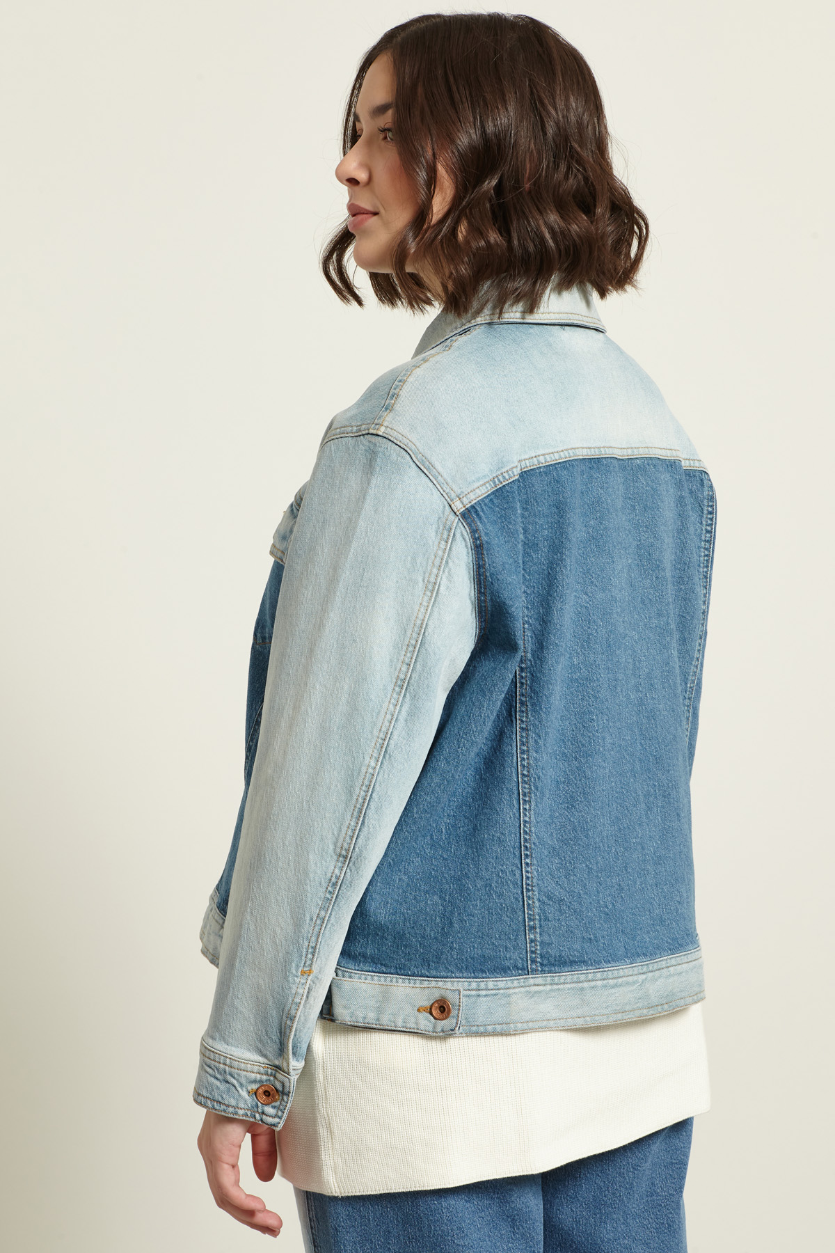 Giacca dalla linea dritta realizzata in denim di misto cotone stretch, con colletto a camicia, maniche lunghe con polsini e bottone, tasche applicate con patta sul petto e a filetto sul davanti. Allacciatura tramite bottoni in metallo. Sfoderato.