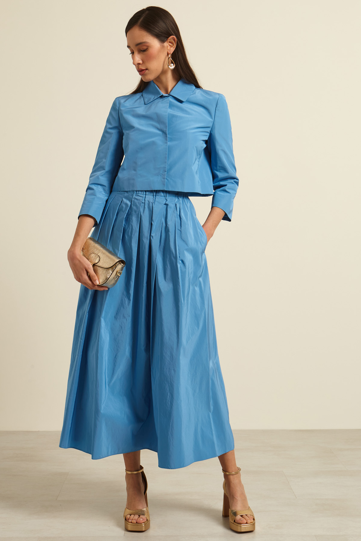 Giacca corta dalla linea dritta realizzata in taffetà di misto cotone, con colletto a camicia e maniche lunghe. Allacciatura nascosta tramite bottoni automatici. Foderata.