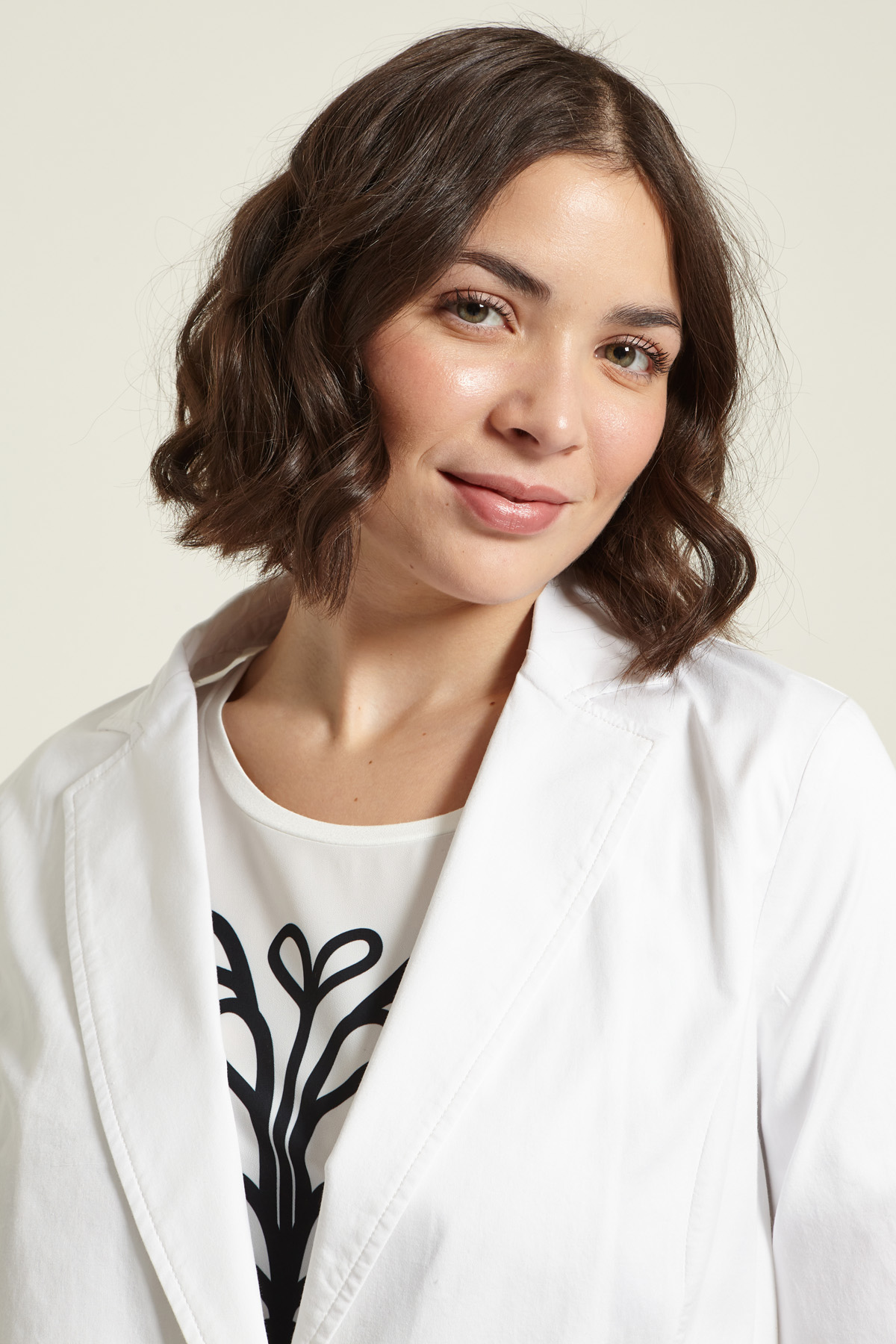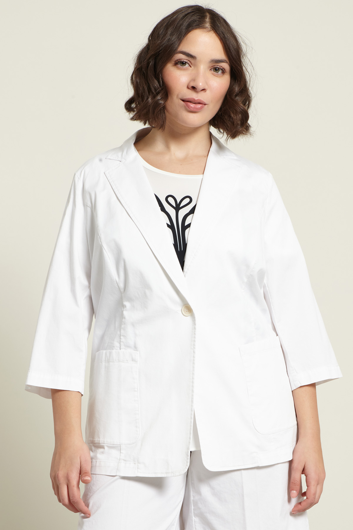 Blazer dalla linea dritta realizzato in levantina di cotone stretch, con collo a rever, maniche tre quarti, tasche applicate sul davanti e spacco nel retro. Allacciatura monopetto tramite bottone. Sfoderato.