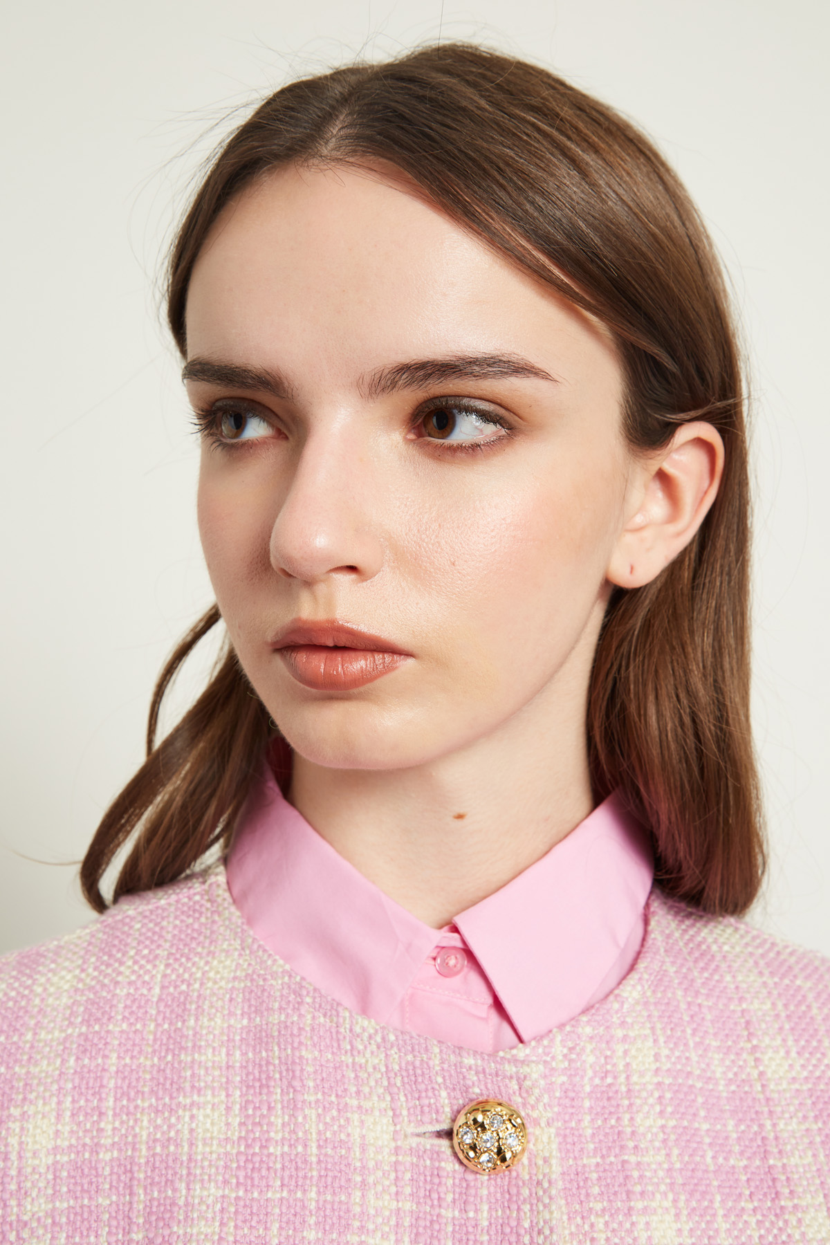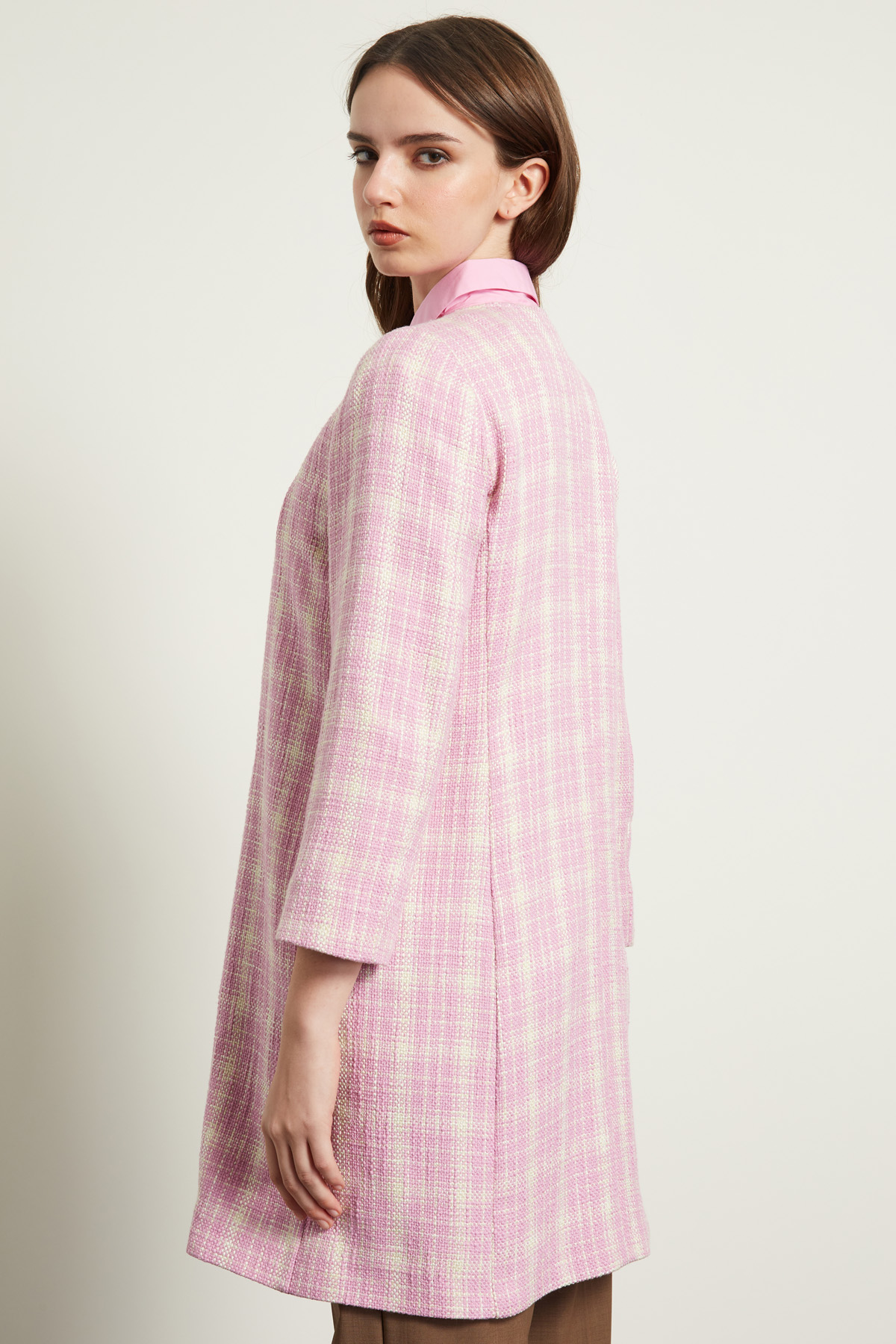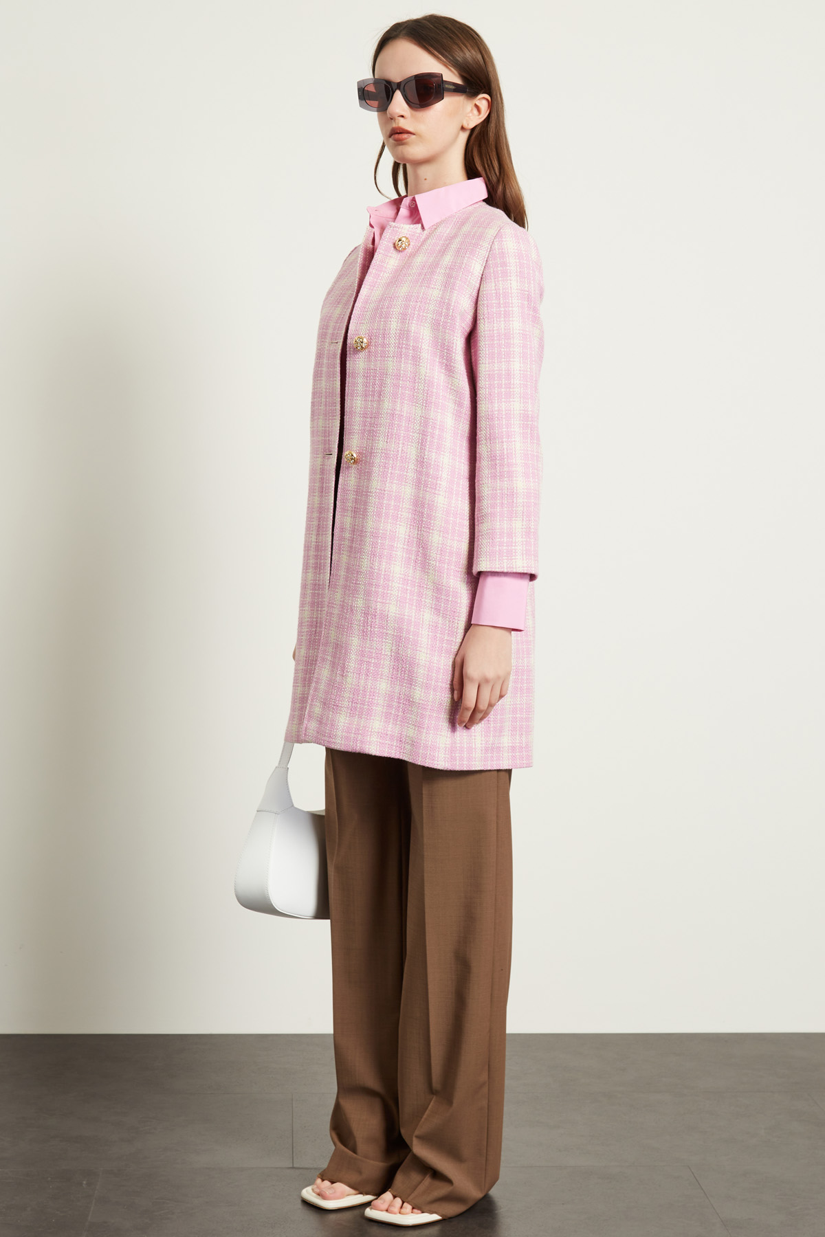 Giacca dalla linea dritta realizzata in stuoia di misto cotone e viscosa, con scollo a giro, maniche lunghe, tasche laterali inserite in cucitura. Allacciatura monopetto tramite bottoni gioiello. Sfoderata.