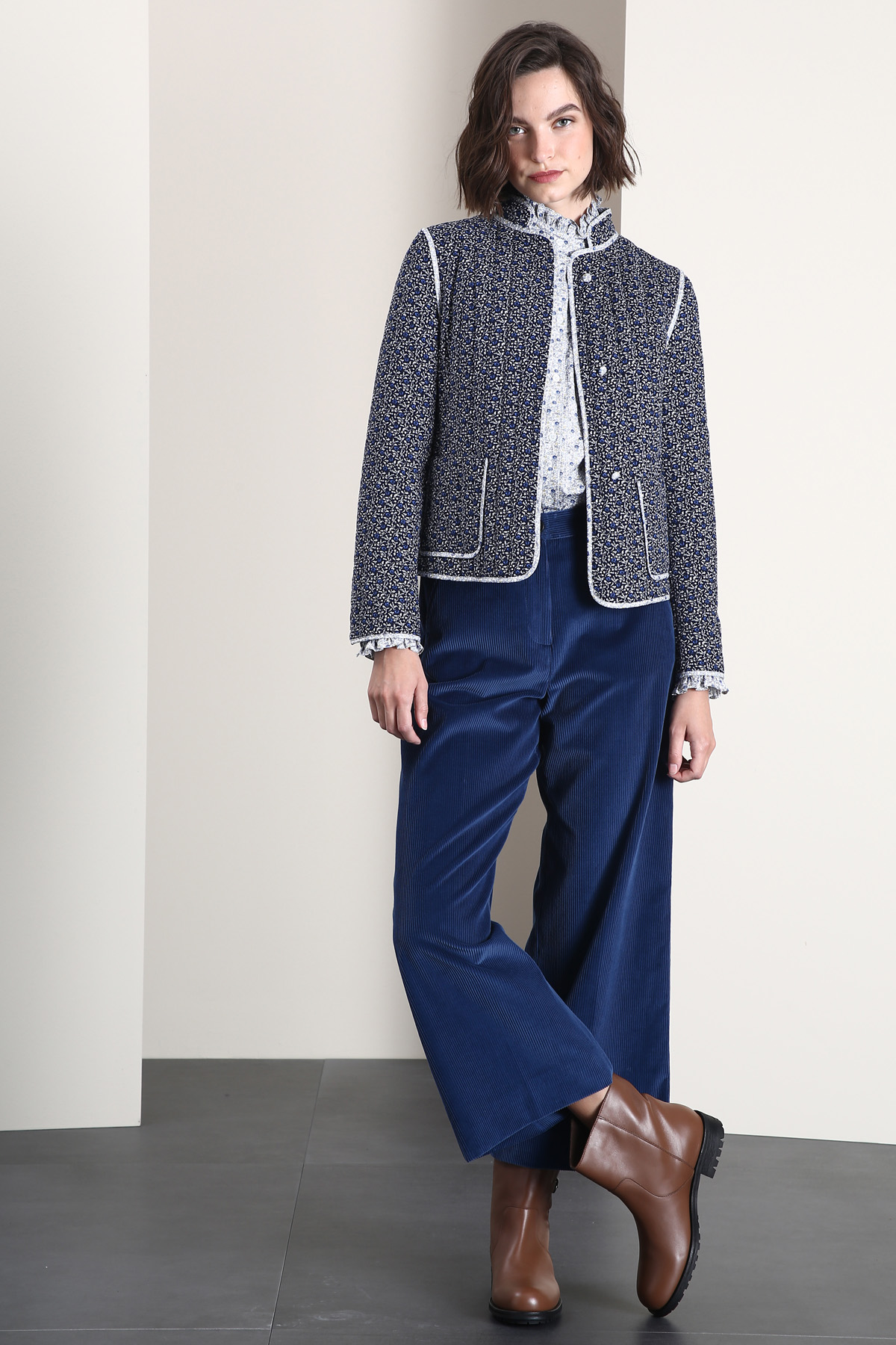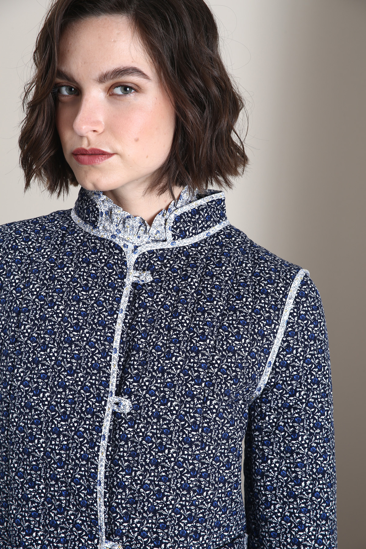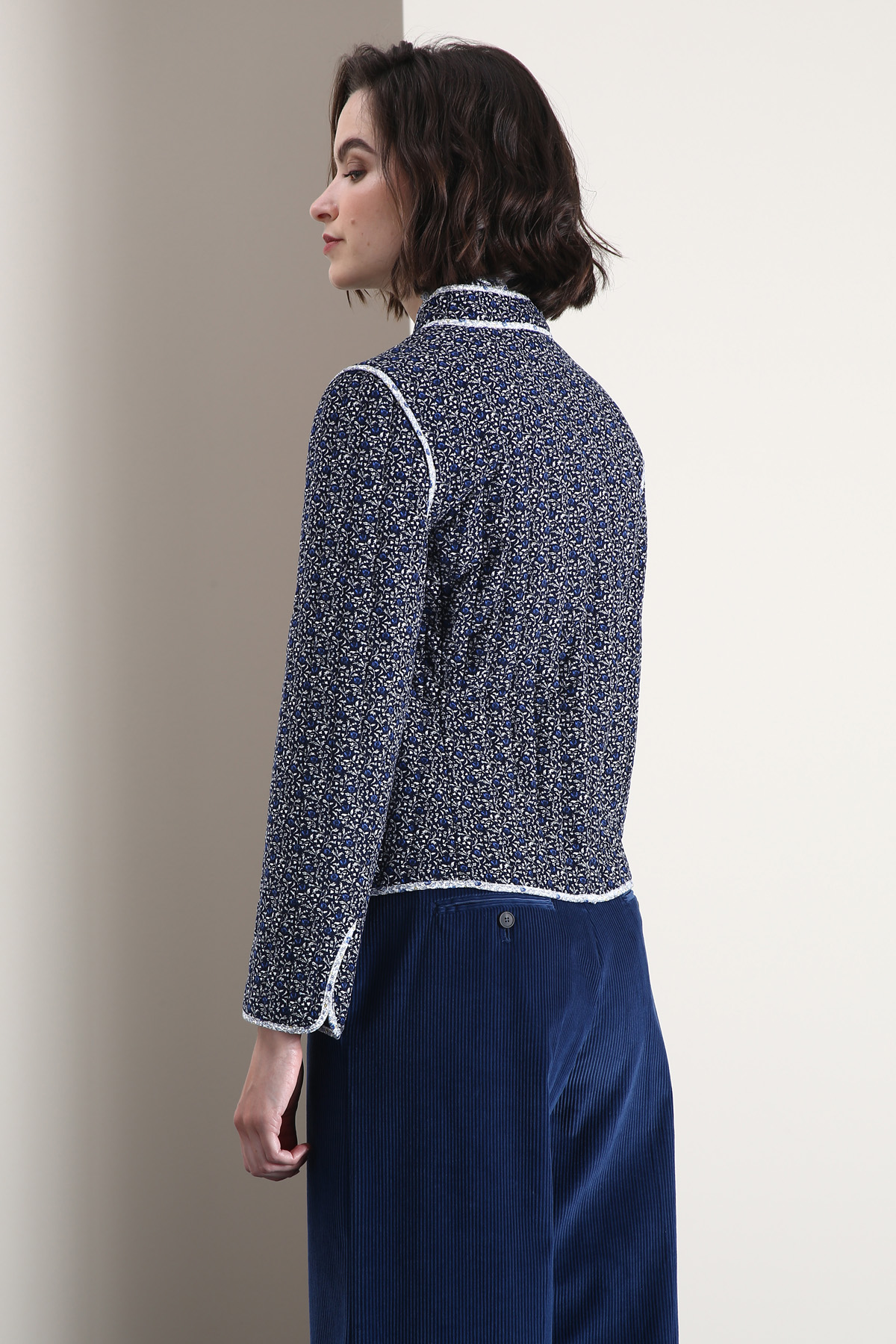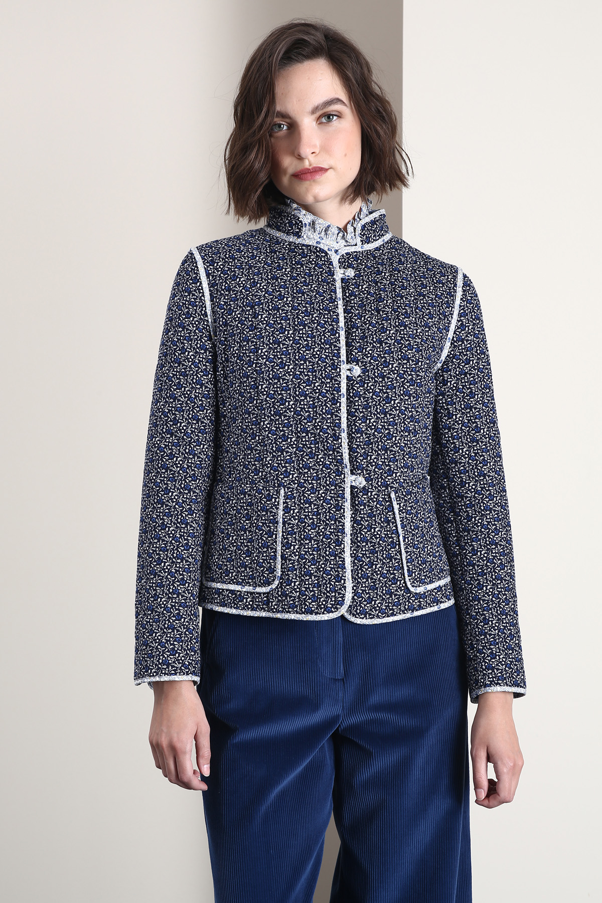 Giacca dalla linea dritta realizzata in velluto di puro cotone stampato, con colletto alla coreana, maniche lunghe, tasche applicate sul davanti e allacciatura tramite bottoni a vista. Interno foderato e imbottito.