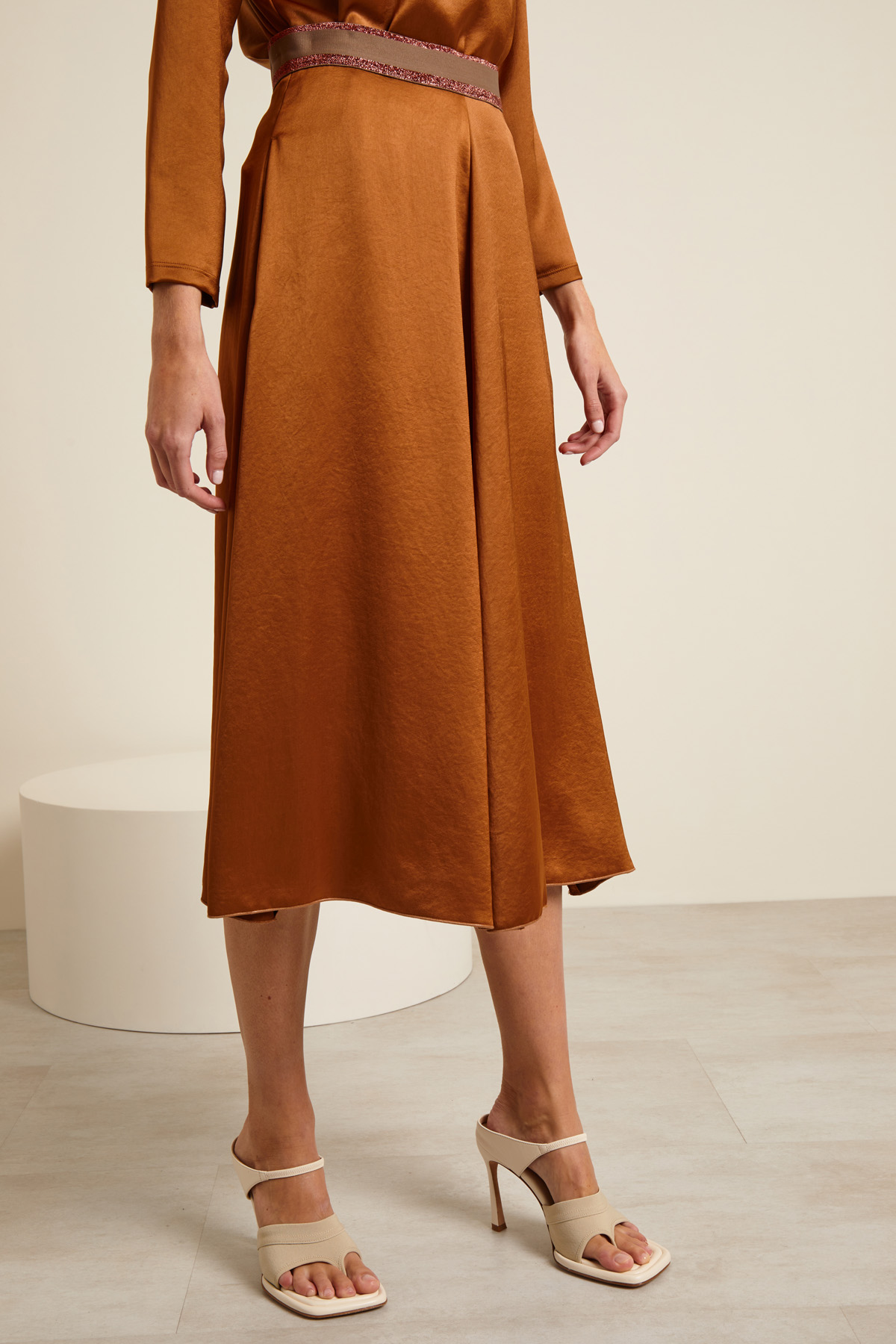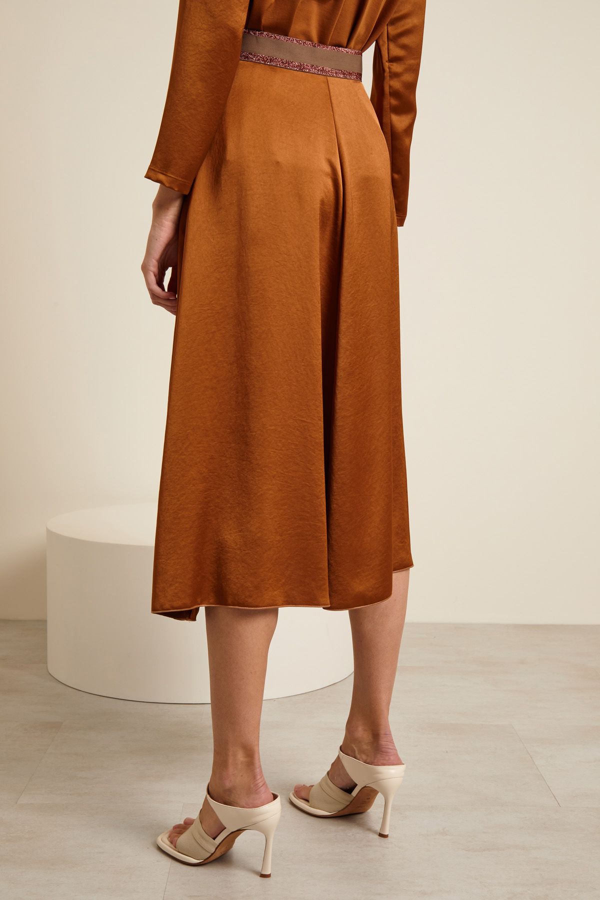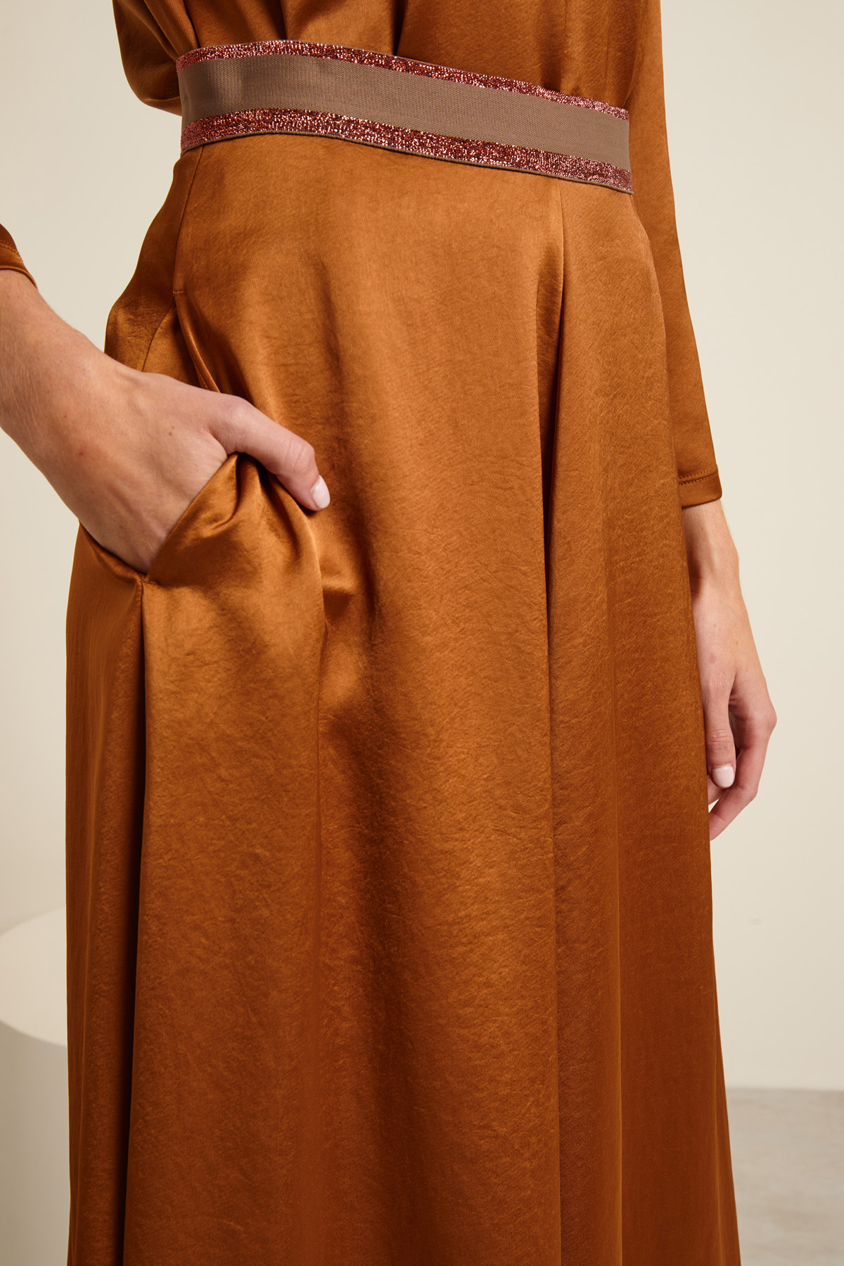 Gonna midi a campana realizzata in raso, con inserto elastico in vita rifinito con dettagli lamè, tasche laterali inserite in cucitura. Allacciatura tramite zip invisibile e bottone sul fianco.